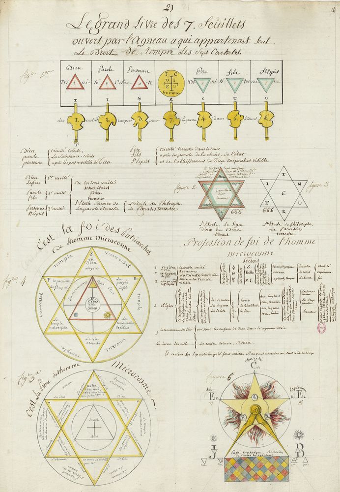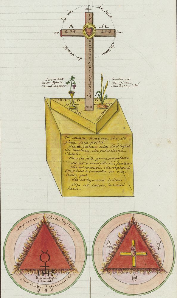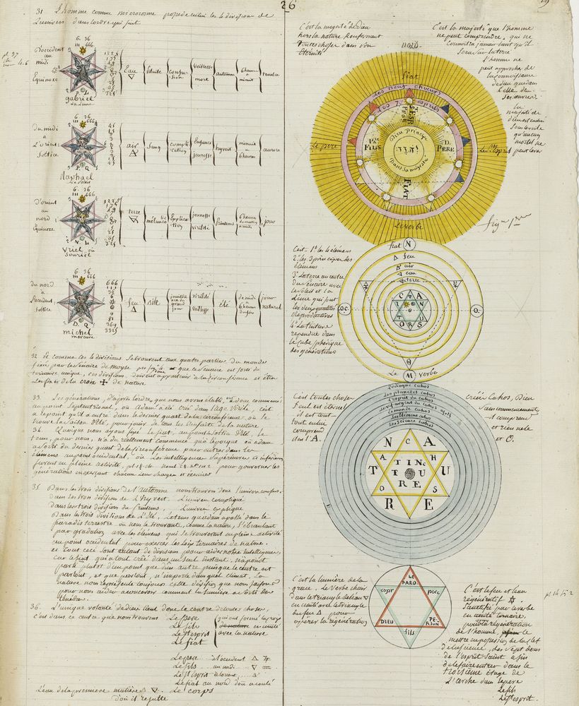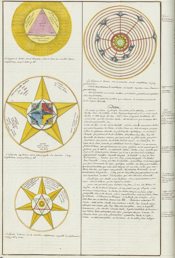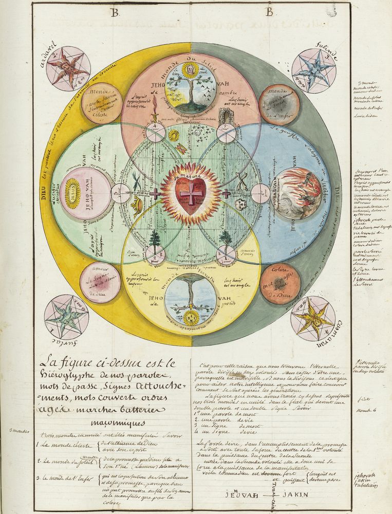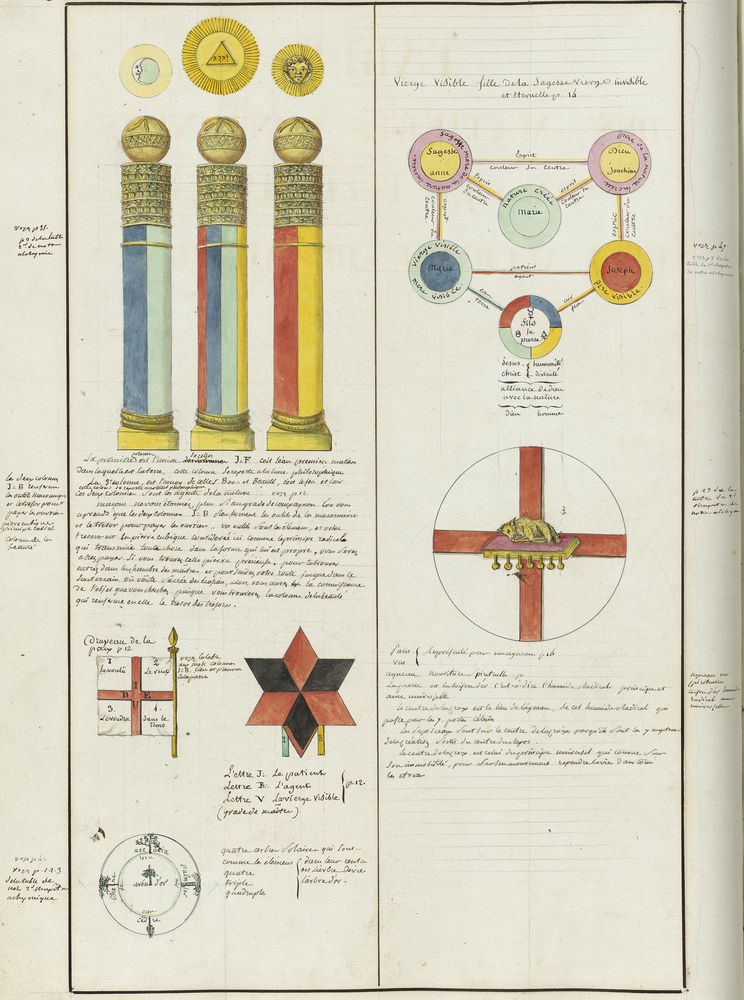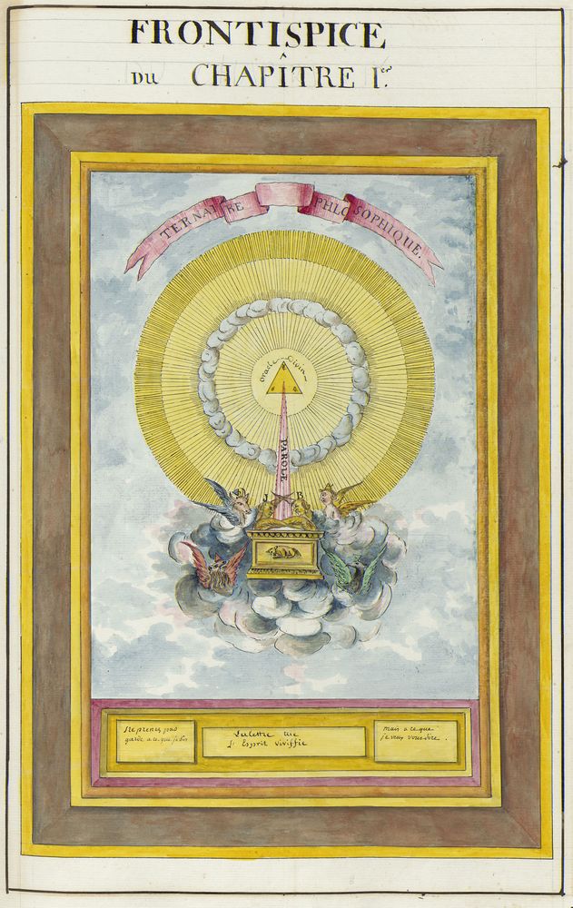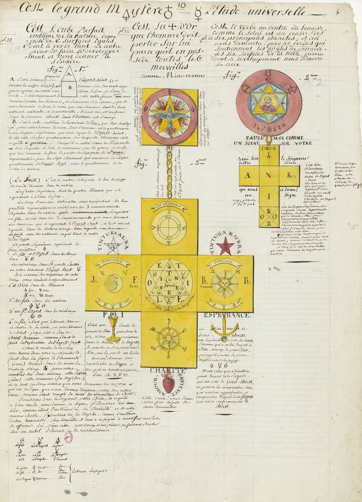 ► Ce manuscrit en trois parties et deux livres est issu d’une maçonnerie chrétienne. Il est comparable à l’Œuvre magico-cabbalistique et théosophique et surtout aux Figures secrètes de la Rose-Croix des XVIe et XVIIe siècles auxquels il emprunte certaines illustrations. Il s’agit certainement de l’un des plus beaux manuscrits ésotériques français où le texte est au service des images.