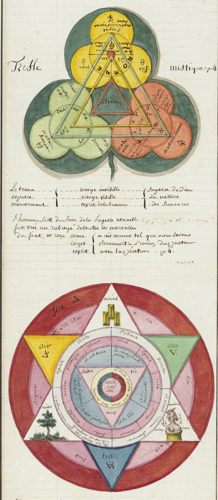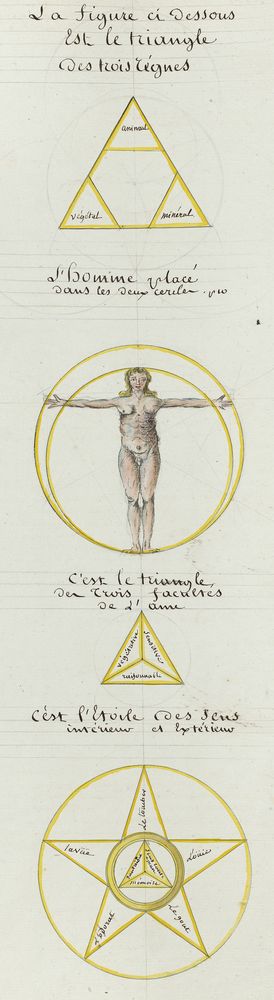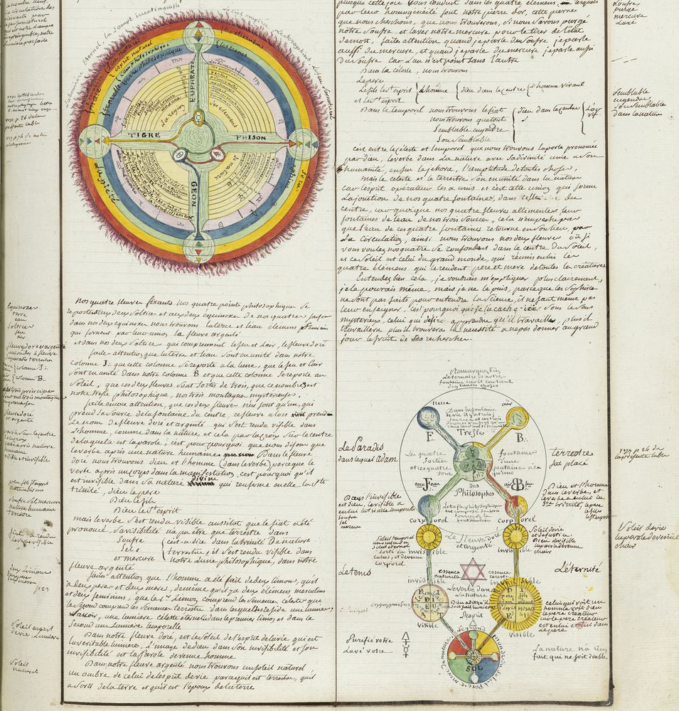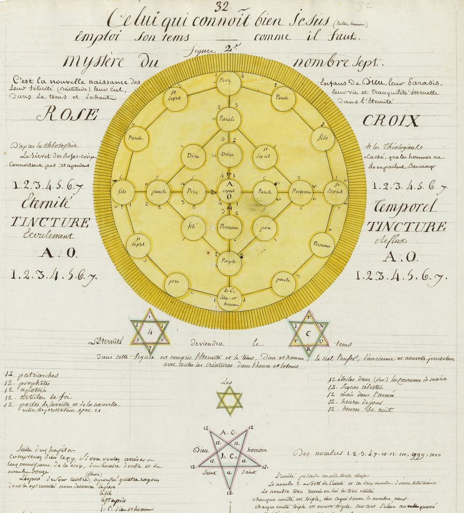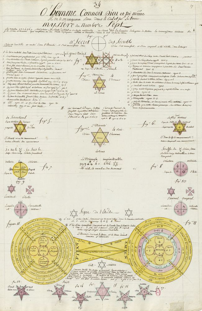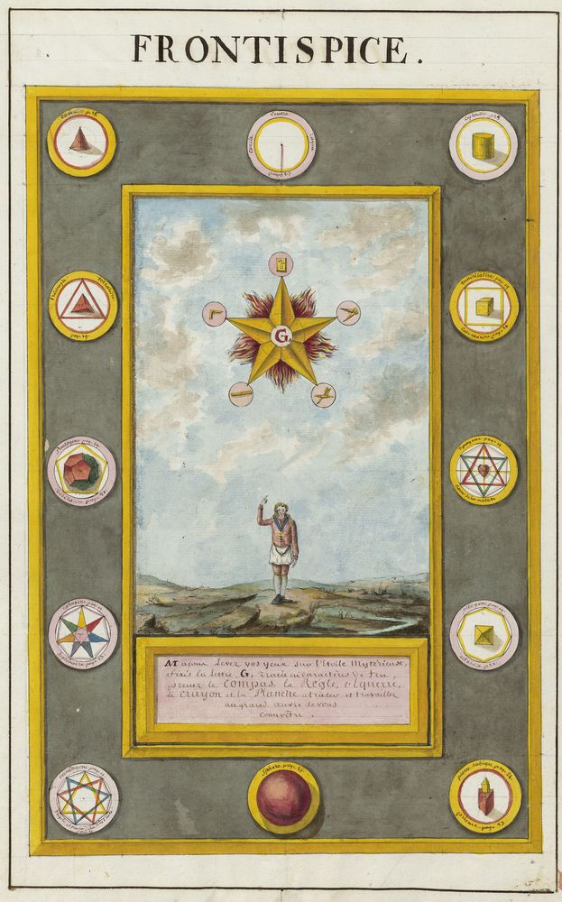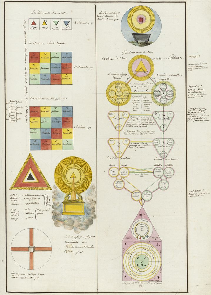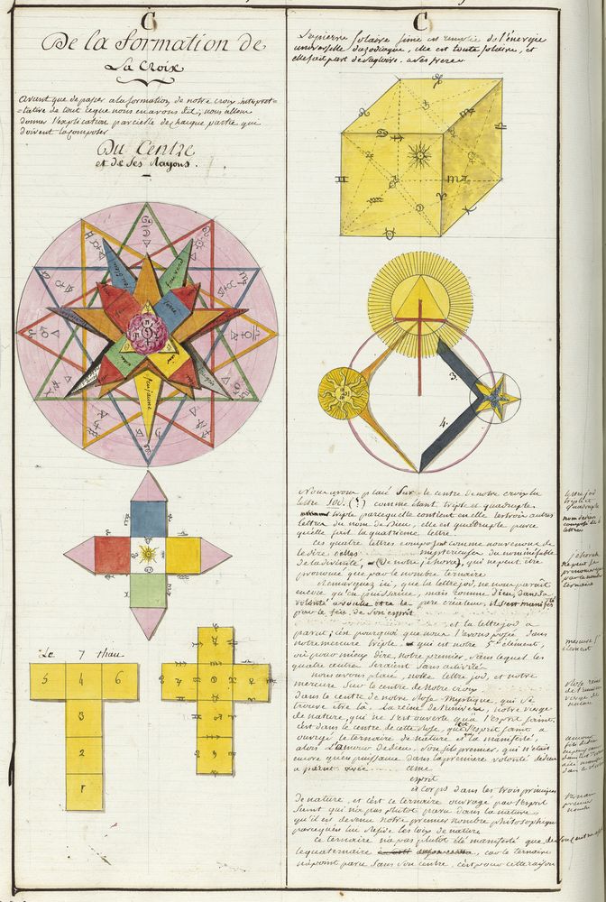 ► Ce manuscrit en trois parties et deux livres est issu d’une maçonnerie chrétienne. Il est comparable à l’Œuvre magico-cabbalistique et théosophique et surtout aux Figures secrètes de la Rose-Croix des XVIe et XVIIe siècles auxquels il emprunte certaines illustrations. Il s’agit certainement de l’un des plus beaux manuscrits ésotériques français où le texte est au service des images.