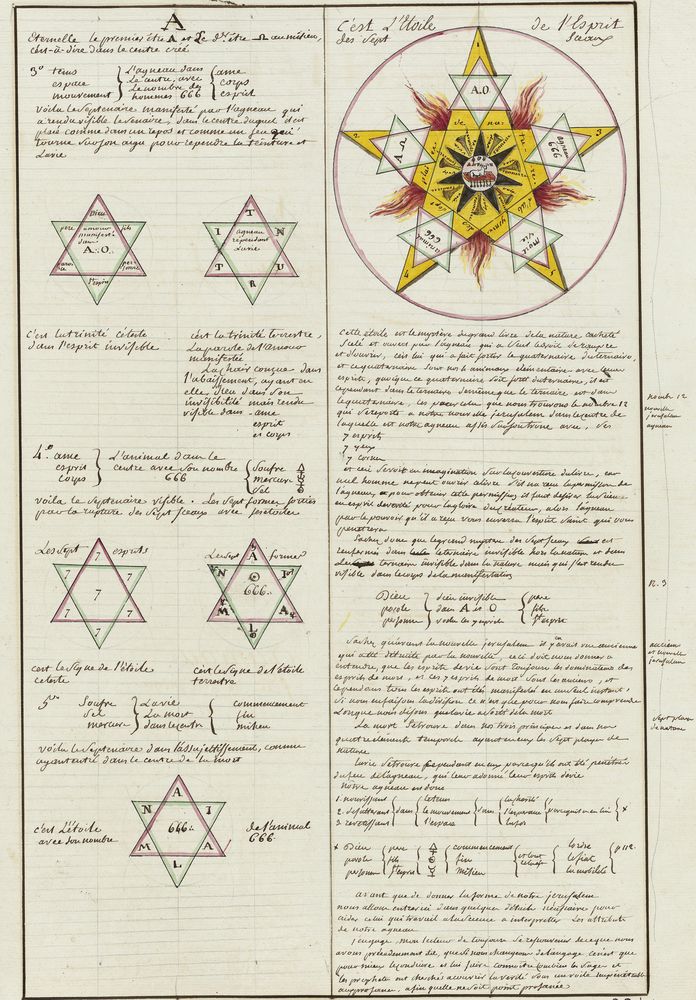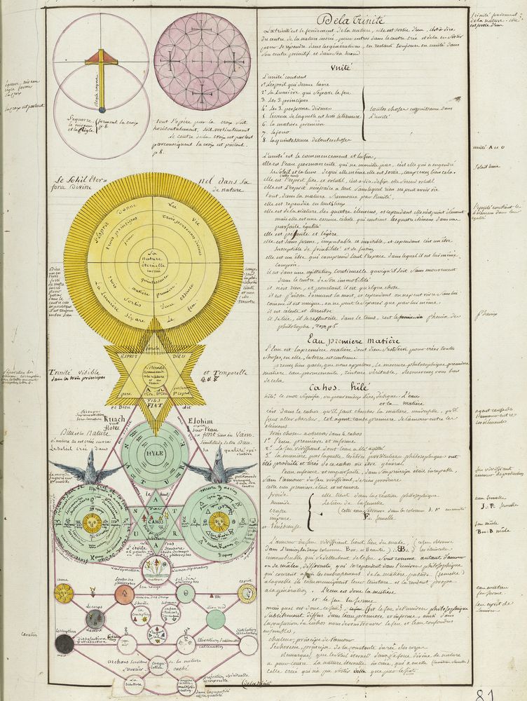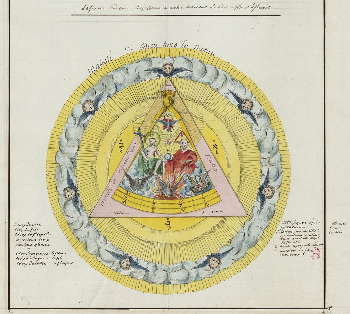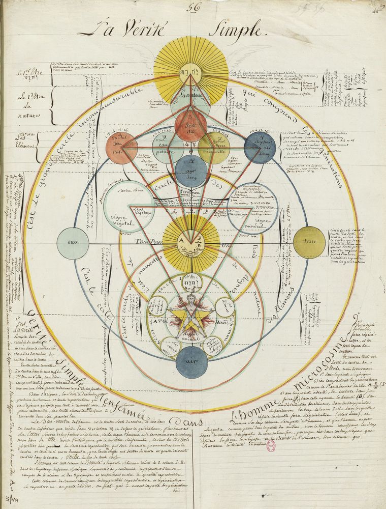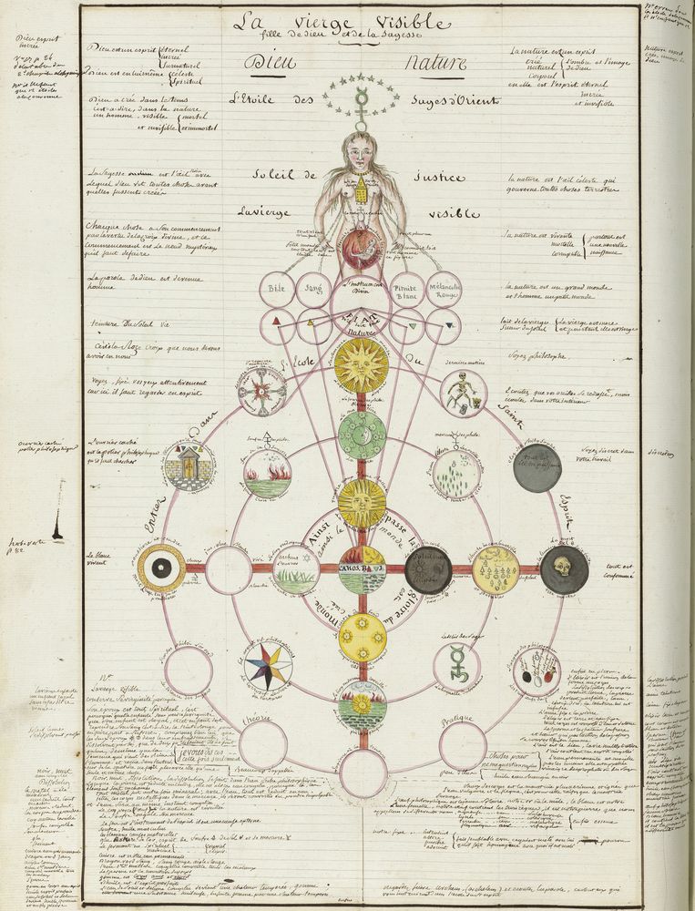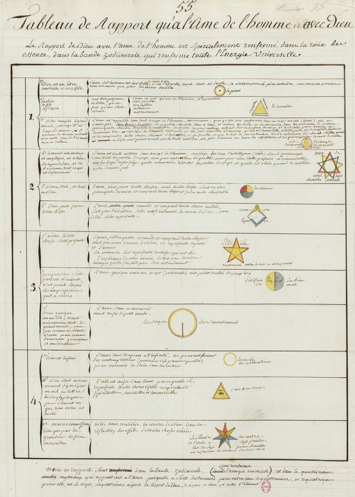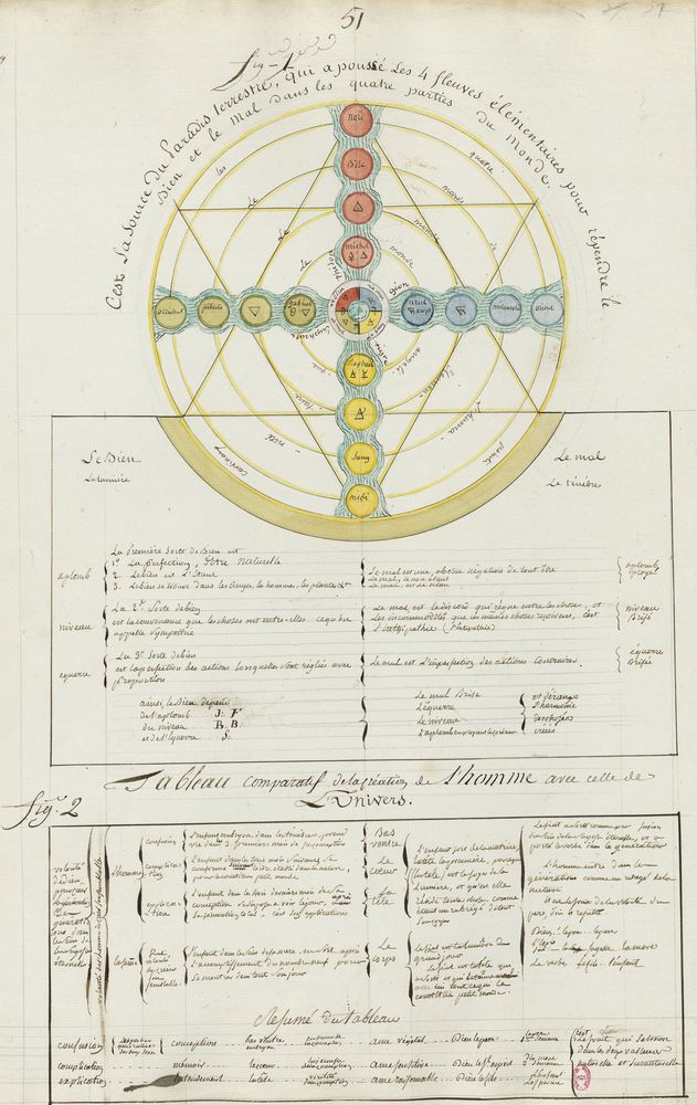 ► Ce manuscrit en trois parties et deux livres est issu d’une maçonnerie chrétienne. Il est comparable à l’Œuvre magico-cabbalistique et théosophique et surtout aux Figures secrètes de la Rose-Croix des XVIe et XVIIe siècles auxquels il emprunte certaines illustrations. Il s’agit certainement de l’un des plus beaux manuscrits ésotériques français où le texte est au service des images.