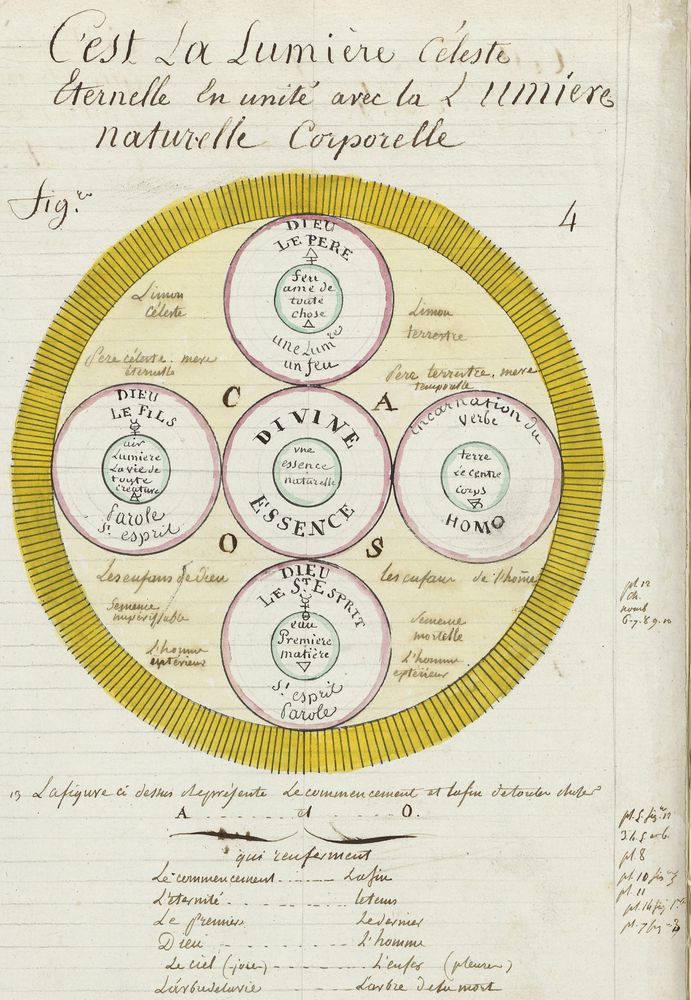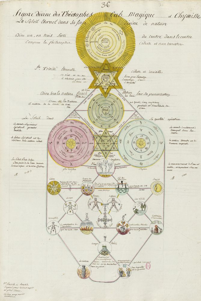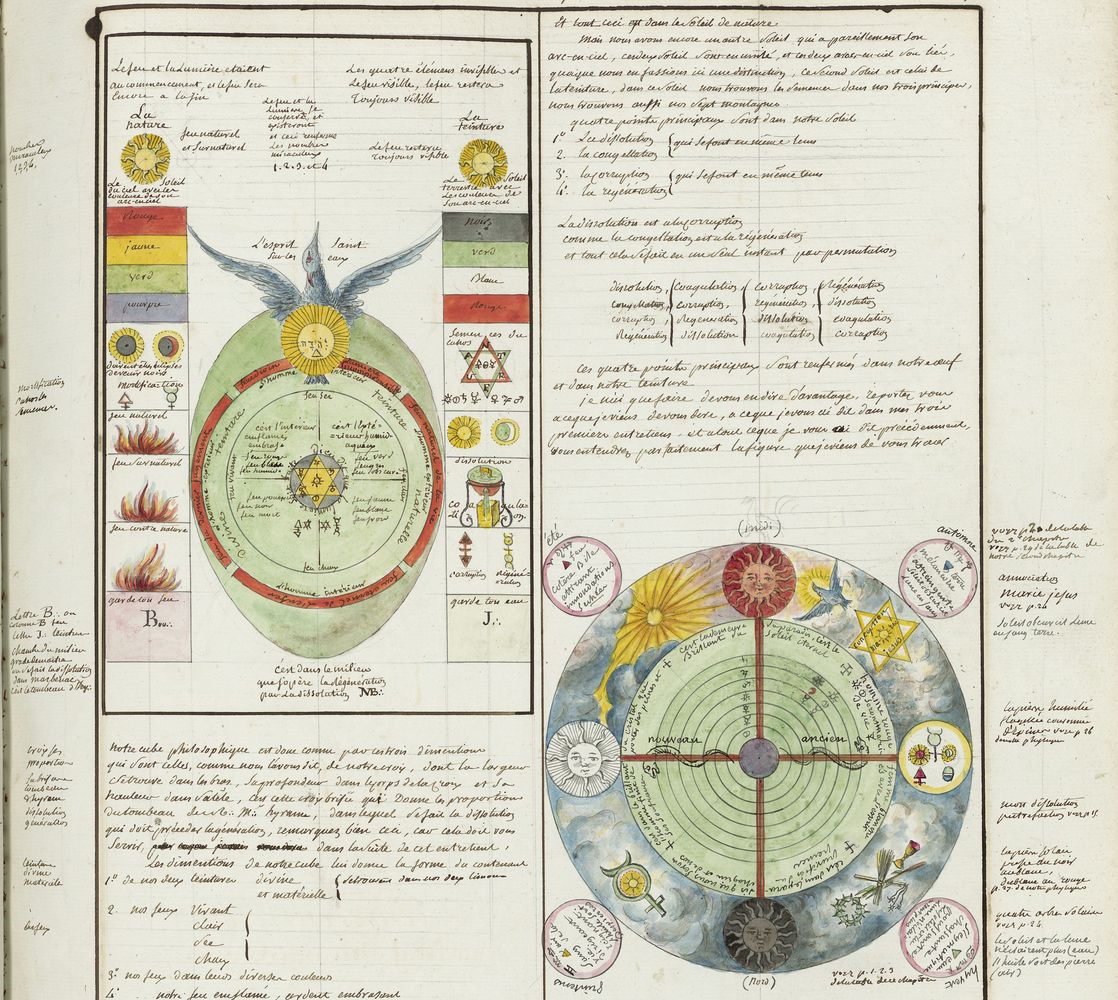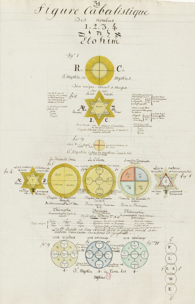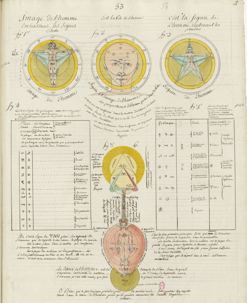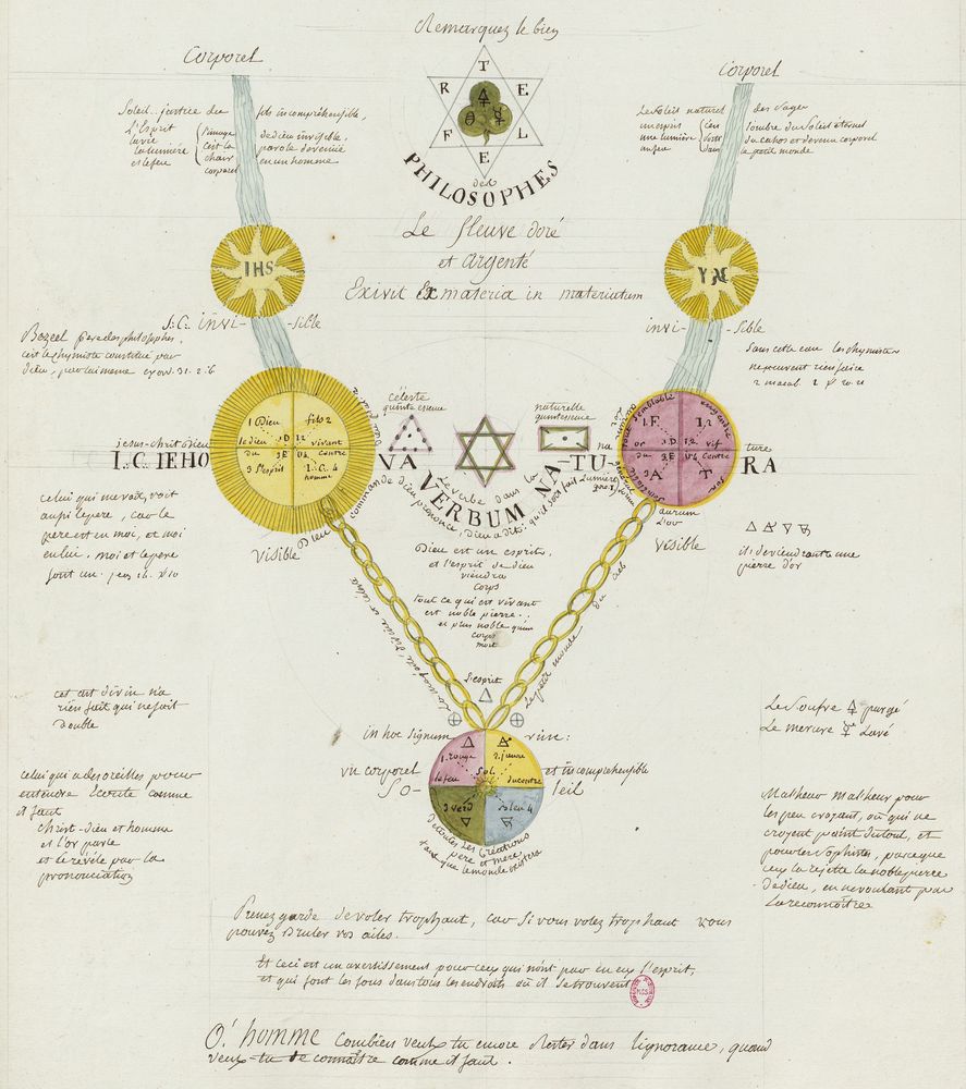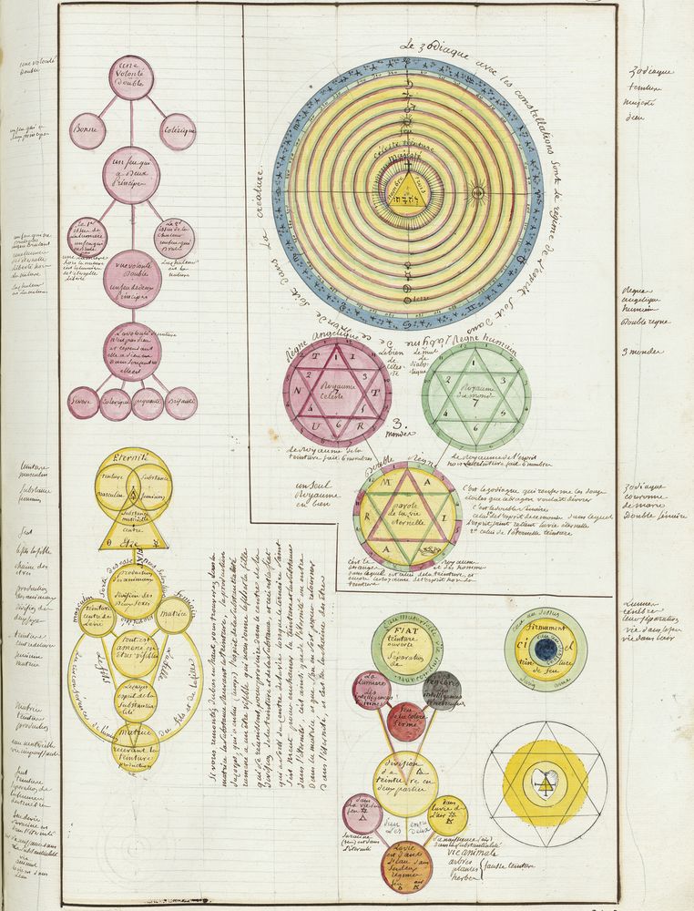 ► Ce manuscrit en trois parties et deux livres est issu d’une maçonnerie chrétienne. Il est comparable à l’Œuvre magico-cabbalistique et théosophique et surtout aux Figures secrètes de la Rose-Croix des XVIe et XVIIe siècles auxquels il emprunte certaines illustrations. Il s’agit certainement de l’un des plus beaux manuscrits ésotériques français où le texte est au service des images.