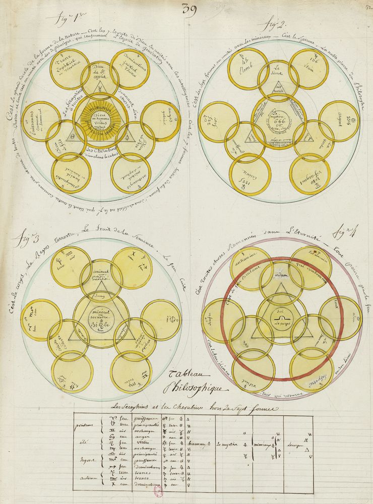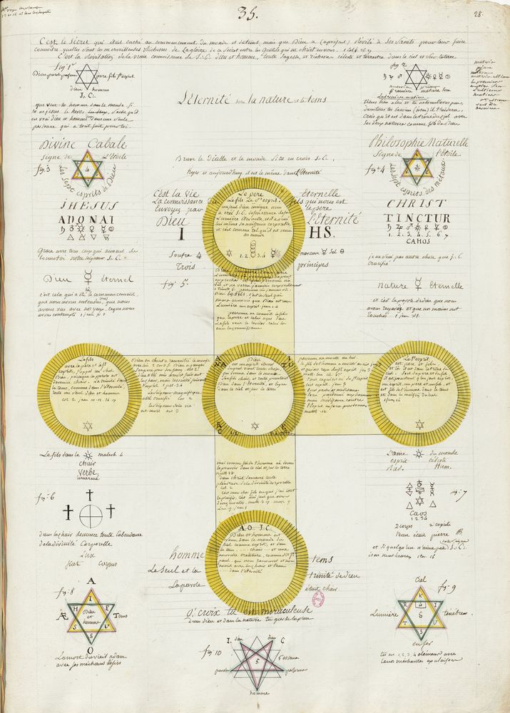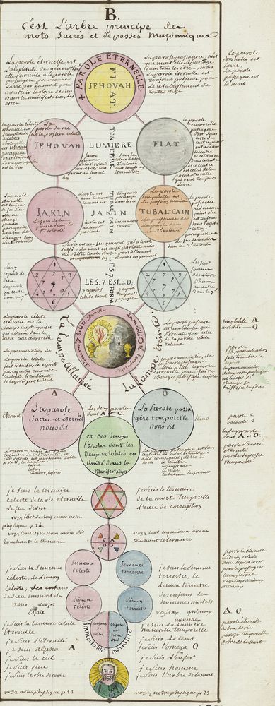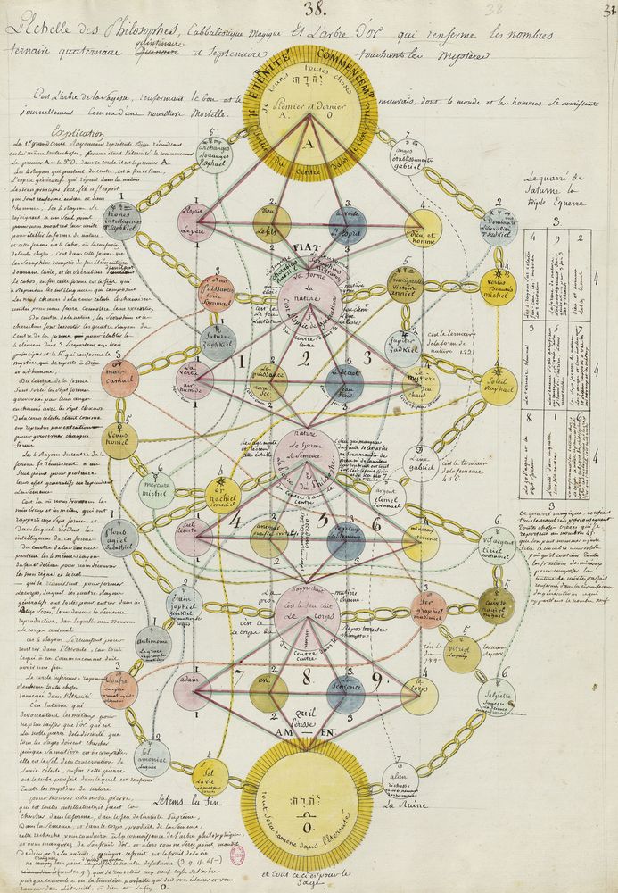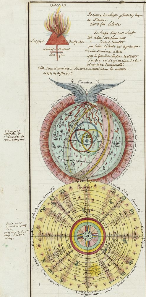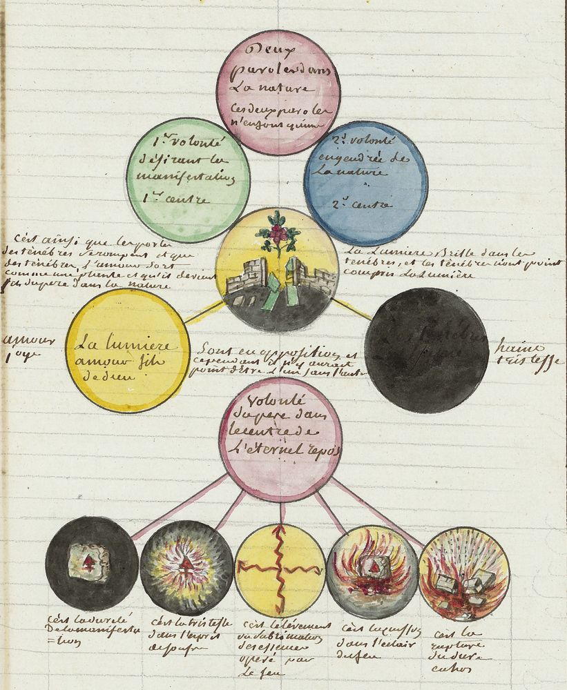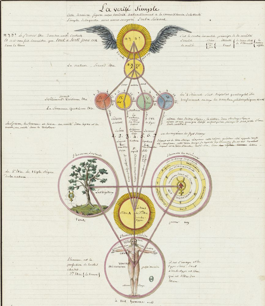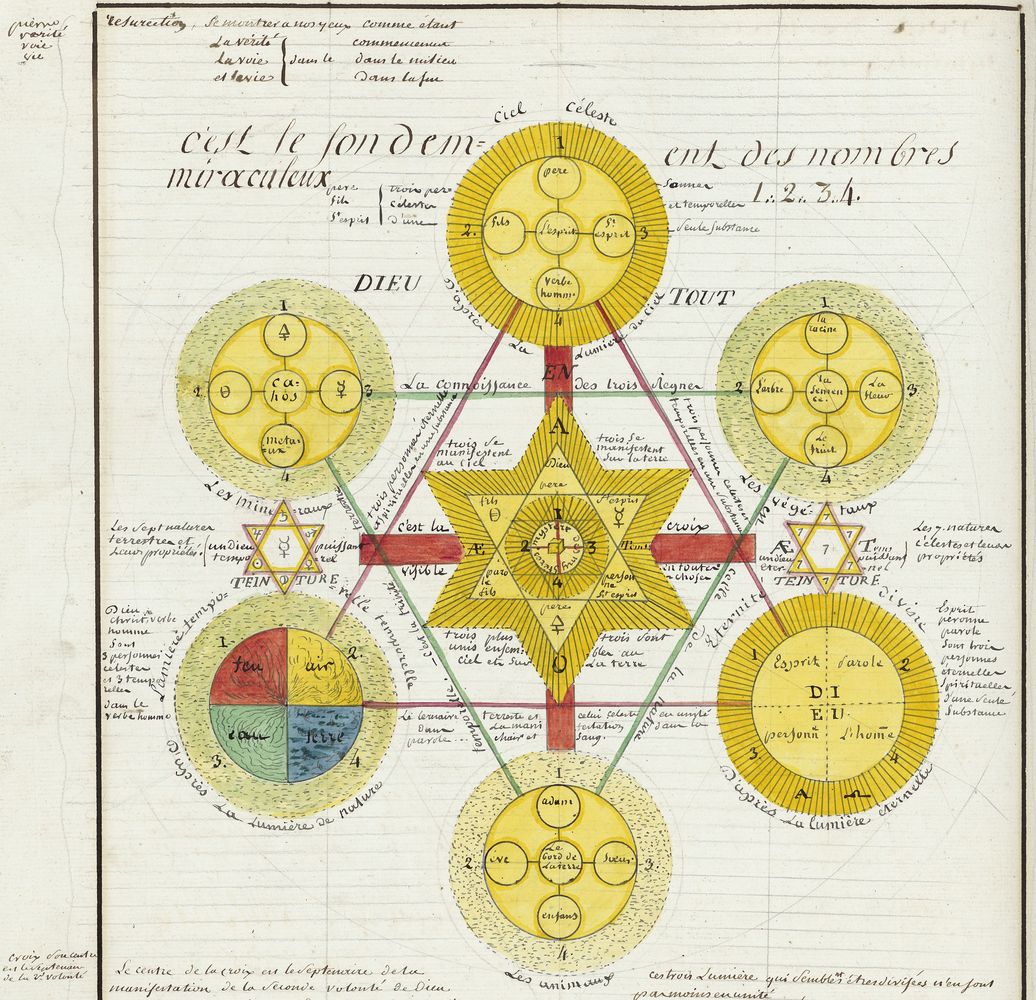 ► Ce manuscrit en trois parties et deux livres est issu d’une maçonnerie chrétienne. Il est comparable à l’Œuvre magico-cabbalistique et théosophique et surtout aux Figures secrètes de la Rose-Croix des XVIe et XVIIe siècles auxquels il emprunte certaines illustrations. Il s’agit certainement de l’un des plus beaux manuscrits ésotériques français où le texte est au service des images.