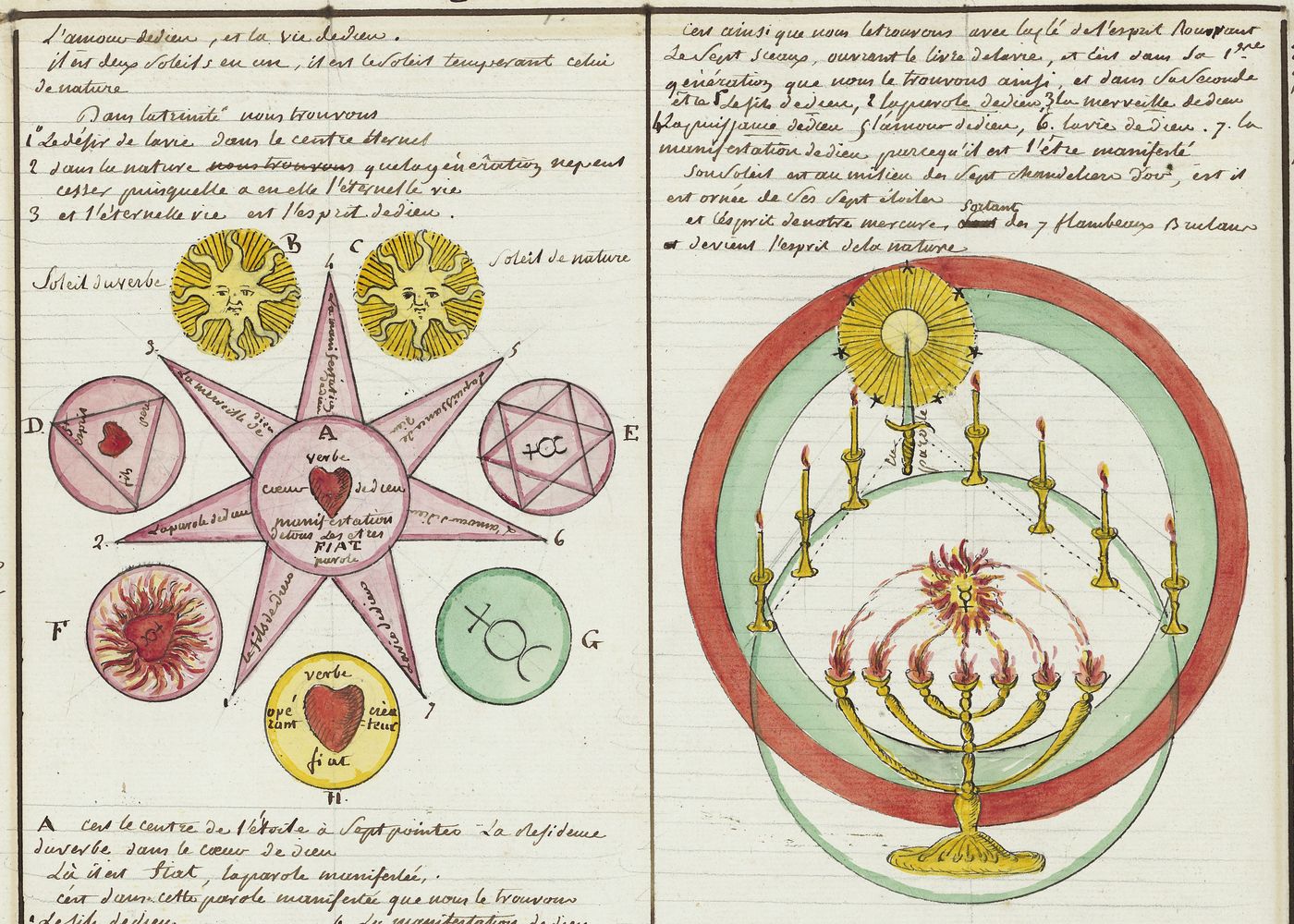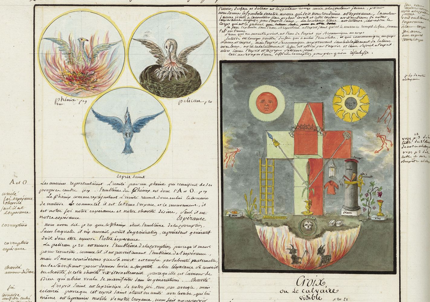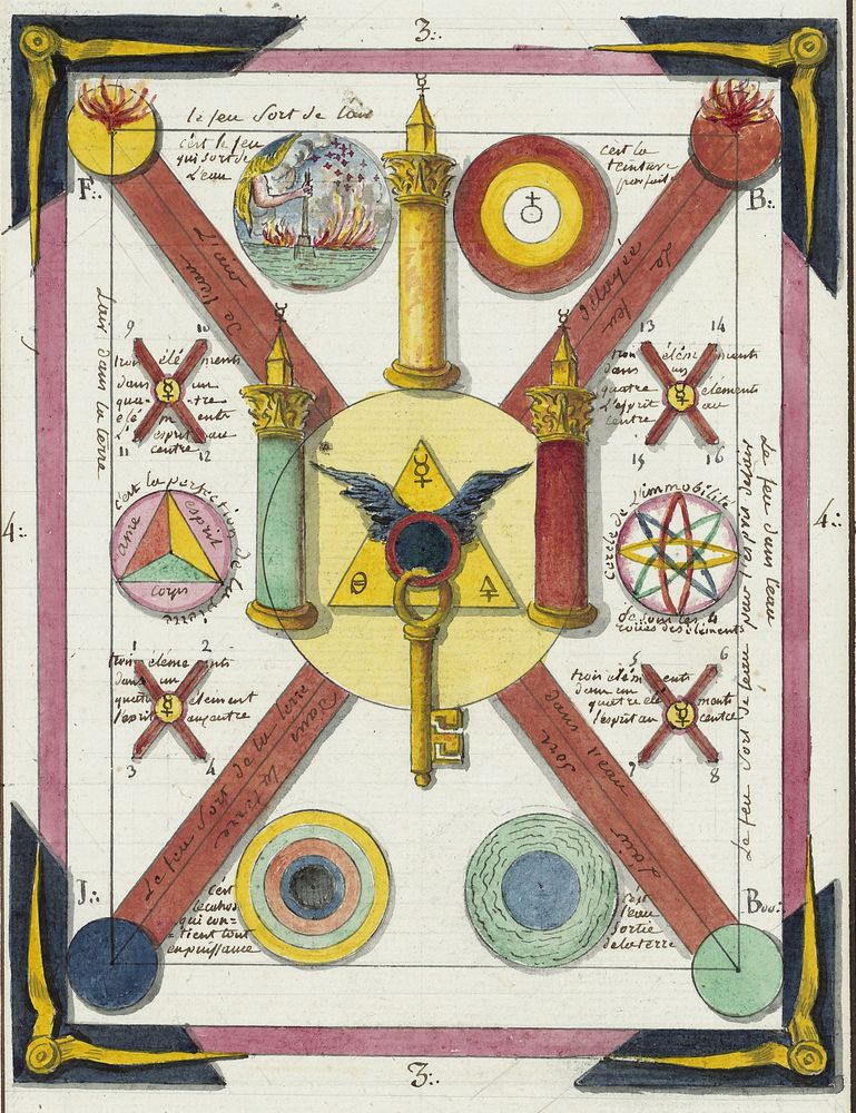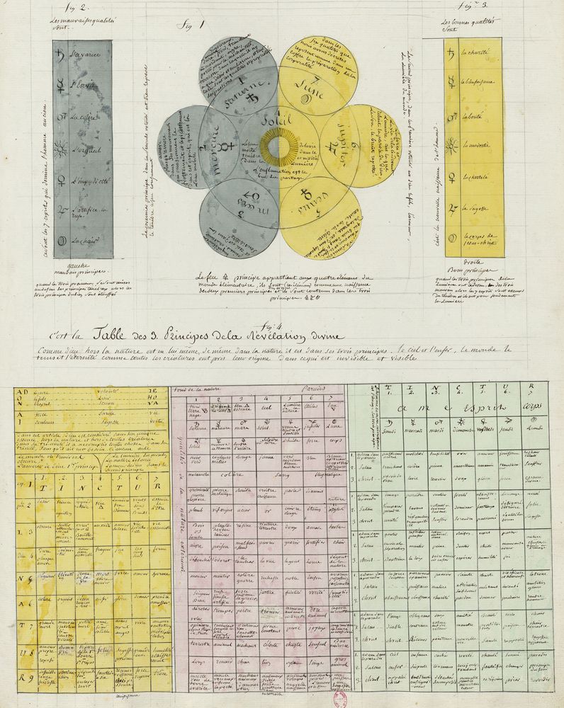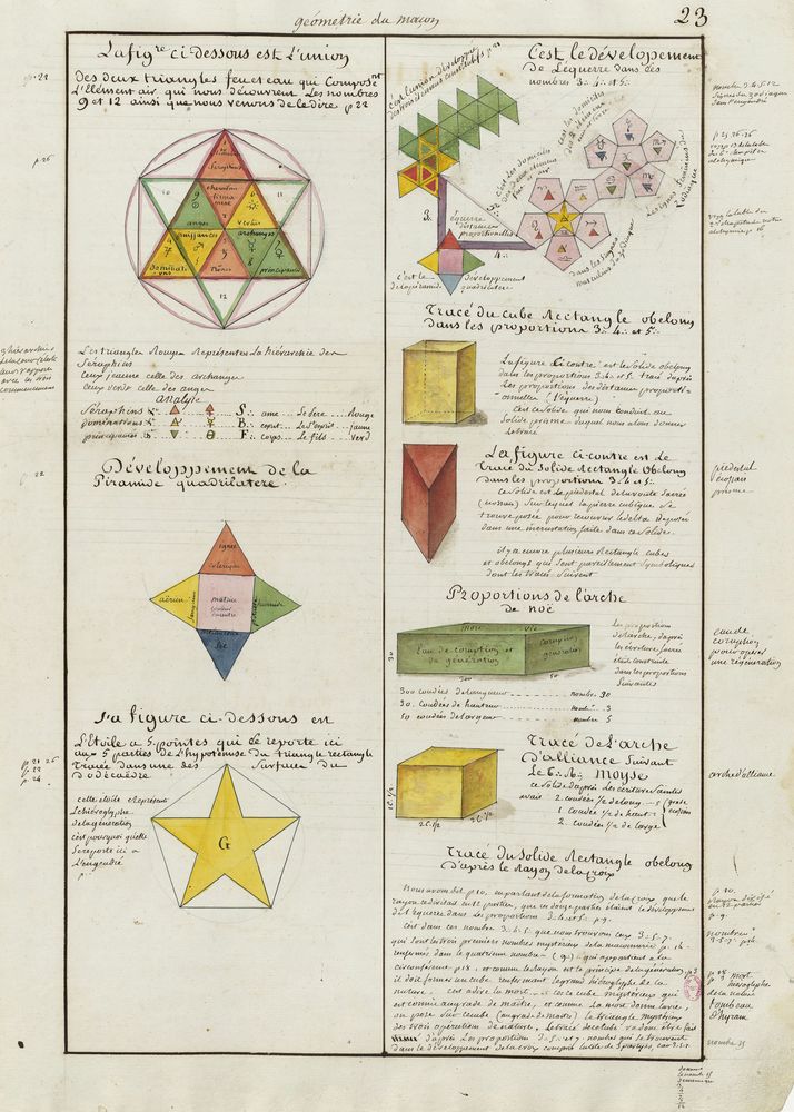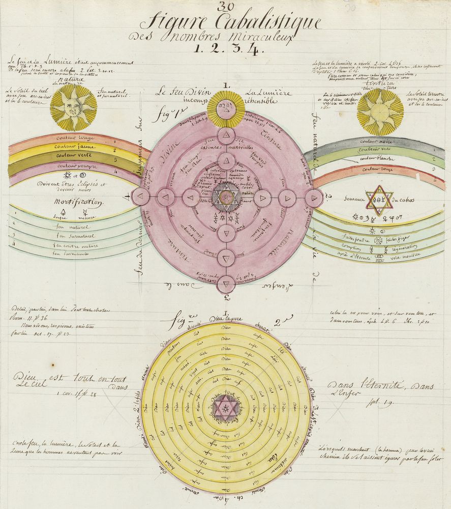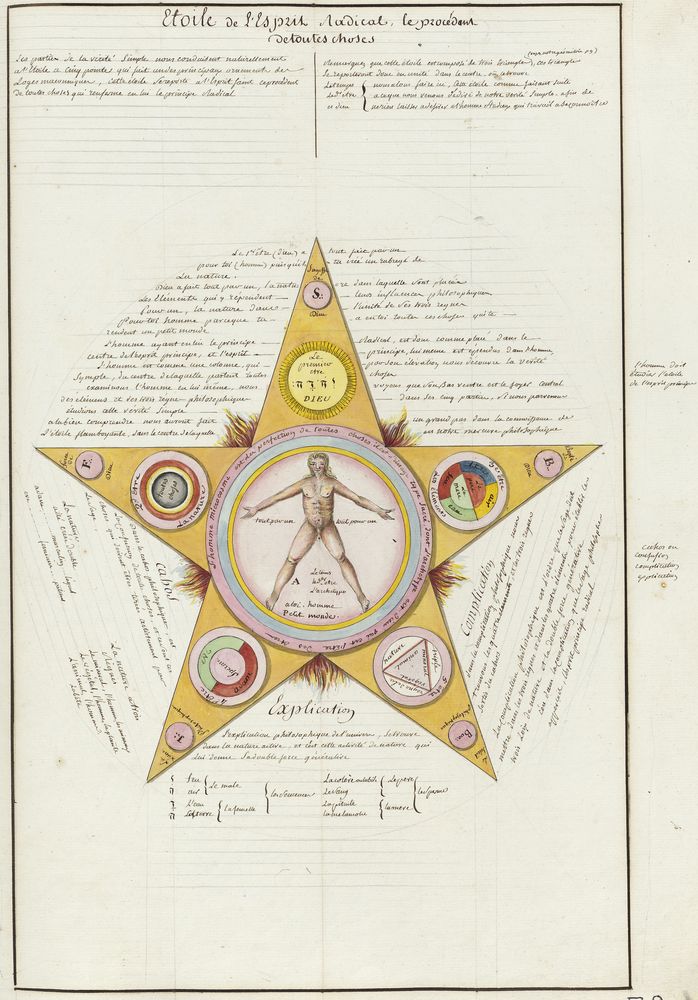 ► Ce manuscrit en trois parties et deux livres est issu d’une maçonnerie chrétienne. Il est comparable à l’Œuvre magico-cabbalistique et théosophique et surtout aux Figures secrètes de la Rose-Croix des XVIe et XVIIe siècles auxquels il emprunte certaines illustrations. Il s’agit certainement de l’un des plus beaux manuscrits ésotériques français où le texte est au service des images.