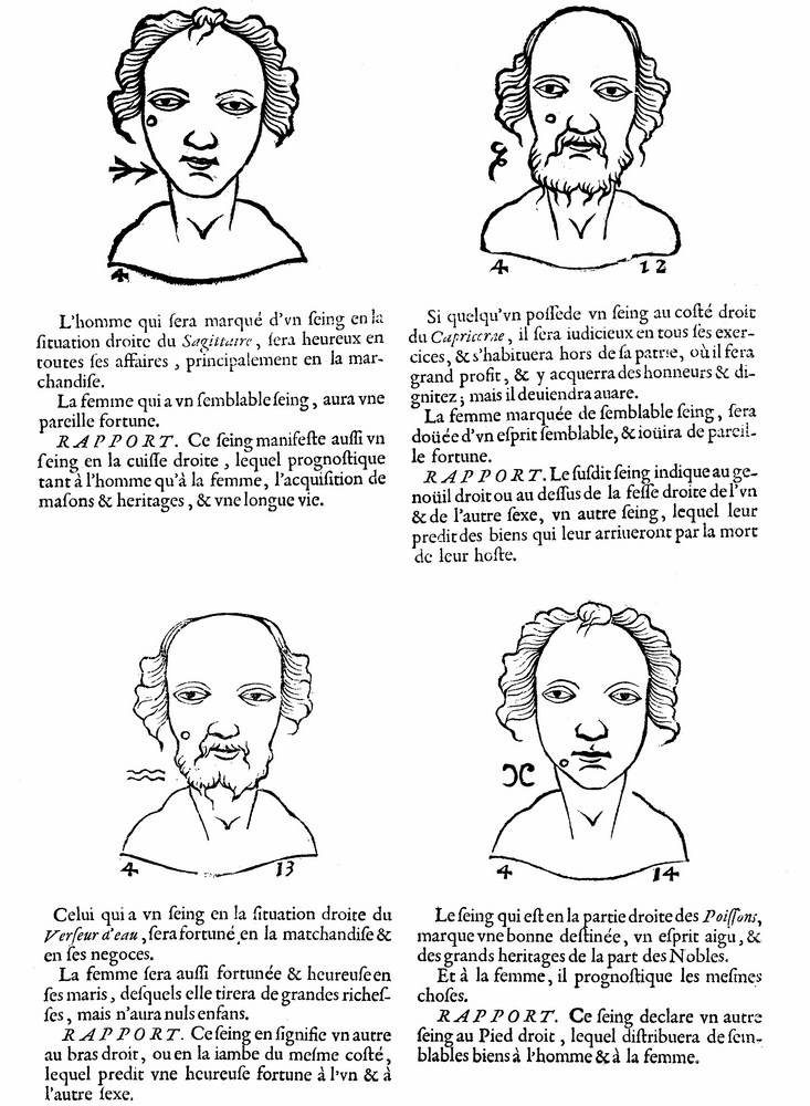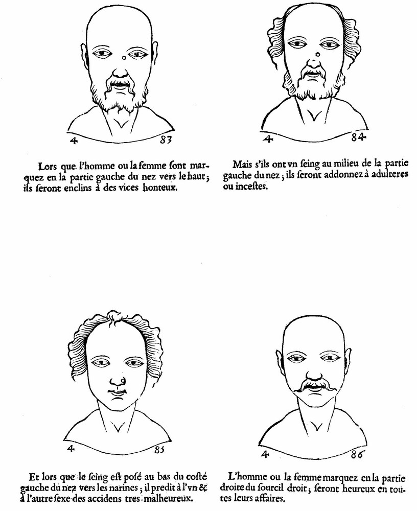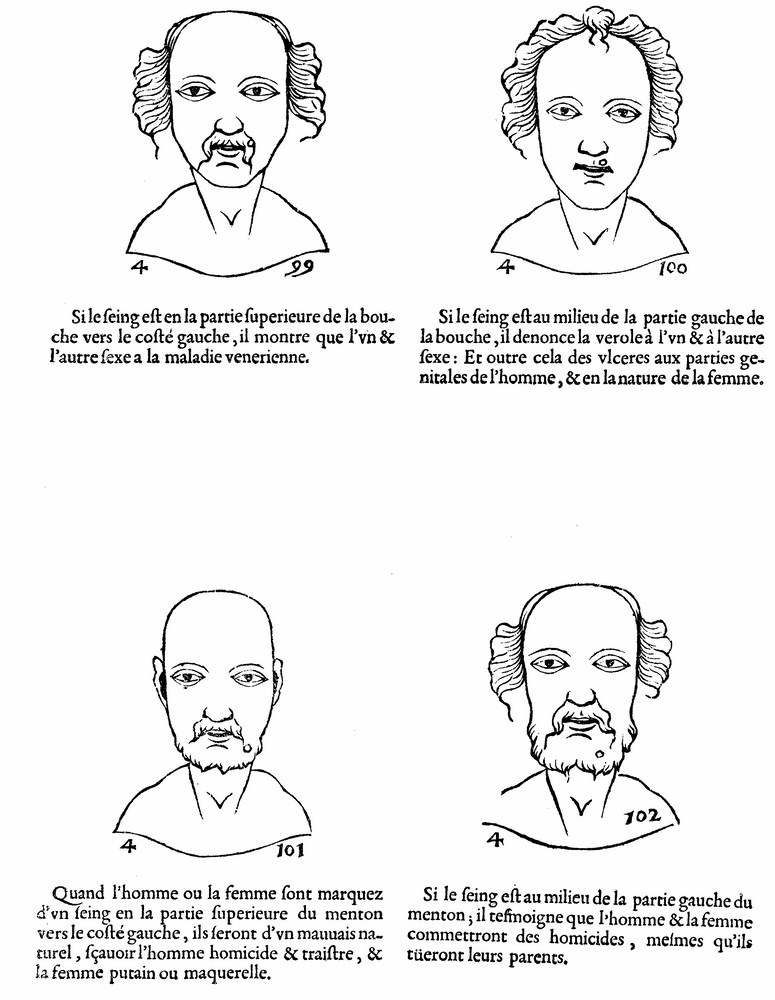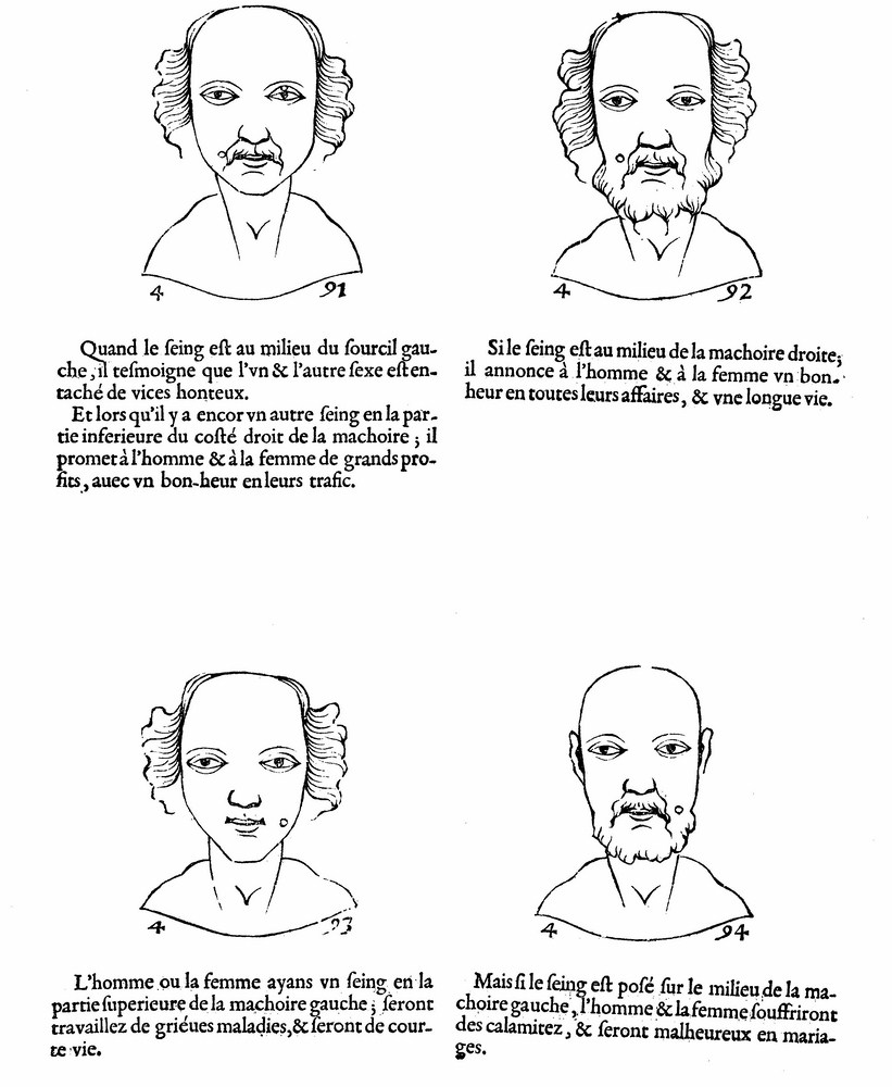 🕮 Dorbon-Aîné, ref.622 : Ce rarissime traité, qui ne se trouve pas dans la collection des Œuvres de Cardan, est d’ailleurs l’un des meilleurs que l’on ait sur la physiognomonie, l’auteur se contentant d’analyser les rides du front et les signes ou marques naturelles du visage (grains de beauté). — 800 figures, gravées sur bois et d’assez grande dimension, illustrent cette étude que suit l’œuvre sur le même sujet que Mélampus, dont le texte grec est placé en regard de la traduction française.