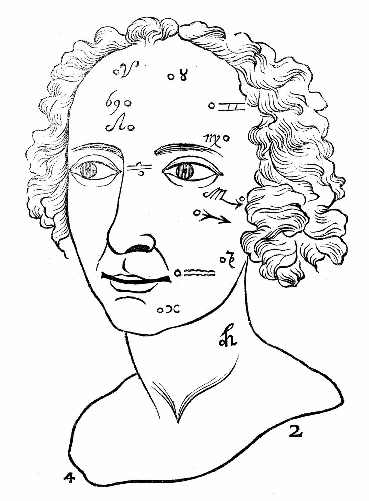 Des Signes placés sur la partie droite du Visage, faisant les Signes du Zodiaque :