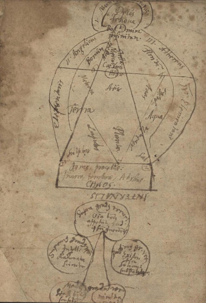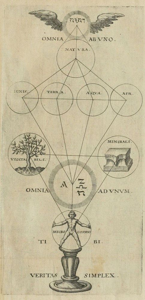 Dieu tout-puissant, après avoir, comme précédemment déclaré, crée au commencement le ciel, la terre et toutes les créatures, mit tout cela sous la direction de l’homme (en tant que son image), projetant pour lui comme pour l’univers entier une perfection future, et ainsi implanta en chaque créature une force divine cachée, par laquelle toutes les créatures pourraient être dynamisées en leur être et en leur croissance. Cela est appelé la Nature, une règle et un guide pour tout art, une servante Dieu et maîtresse de tous les artifices humains, une mère" pour tous les animaux, végétaux, et minéraux, éclat brillant des flammes divines. Cette Nature est comprise par la raison humaine (qui est directement et uniquement inspirée par le Créateur) (car les esprits et les intelligences ne seront pas communiqués ici pour certaines raisons). Toutes les choses que la Nature opère et fait arrivent et sont commandées par quatre des mêmes servantes ou plutôt quatre types de matière qui sont et sont appelées les quatre éléments de toutes choses, le feu, l’air, l’eau et la terre (en ce qui concerne le ciel et les étoiles nous ne seront liés à aucun). Par un mélange approprié et une actualisation toutes choses ont leur seconde origine ou selon qu’il plaît à Dieu leur continuation indéfinie. Cela ne doit cependant pas être compris comme directement et immédiatement, comme beaucoup le croient, mais par germe et sol (médium)selon les douze petits tracts chymiques qui constituent un prélude non négligeable à mes études pansophiques : ainsi les quatre éléments donnent naissance d’eux-mêmes par l’impulsion du sperme ou des graines de la nature qui sont jetés au centre de la terre et là élaborés et transformés en différentes sortes d’adaptations, et ce sperme est le Soleil, la triade parfaite unique, la monade la plus précieuse triplement liée, dans la sphère sublunaire, d’où secondairement toute chose tire son origine, dans laquelle la santé, la force, la richesse, les trésors, le talent et les biens du monde entier sont dépendants ; et la Physiologie générale, qui a déjà été mentionnée, traite de ceux-ci. Celui qui connaît cela saisira bientôt les particularités. Dans la figure précédente cela est si clairement et ouvertement montré qu’il est impossible de l’écrire plus clairement.