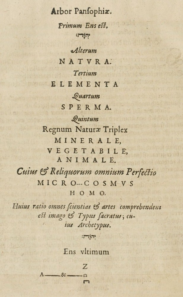 Cette semence divise ses créatures en trois règnes principaux, le règne animal, végétal et minéral et est trouvée en chacun bien que toi et d’autres puissent lire autre chose dans les écrits des philosophes, mais remarque que tout ce que tu as vu jusque là et contemplé se rassemble en toi même comme en un centre et image de Dieu, car toute chose sont de l’un et retournent à l’un, d’où le "Connais toi toi-même", "Connais toi toi-même", dis-je, et ainsi parviendras tu à la perfection pansophique, qui (afin que tu en sois informé en vérité) procède comme suit :