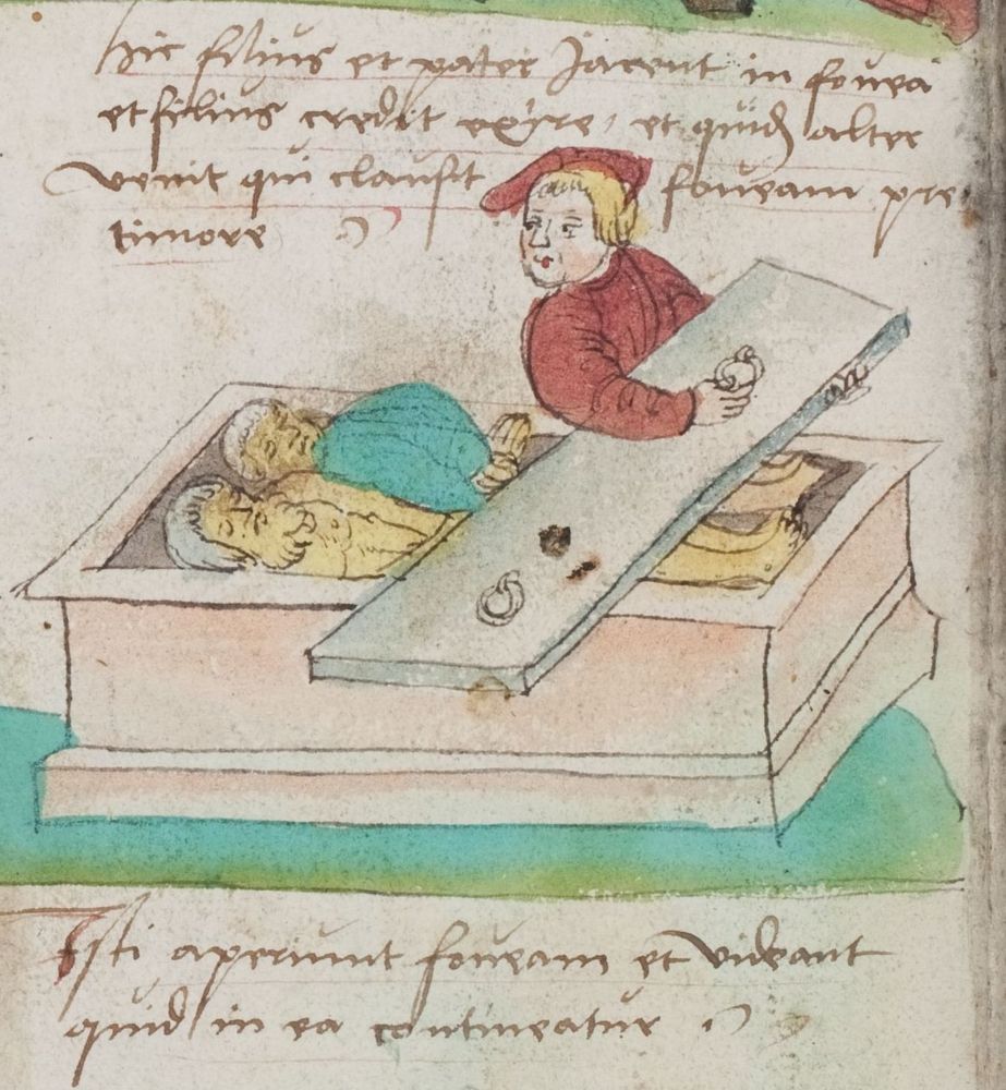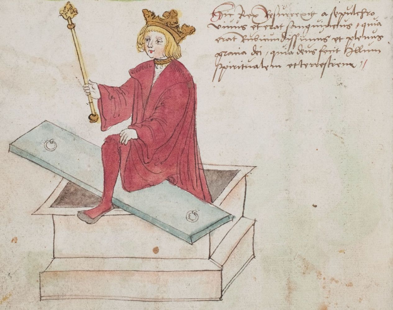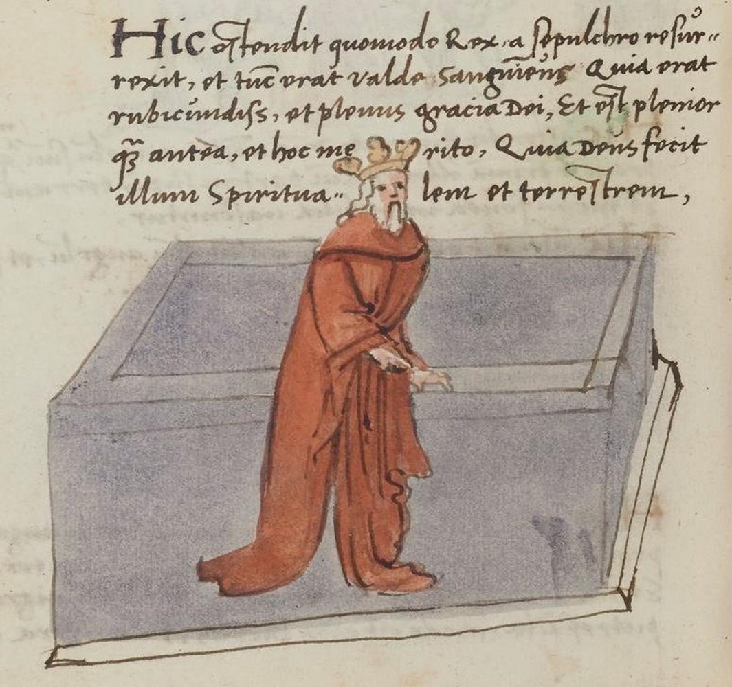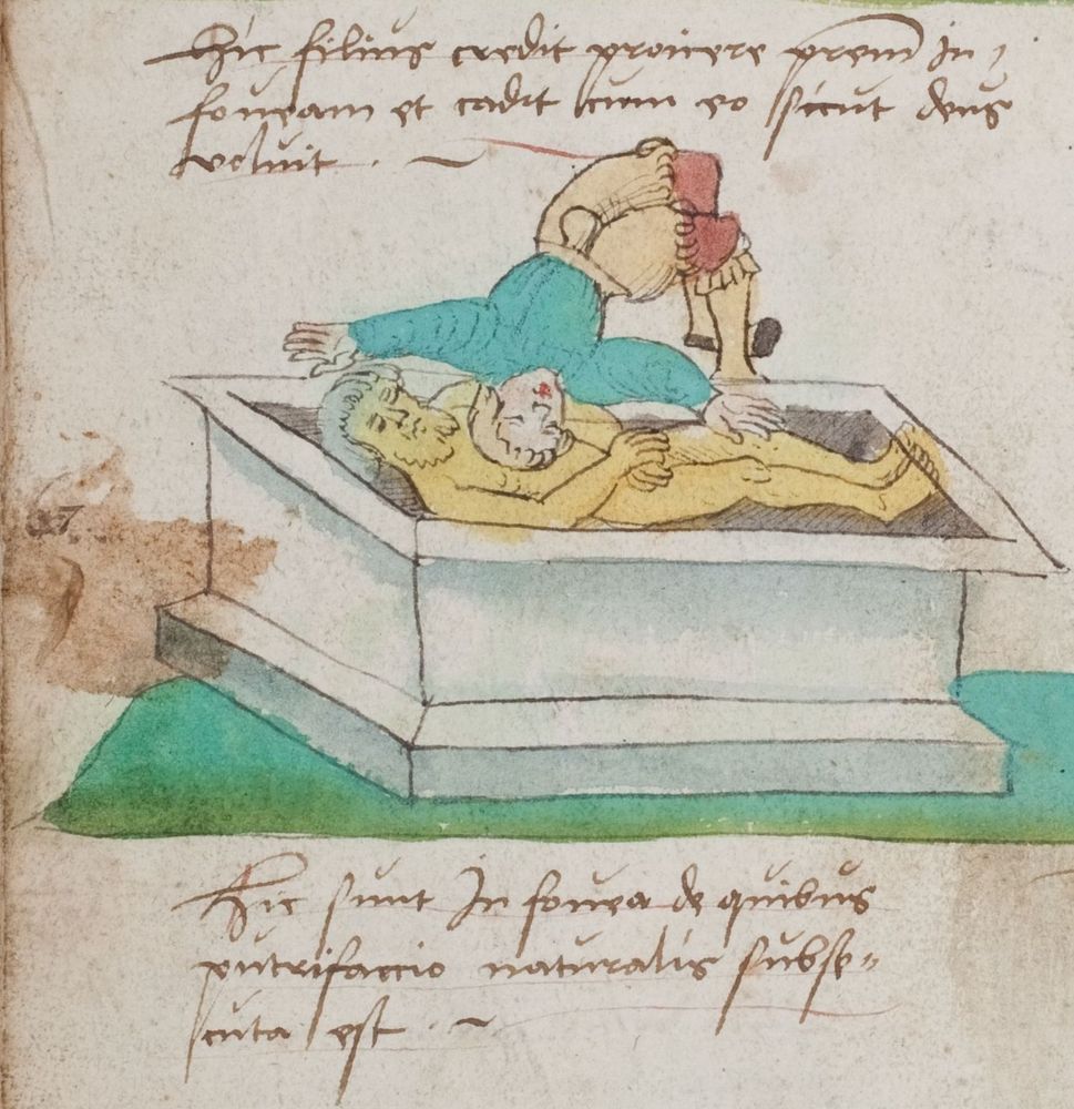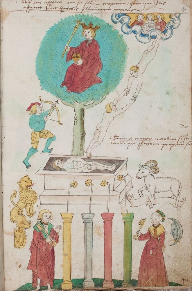 ► Comme nous n’avons plus le manuscrit original, il est impossible de dire si les illustrations sont d’origine. Du reste, le second groupe des dites illustrations ont par ailleurs eu un impact sur l’évolution du symbolisme alchimique : le sujet de la mort et de la résurrection du roi devenant par la suite proéminent. Comme pour la plupart des illustrations premières, ces dernières sont plus brutes, naïves et viscérales que ce qui a été développé par la suite.