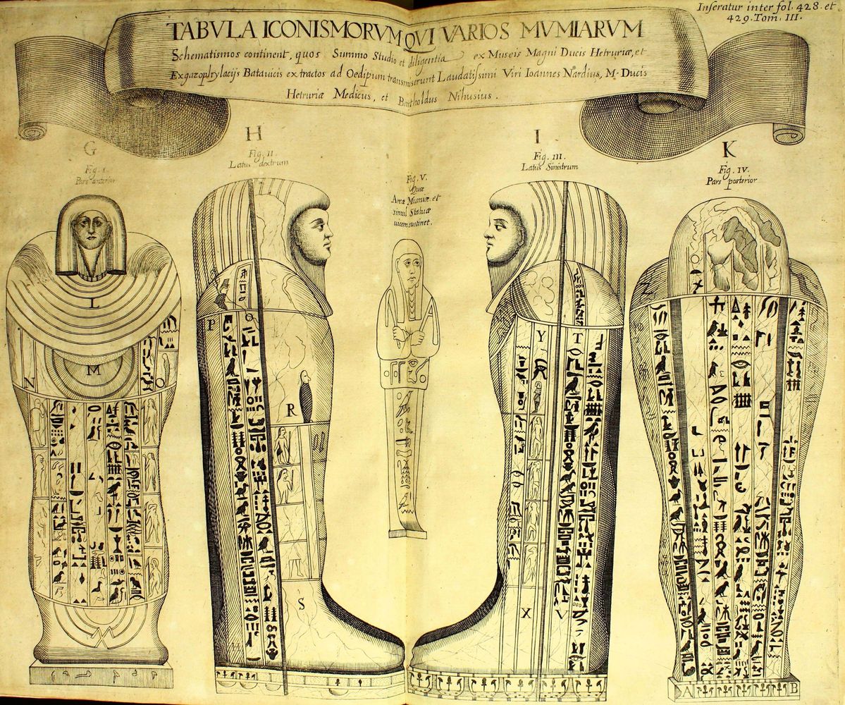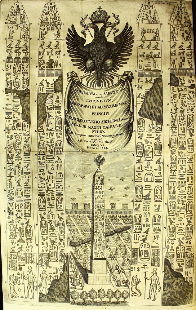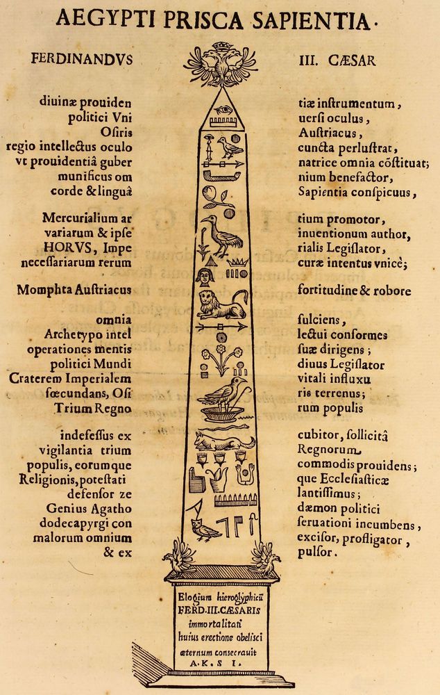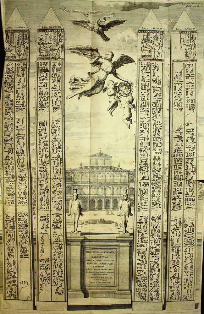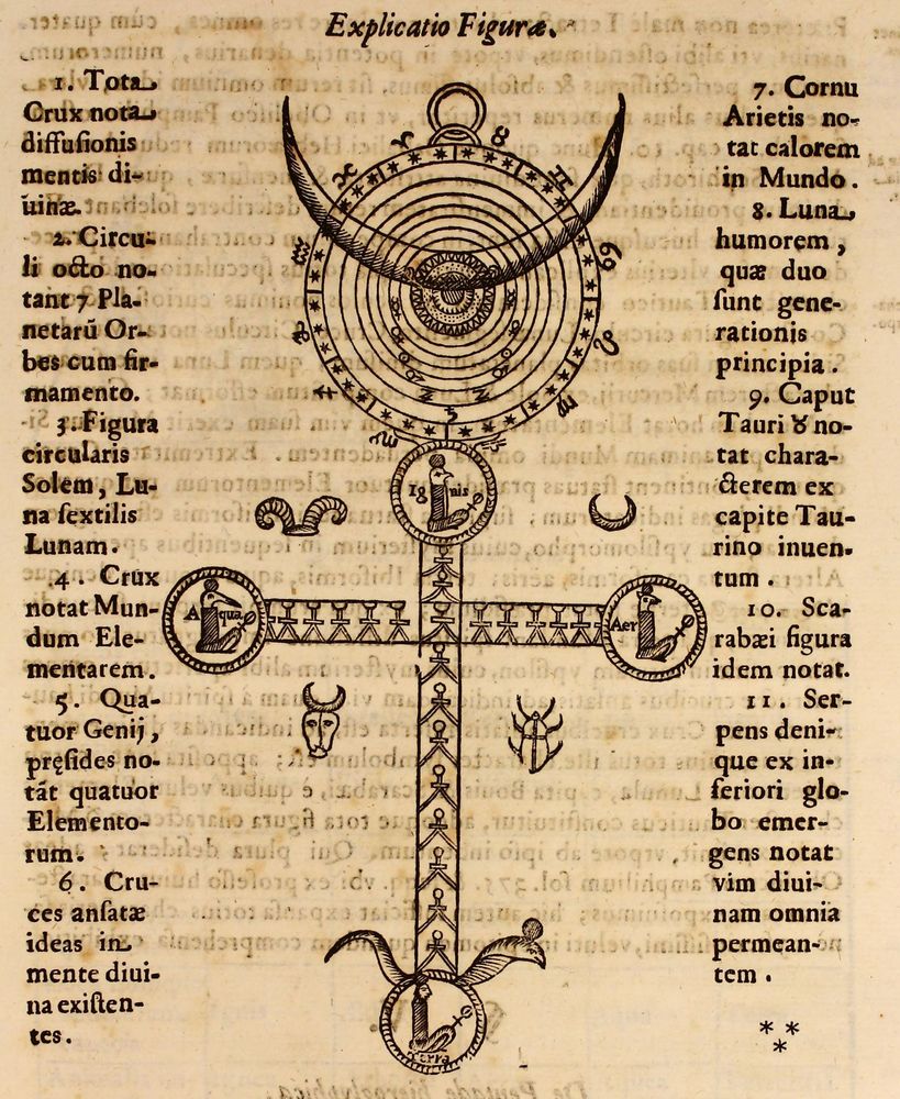 ► Pionnier dans le domaine de l’égyptologie, le chef-d’œuvre savant et baroque de Kircher demeure, comme tout ses travaux, un travail emprunt d’un ésotérisme humaniste hermétisant dont se réclament volontiers les courants rosicruciens puis le néo-occultisme. Il s’agit probablement de la plus grande œuvre du Léonard de Vinci Baroque.