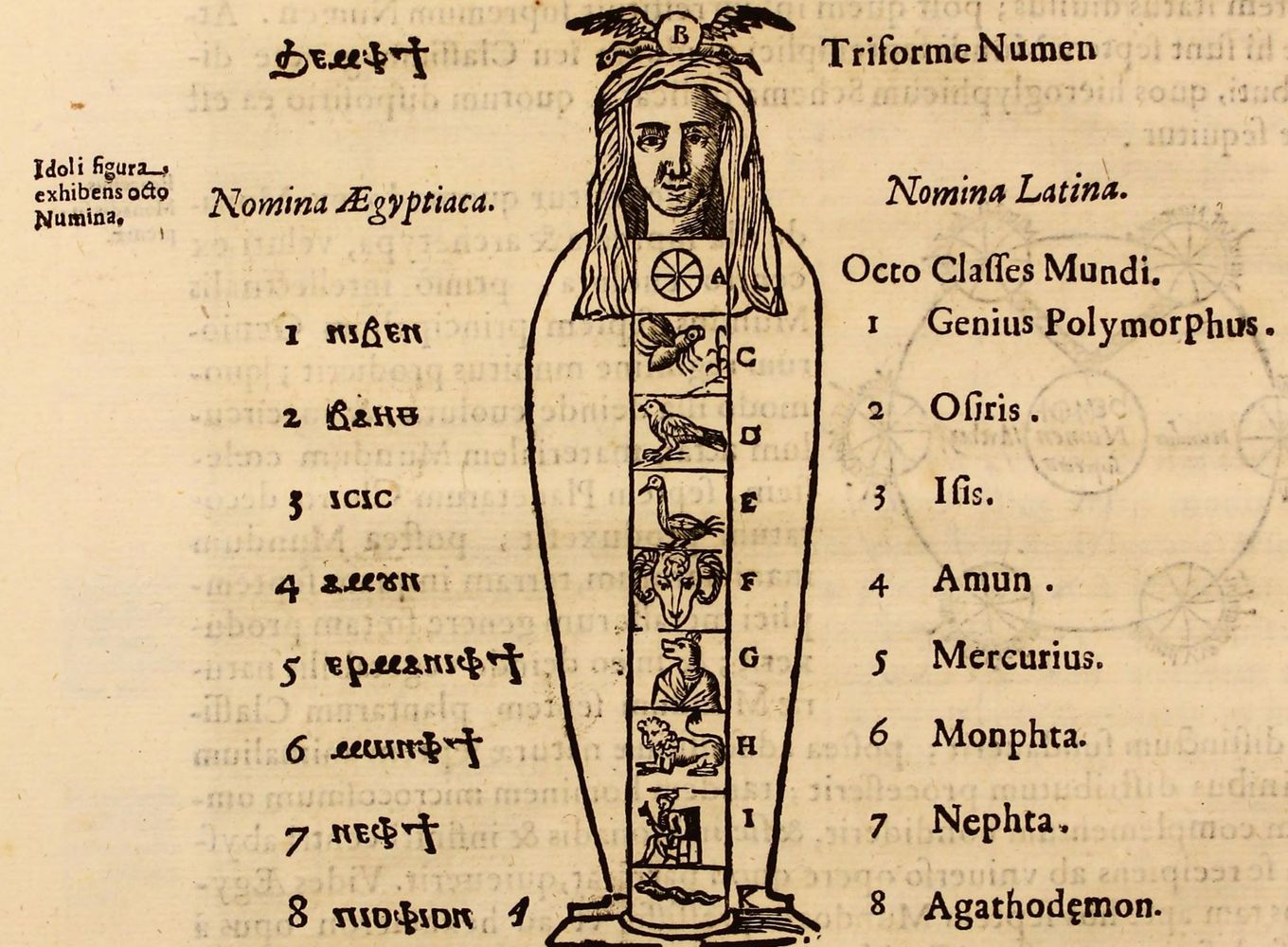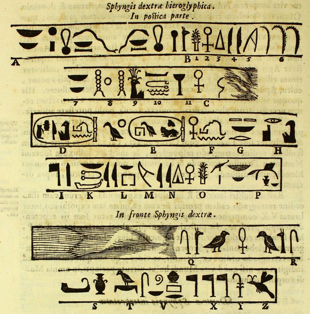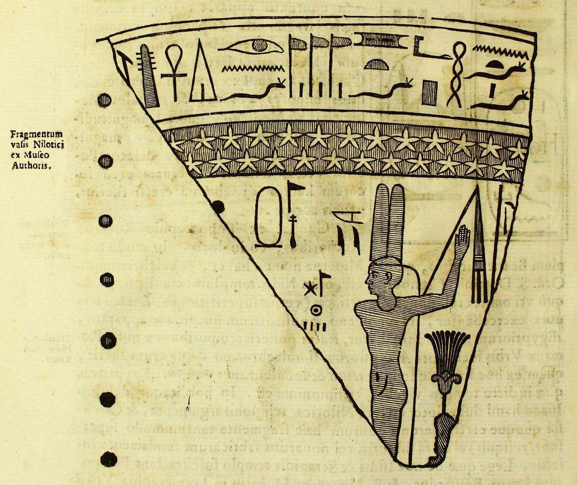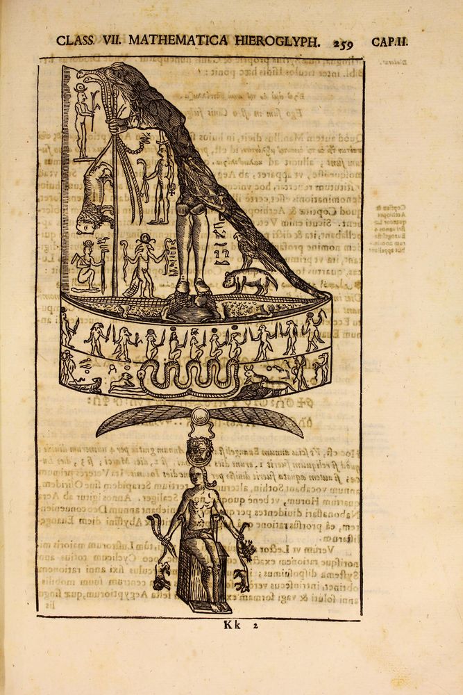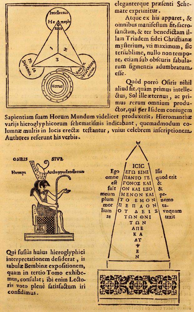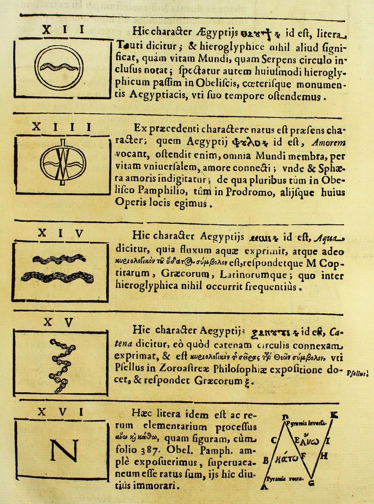 ► Utilisant des sources comme la fameuse Table isiaque, l’Isis et Osiris de Plutarque et les Hiéroglyphes d’Horapollon, le polyglotte tentera de traduire les hiéroglyphes en même temps qu’il chercha à obtenir le langage symbolique universel. L’ouvrage est édifié autour des recherches de Kircher sur de nombreux ésotérismes, d’abord grecs et latins mais aussi moyen-orientaux : ex. qabbale juive, alchimie፧ islamique, astrologie፧ chaldéenne, magie persane ou encore théologie phénicienne, mystères zoroastriens.