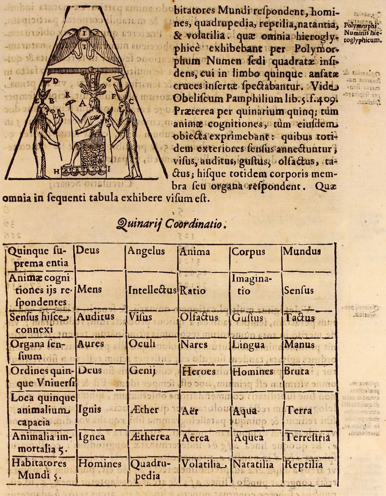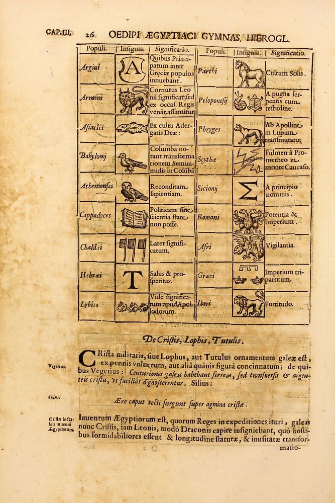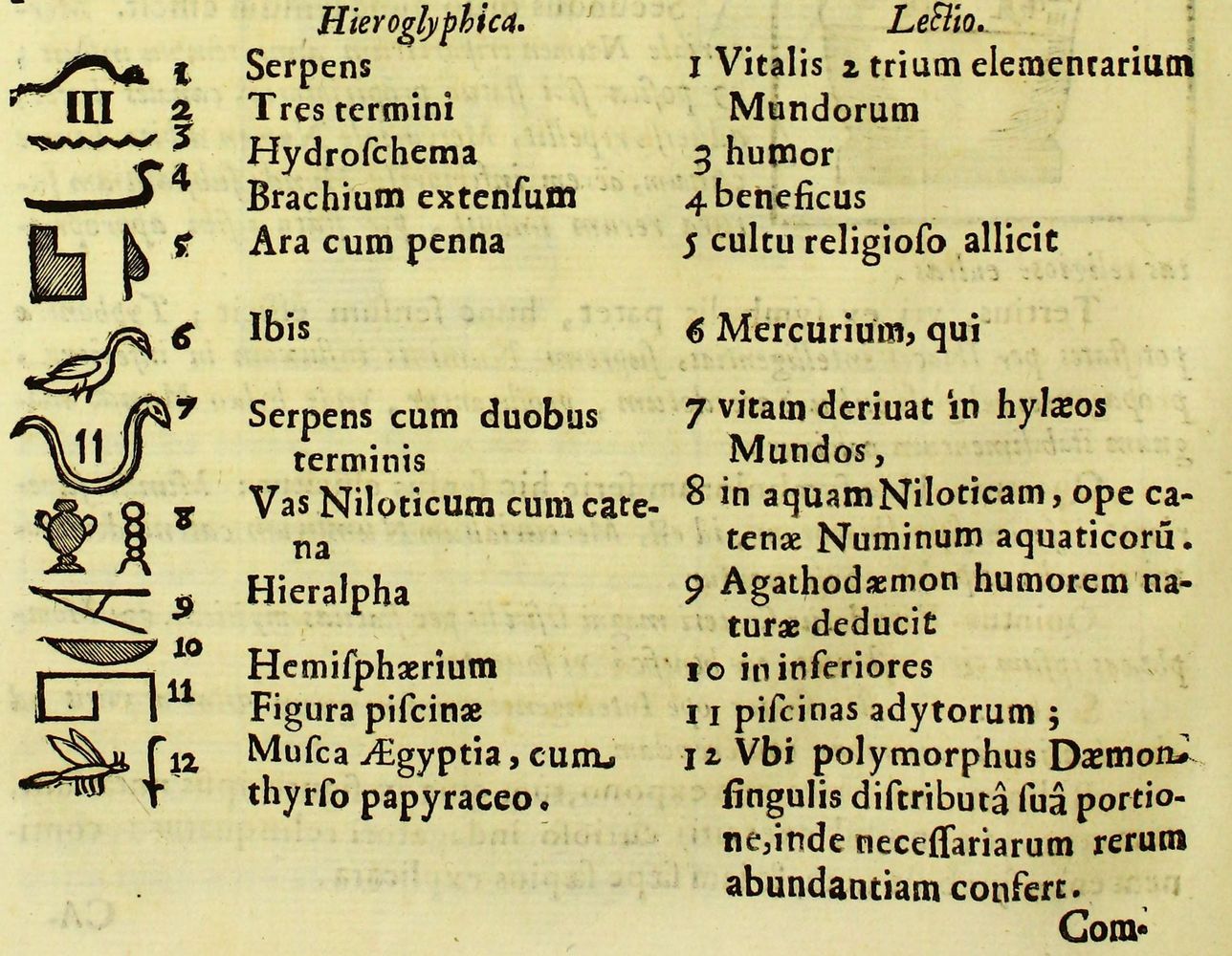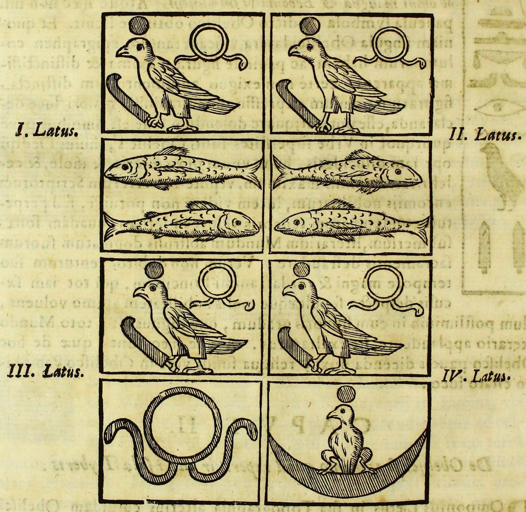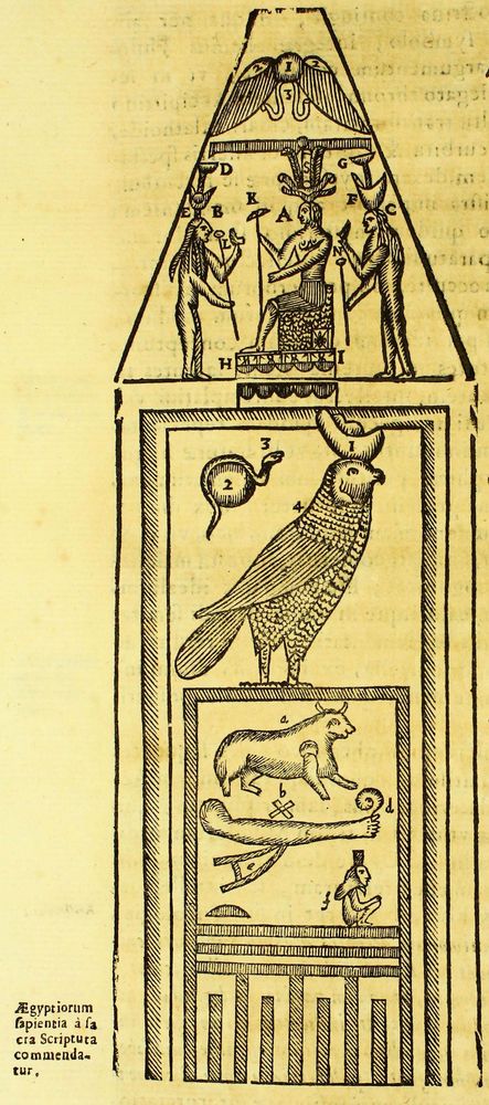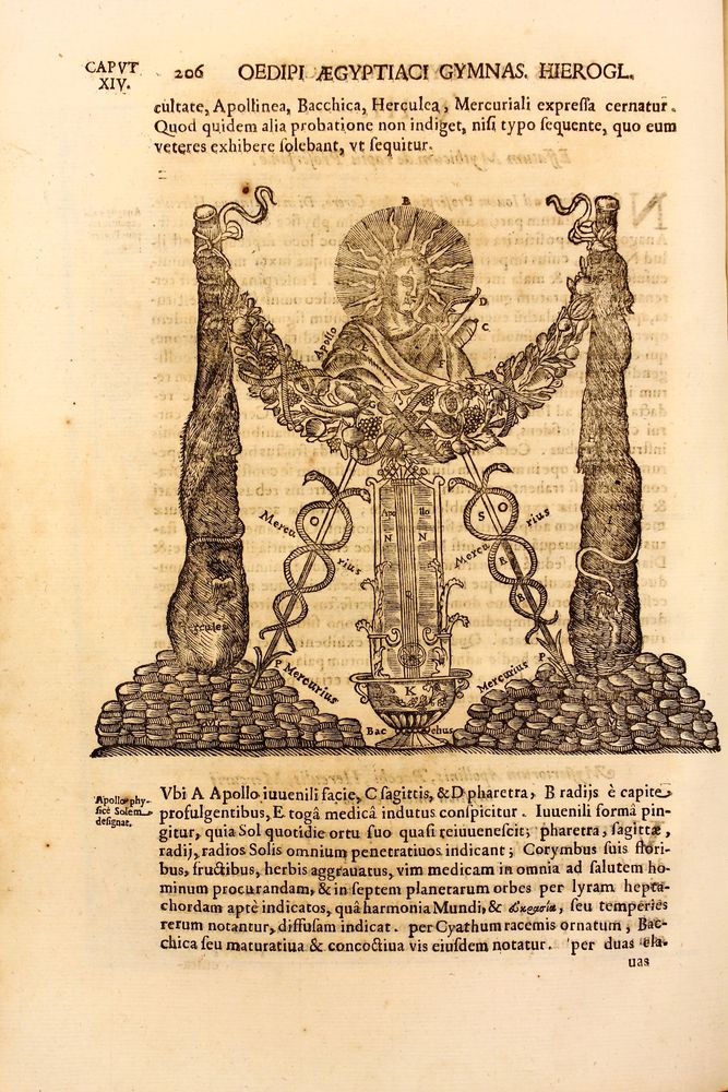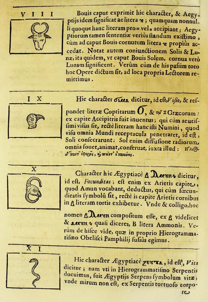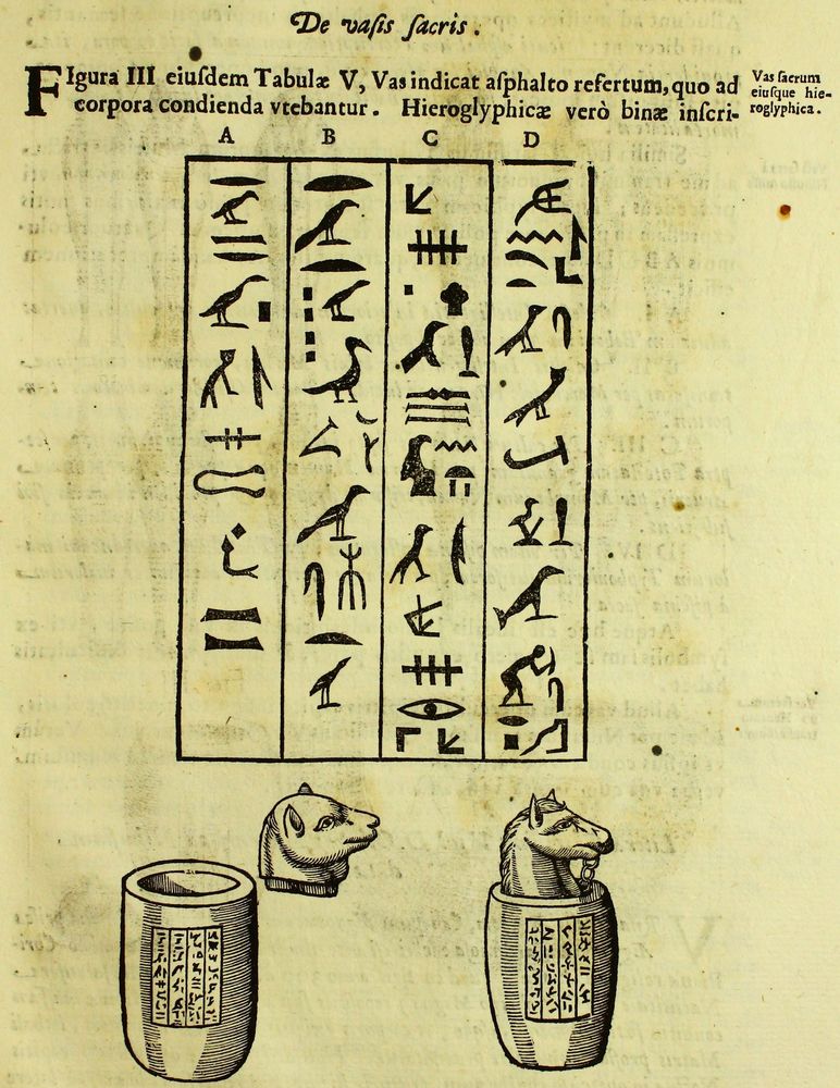 ► Utilisant des sources comme la fameuse Table isiaque, l’Isis et Osiris de Plutarque et les Hiéroglyphes d’Horapollon, le polyglotte tentera de traduire les hiéroglyphes en même temps qu’il chercha à obtenir le langage symbolique universel. L’ouvrage est édifié autour des recherches de Kircher sur de nombreux ésotérismes, d’abord grecs et latins mais aussi moyen-orientaux : ex. qabbale juive, alchimie፧ islamique, astrologie፧ chaldéenne, magie persane ou encore théologie phénicienne, mystères zoroastriens.