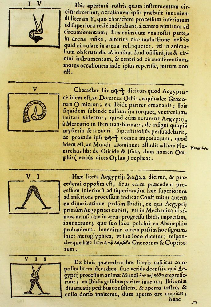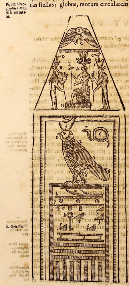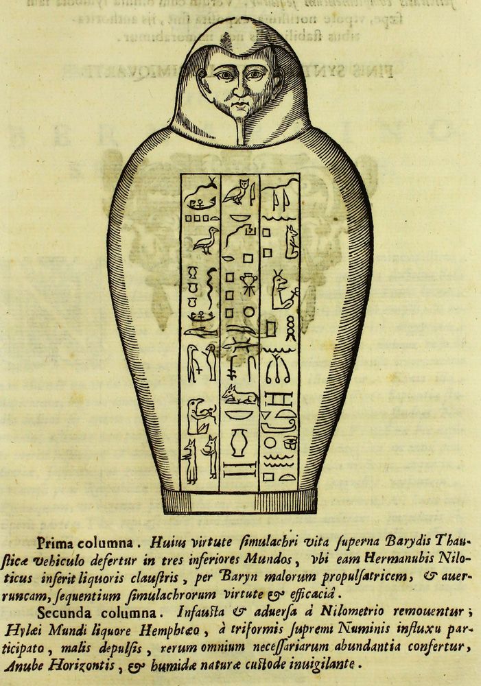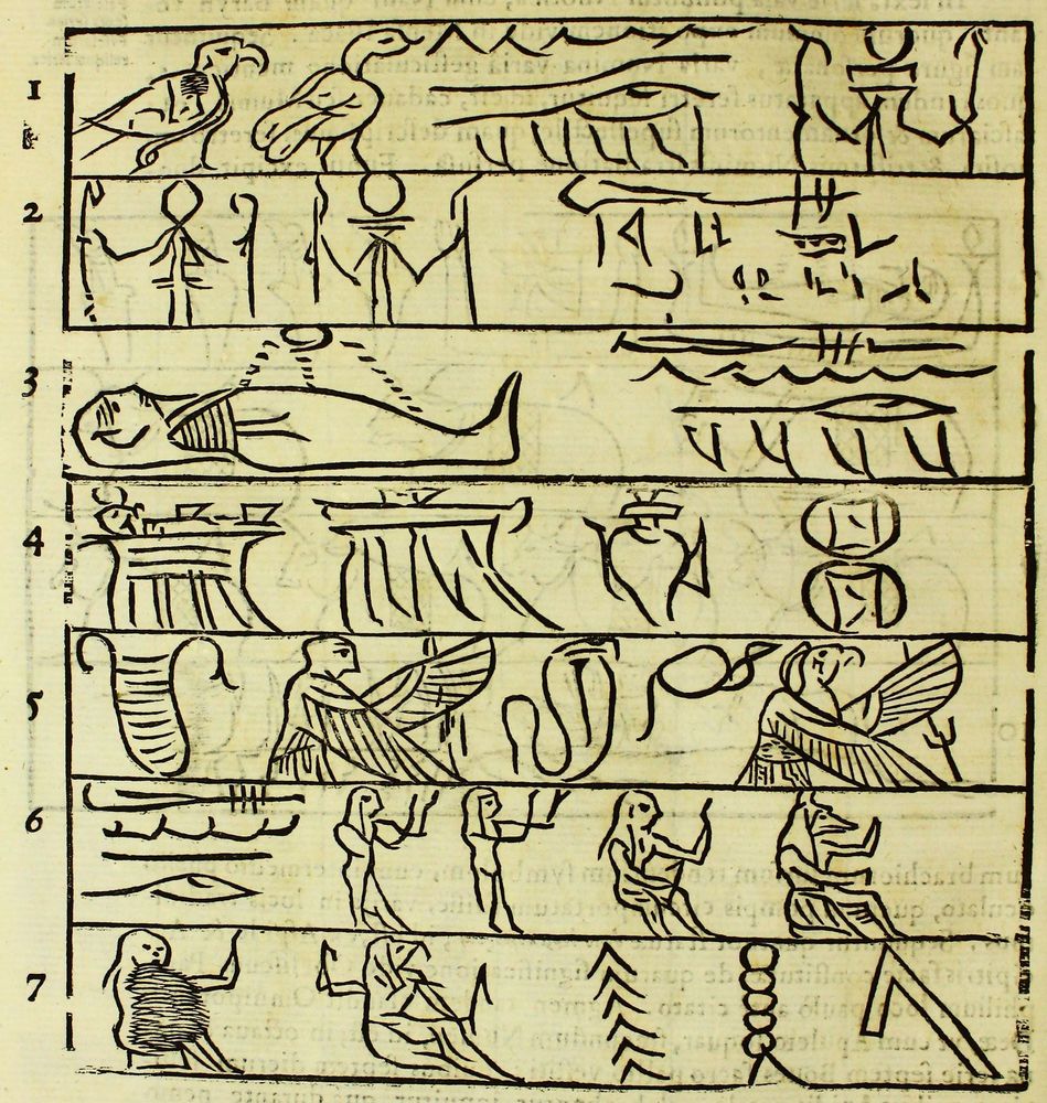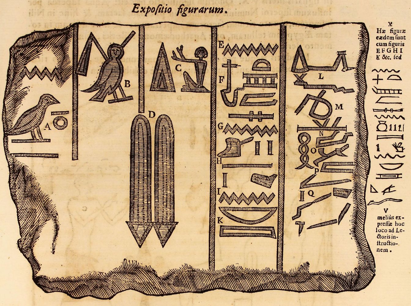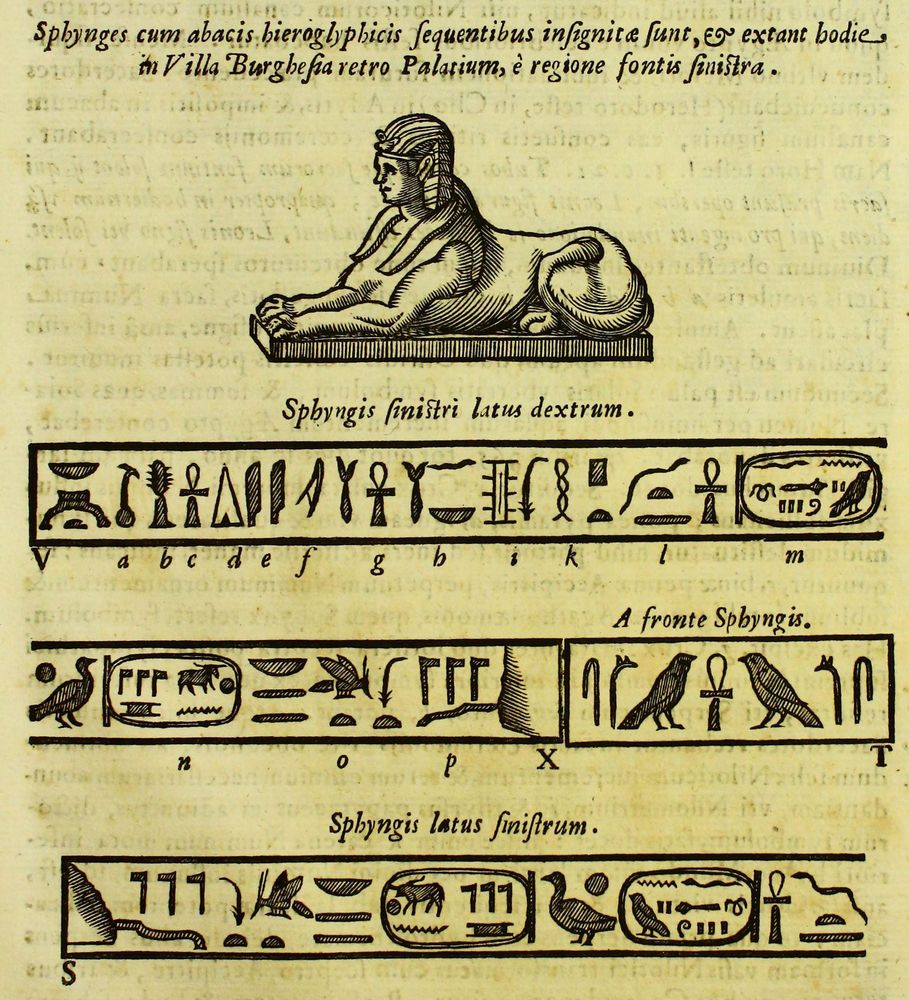 ► Utilisant des sources comme la fameuse Table isiaque, l’Isis et Osiris de Plutarque et les Hiéroglyphes d’Horapollon, le polyglotte tentera de traduire les hiéroglyphes en même temps qu’il chercha à obtenir le langage symbolique universel. L’ouvrage est édifié autour des recherches de Kircher sur de nombreux ésotérismes, d’abord grecs et latins mais aussi moyen-orientaux : ex. qabbale juive, alchimie፧ islamique, astrologie፧ chaldéenne, magie persane ou encore théologie phénicienne, mystères zoroastriens.