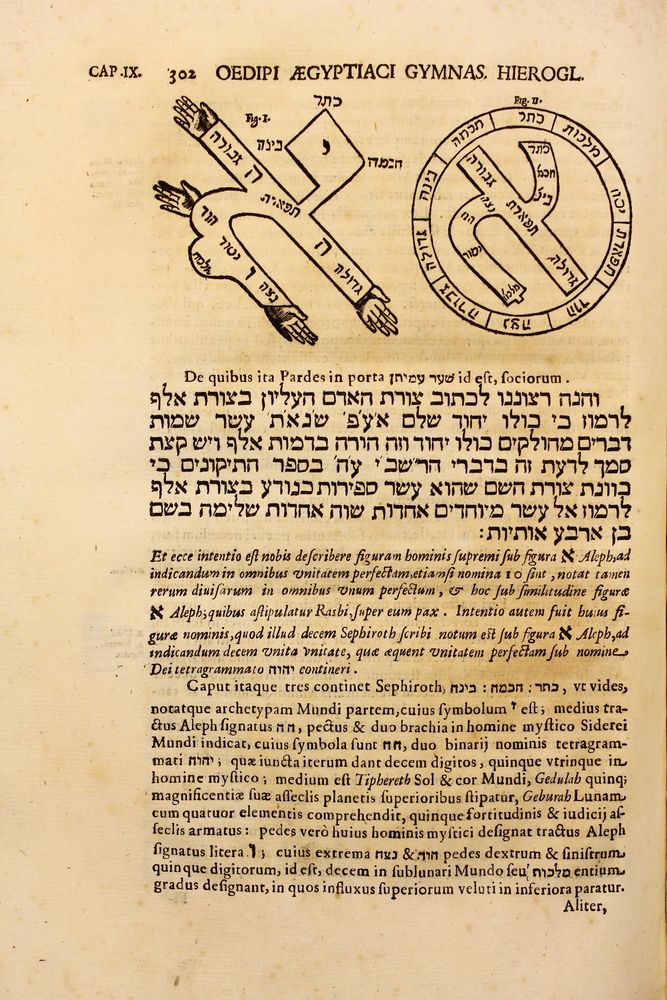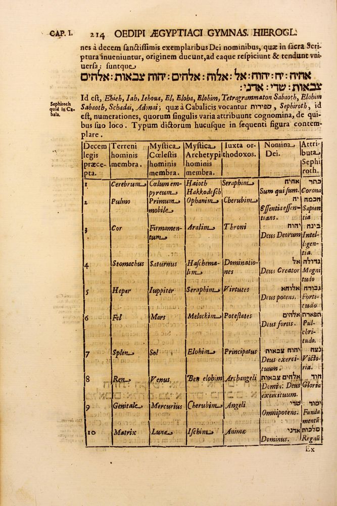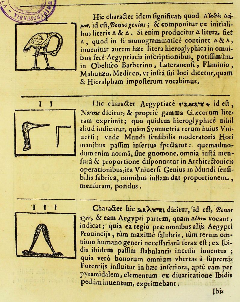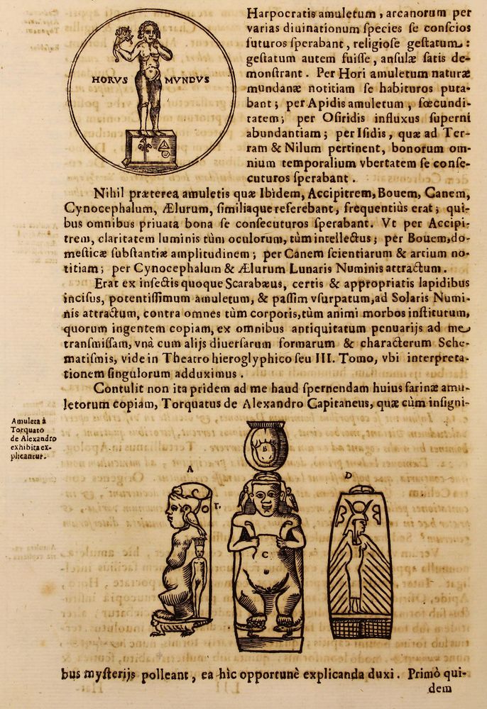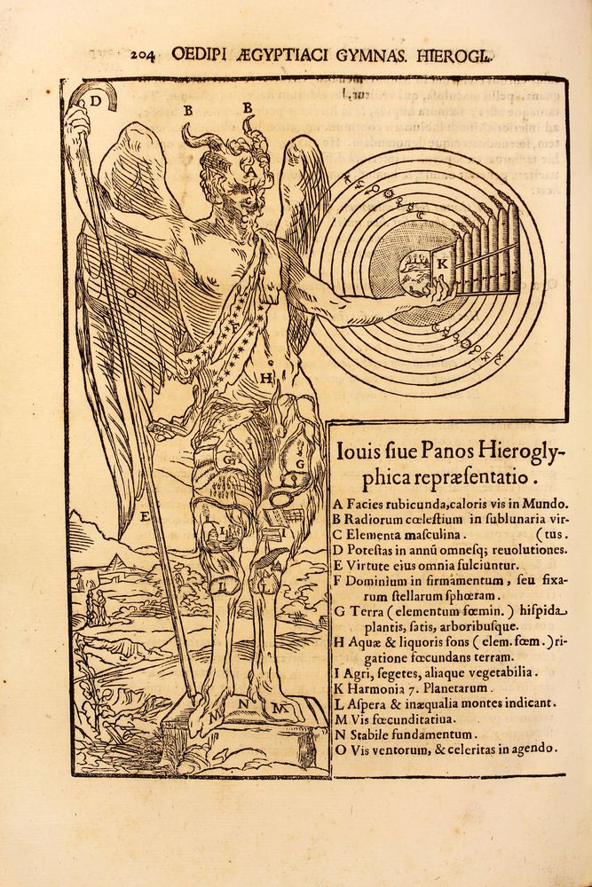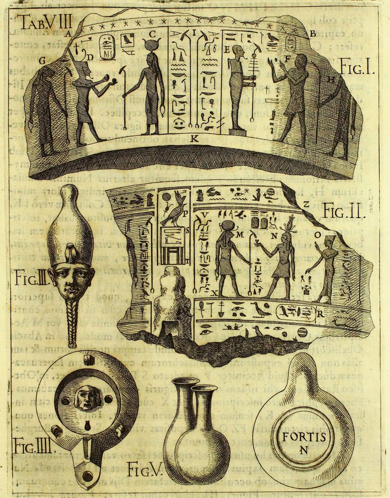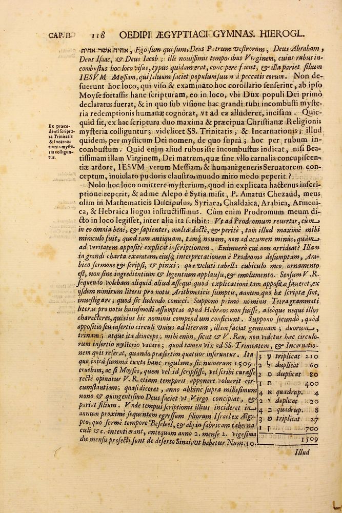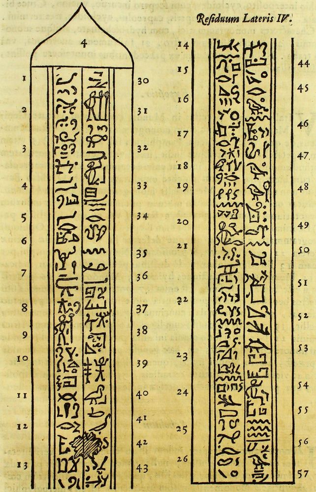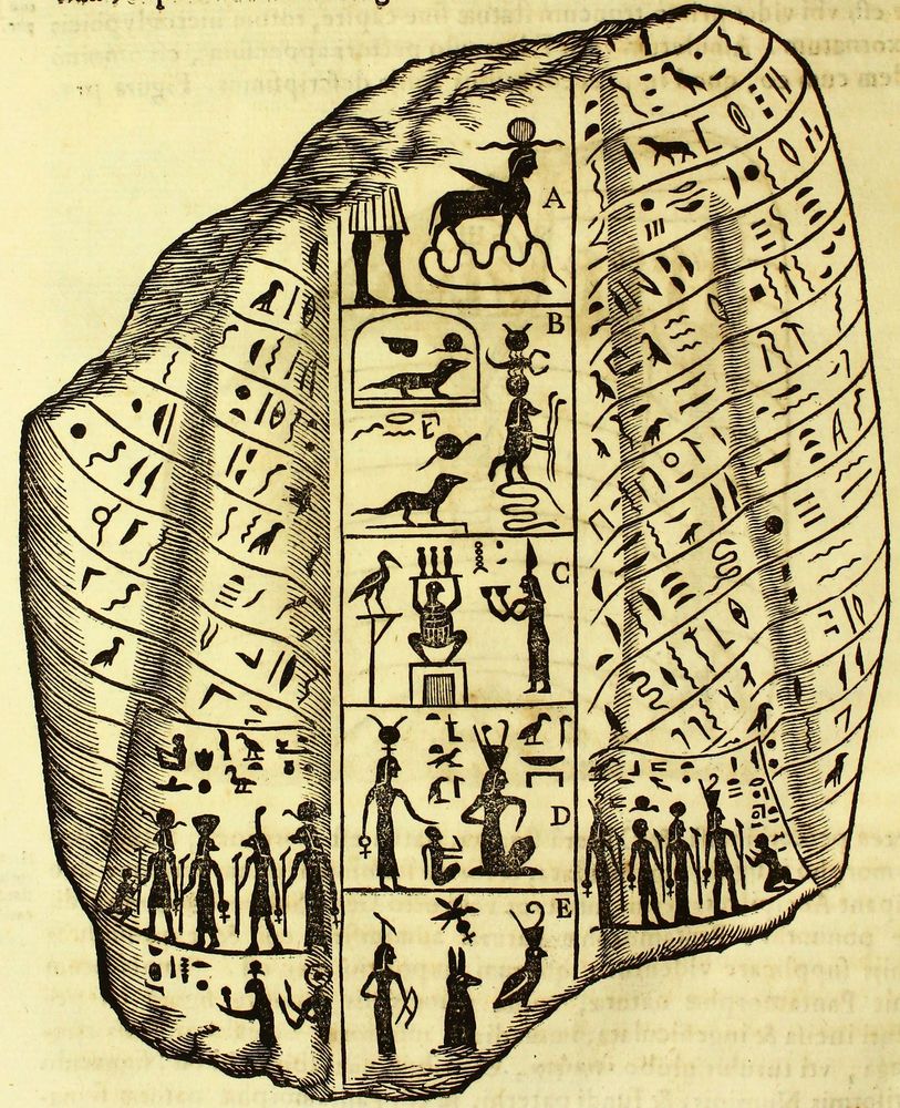 ► Utilisant des sources comme la fameuse Table isiaque, l’Isis et Osiris de Plutarque et les Hiéroglyphes d’Horapollon, le polyglotte tentera de traduire les hiéroglyphes en même temps qu’il chercha à obtenir le langage symbolique universel. L’ouvrage est édifié autour des recherches de Kircher sur de nombreux ésotérismes, d’abord grecs et latins mais aussi moyen-orientaux : ex. qabbale juive, alchimie፧ islamique, astrologie፧ chaldéenne, magie persane ou encore théologie phénicienne, mystères zoroastriens.