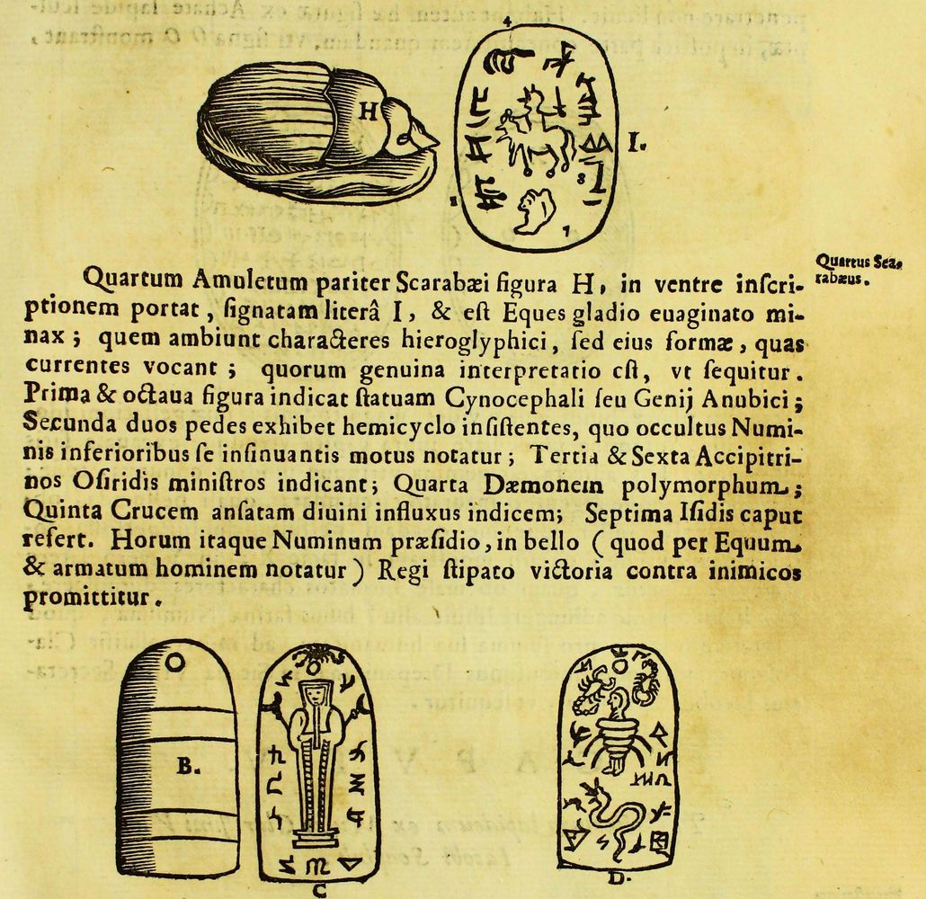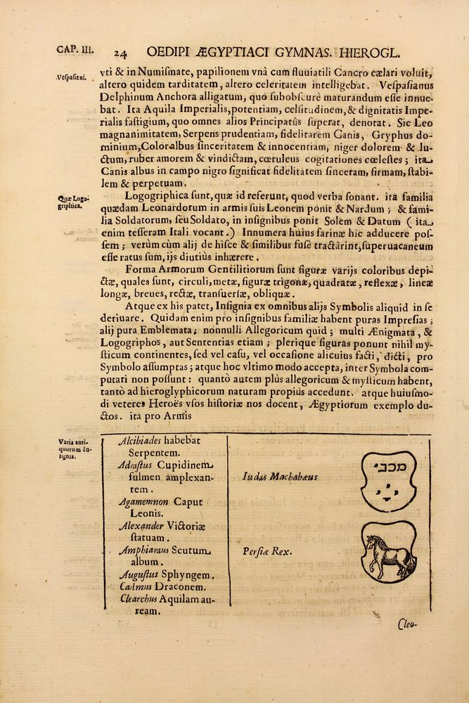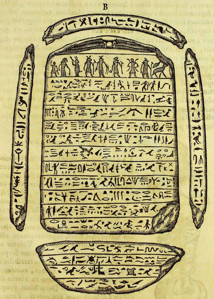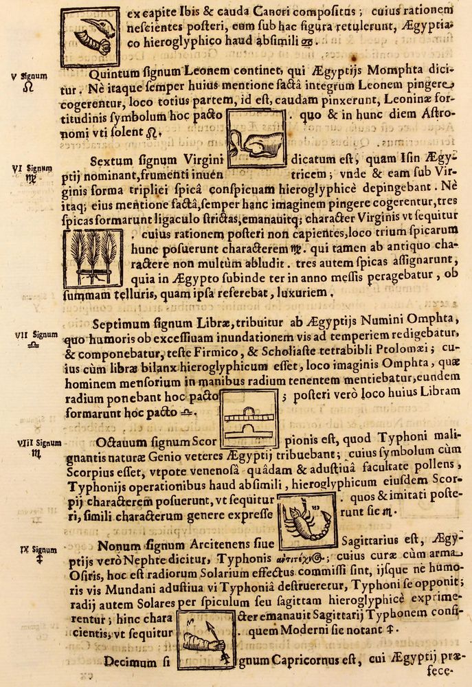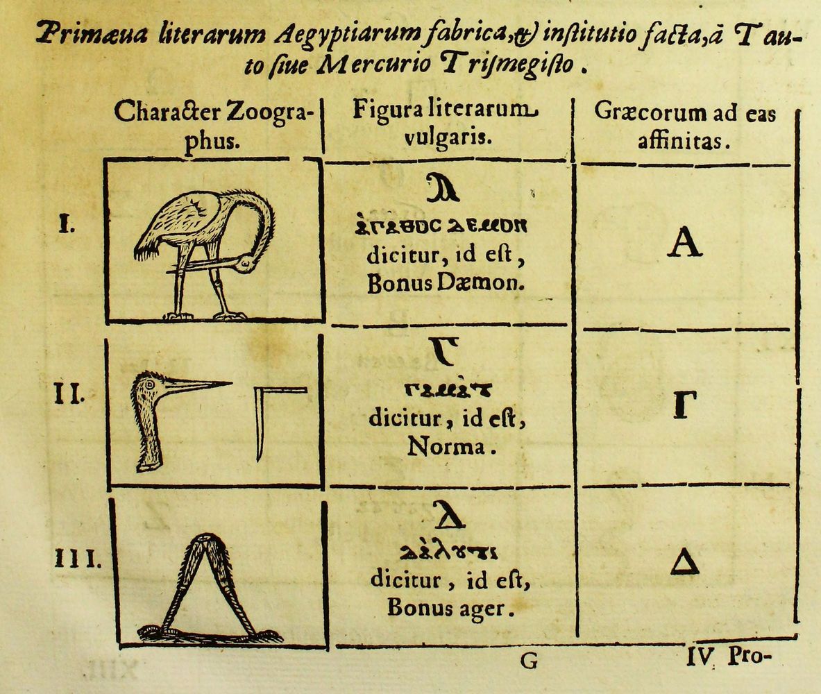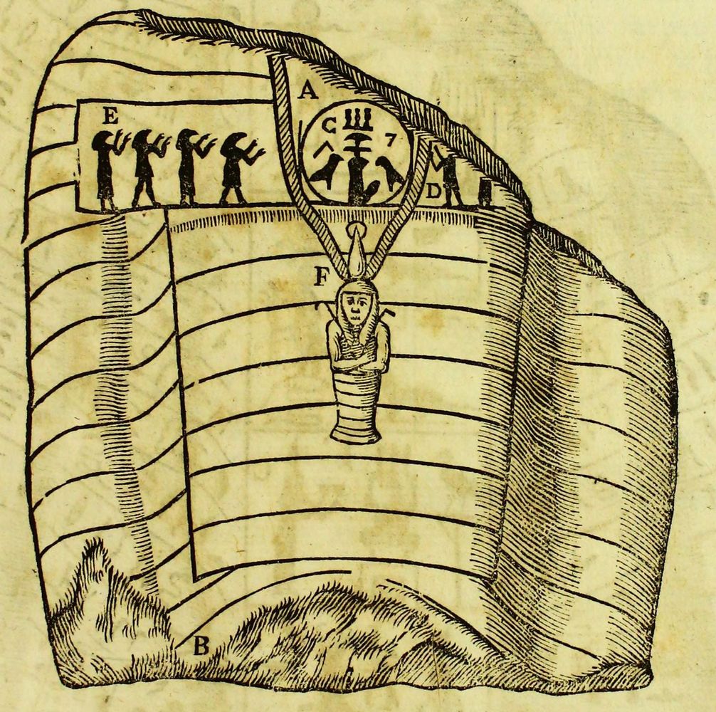 ► Utilisant des sources comme la fameuse Table isiaque, l’Isis et Osiris de Plutarque et les Hiéroglyphes d’Horapollon, le polyglotte tentera de traduire les hiéroglyphes en même temps qu’il chercha à obtenir le langage symbolique universel. L’ouvrage est édifié autour des recherches de Kircher sur de nombreux ésotérismes, d’abord grecs et latins mais aussi moyen-orientaux : ex. qabbale juive, alchimie፧ islamique, astrologie፧ chaldéenne, magie persane ou encore théologie phénicienne, mystères zoroastriens.