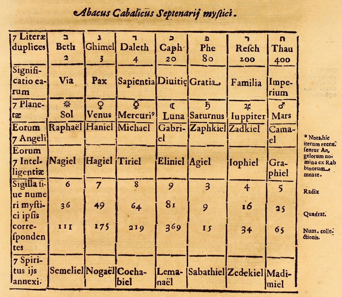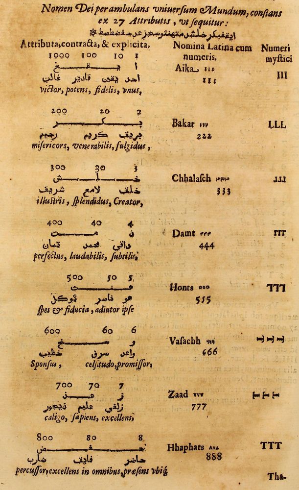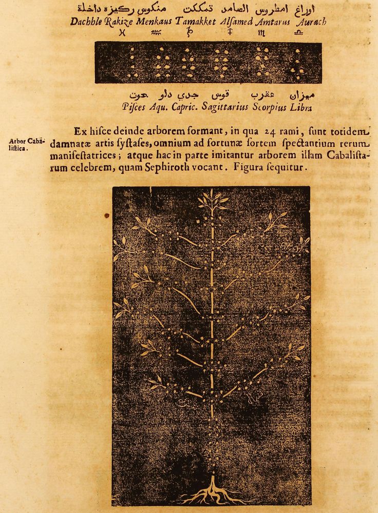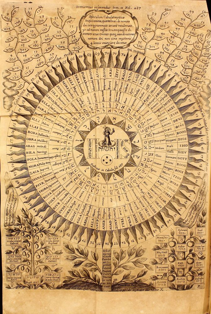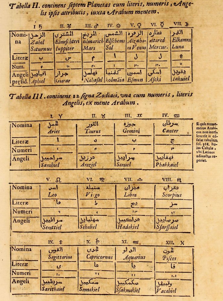 Le Tome II est en grande partie, consacré à la Kabbale des Hébreux, à la Kabbale Saracénique, avec nombreuses planches de sceaux, de pantacles, figures, caractères hébraïques et arabes. La Kabbale, définition et division. Gématrie. Notarique. Explications avec exemples à l’appui. Themura. Origine de la Kabbale. De la première base de la Kabbale, ou l’alphabet hébraïque et l’ordre mystique de ses lettres. Des noms et surnoms divins. Du nom de quatre lettres, ou Tétragrammaton. Mystères du nom de Dieu. Du nom de Dieu de douze lettres, ou Dodécagrammaton. Du nom de Dieu de vingt-quatre lettres, ou Eikosiduogrammaton par lequel les prêtres bénissaient le peuple. Du nom de Dieu de quarante-deux lettres. Opinions des Mécubalim sur ses vertus occultes. De la Table Ziruph ou des Combinaisons des Alphabets hébraïques. Comput thalmudique relativement à la multitude des anges. Manière d’extraire le nom de 42 lettres de la table Ziruph. Explication des quarante-deux épithètes divines. Du nom de Dieu de 72 lettres. Manière mystique de l’écrire. Respect des Rabbins pour ce mot. Usage qu’en font les kabbalistes. Les 72 versets extraits des divers Psaumes où sont contenus les noms des anges. Pourquoi le nom de Dieu Tétragrammaton fut inconnu des anciens Païens, et comment toutes les choses du passé sont renfermées dans le nom de Jésus. Explication du Tétragrammaton. De la Théologie mystique et secrète des Hébreux. Des dix Séphiroth. De canaux séphirotiques. Similitude des dix Séphiroth avec la figure humaine. Des trente-deux sentiers de la Sagesse et de leur interprétation rabbinique. Des cinquante portes de l’Intelligence. Interprétation des Séphiroth suivant la mystique des Hébreux. De la Triade, de l’Heptade, de la Dodécade et des vingt-deux lettres auxquelles correspondent les canaux séphirotiques, et de leurs mystères. Interprétation des trois lettres simples. Correspondances et rapports avec les nombres pythagoriques ; le quaternaire, la tétractys. Interprétation des sept lettres doubles. Abacus kabbalistique du septénaire mystique. Concordances planétaires, angéliques, sceaux mystiques, etc. Interprétation des douze lettres simples, leur abacus kabbalistique et leurs correspondances numérales, planétaires, angéliques, etc. De la Kabbale naturelle. En quoi elle consiste. De la Kabbale astrologique. De la Kabbale des Psaumes. Des invocations kabbalistiques et magiques. De la magie kabbalistique, Egyptienne, Pythagorique, etc. De la Kabbale Séracénique, c’est-à-dire delà Philosophie secrète des Arabes et des Turcs. Exposition des arcanes des Sarrazins, leur origine. Alphabet mystique des Arabes. Des noms divins employés par les Musulmans, leur propriété, efficacité, d’après un extrait fidèle du traité d’Abulhassan. Des noms divins représentés par les Nombres. Des noms divins et des nombres par lesquels ils se manifestent pour l’appropriation des 7 planètes et des 12 signes du Zodiaque. Explication de ces noms translatés de l’arabe en latin avec figures sigillaires et la roue des arcanes. De la structure des noms mystiques et de leur signification. Harmonie des Lettres, des Nombres, des Noms avec les 27 catégories du monde, divisées en trois Ennéades. Emplois occultes des noms de Dieu. Table des quatre éléments, avec leurs qualités, leurs lettres, leurs nombres, les Anges qui leur sont attribués. Table des 7 planètes avec leurs correspondances littérale, numérale, angélique, etc. Table des 12 signes du Zodiaque avec ses multiples correspondances. Table des 28 mansions de la Lune dans ses rapports avec les 12 signes du Zodiaque, les éléments, les lettres et les nombres mystiques, les anges, les révolutions planétaires, les noms de Dieu, ou Harmonie de l’Univers. Emploi et interprétation de cette Table de l’Harmonie de l’Univers. Confection et usage des Talismans, des nombres proniques. De la transformation variée des noms et des lettres en différentes figures. Des grands talismans. Toute cette partie kabbalistique est préparée par le sphinx mystagogique et l’explication des lettres et nombres assyriens, samaritains, etc. La symbolique hiéroglyphique de Zoroastre d’après les interprétations néoplatonicien nés de Psellus et de Pléthon. Interprétations orphiques. Symboles Pythagoriciens, leur explication. Mystères hiéroglyphiques des Egyptiens dévoilés par l’exégèse des animaux mystiques, etc., etc.