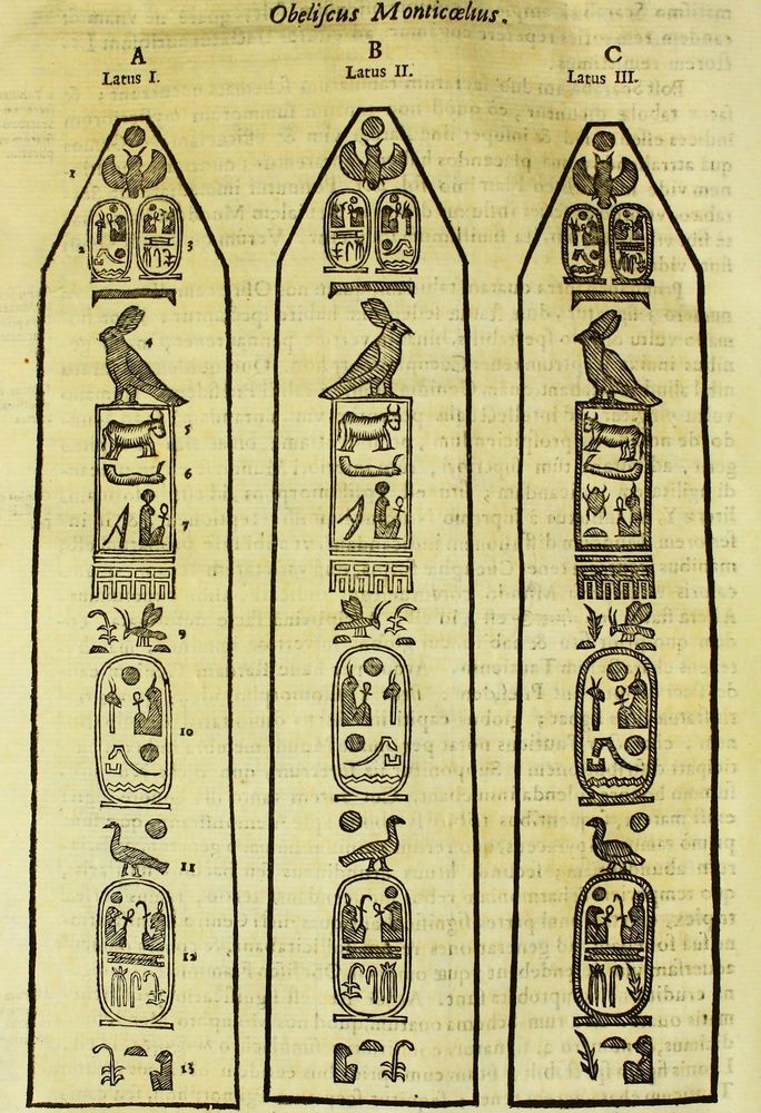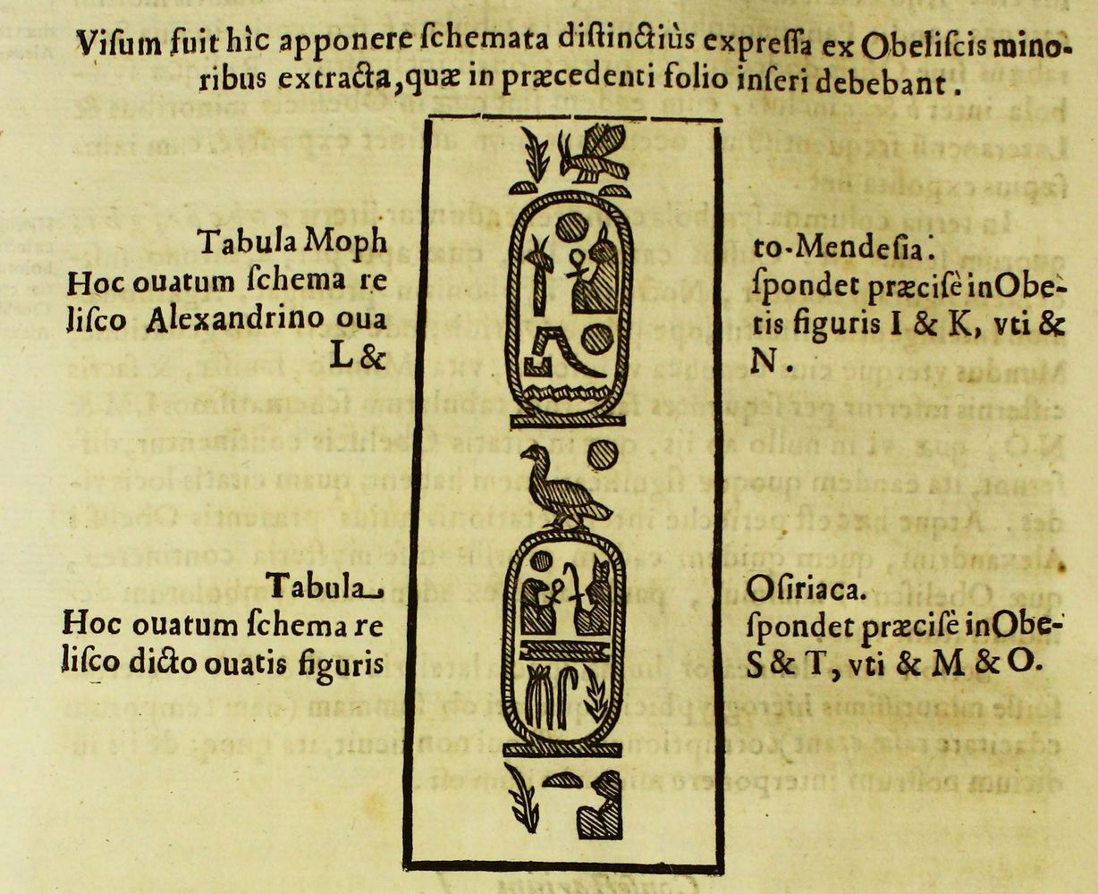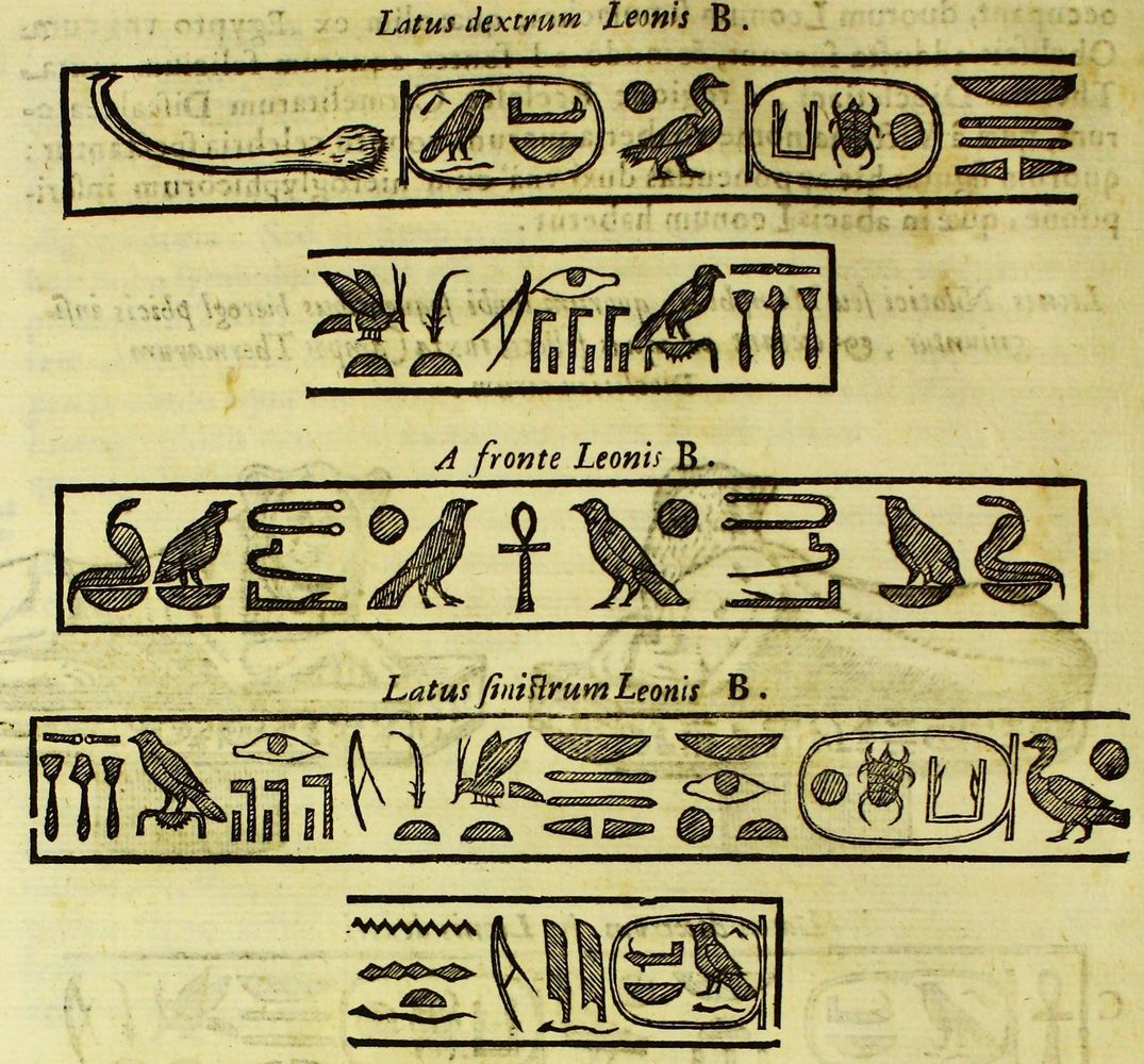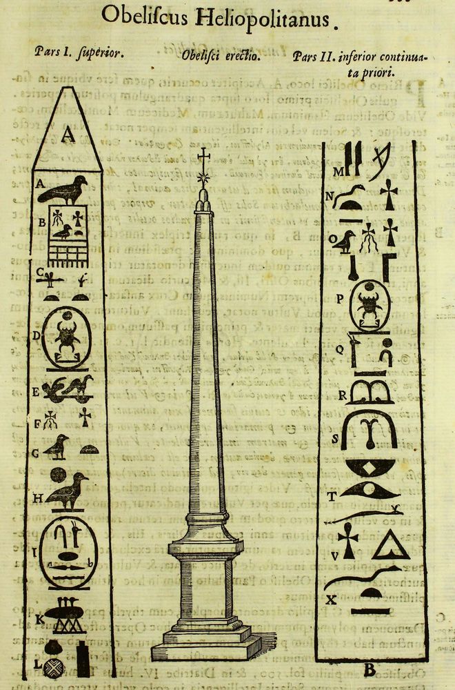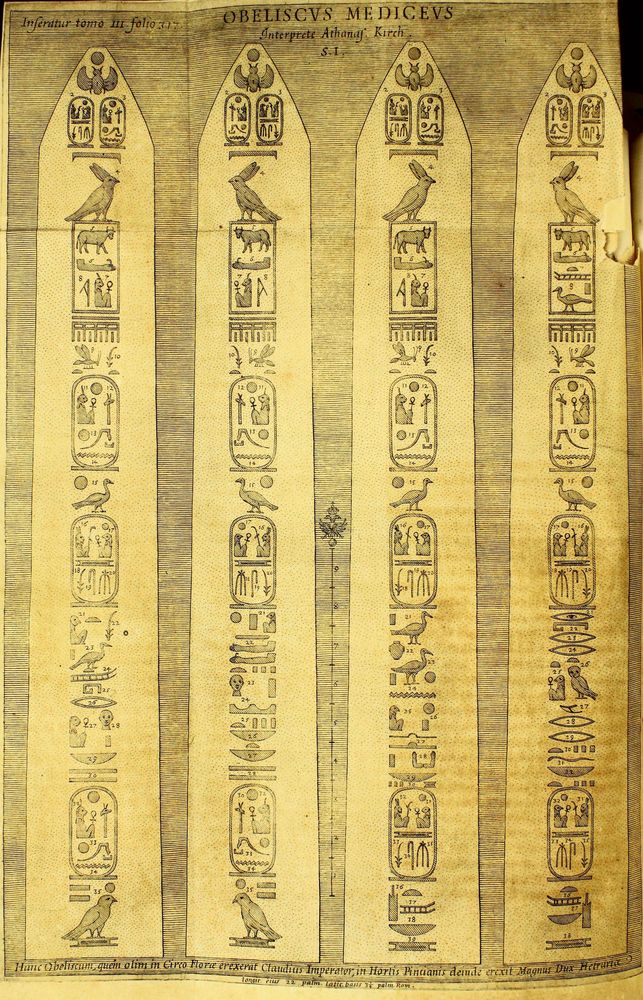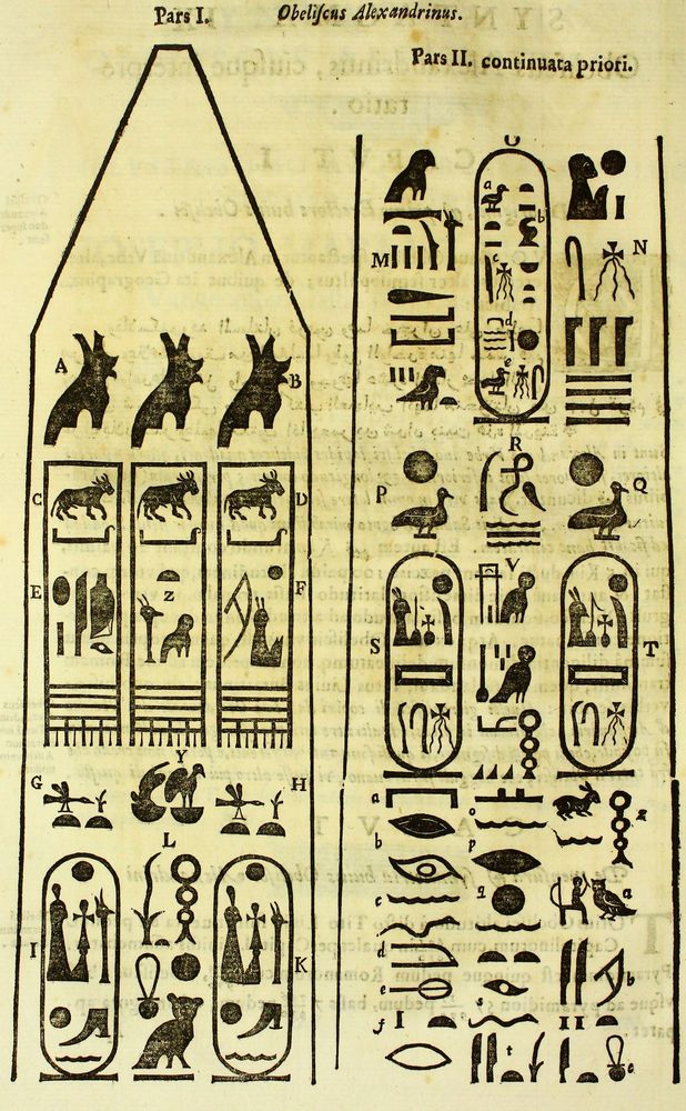 2. D’après De Backer, I, 422-433 et VII, 285-287 […] 10. Athanasii Kircheri e Soc. Jesu Œdipus Ægyptiacus […] C’est l’ouvrage le plus important du P. Kircher, et le plus recherché des curieux malgré le peu de solidité de son système. Il lui avait coûté vingt années de recherches, et de travaux. Kircher s’était persuadé que les prêtres d’Egypte avaient inventé les hiéroglyphes pour cacher au vulgaire leur doctrine secrète ; et il est parti de ce principe pour donner à des caractères de cette espèce une interprétation ingénieuse, mais arbitraire. Le savant Jean Wilkins n’a vu au contraire, dans les hiéroglyphes, que les essais grossiers qui ont dû nécessairement précéder l’invention des lettres de l’alphabet ; et ce sentiment paraît d’autant mieux fondé qu’on a trouvé chez les Mexicains de véritables peintures hiéroglyphiques, et que l’écriture égyptienne, comme celle des Chinois, n’est peut-être qu’un perfectionnement des anciens hiéroglyphes. Voyez l’essai sur les hiéroglyphes, par Warburton, et surtout le traité de Zoëga, De Origine et usu obeliscorum.