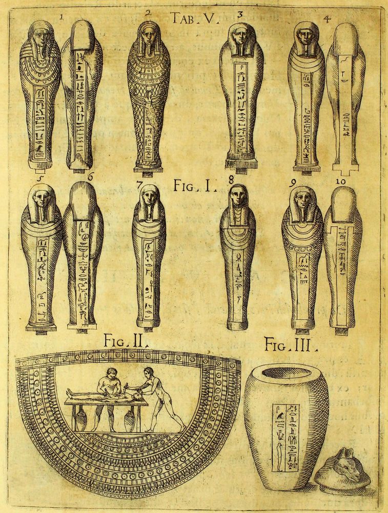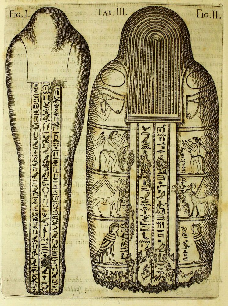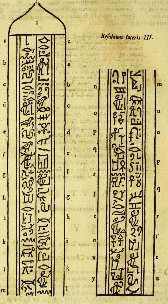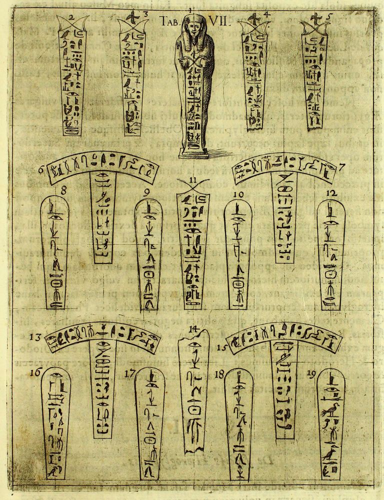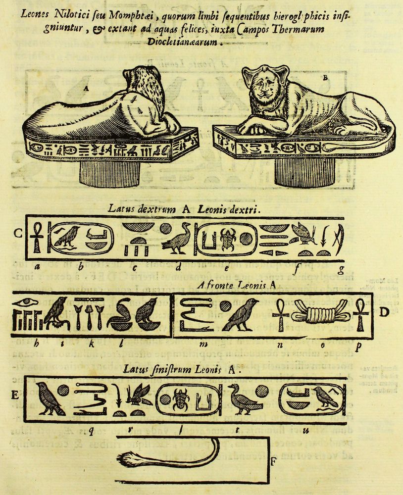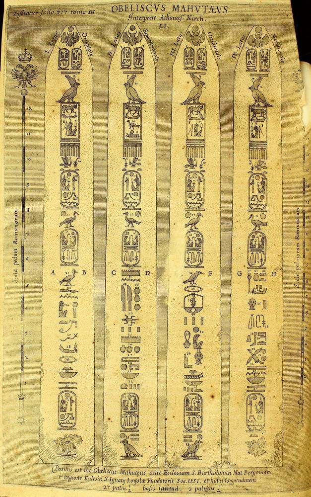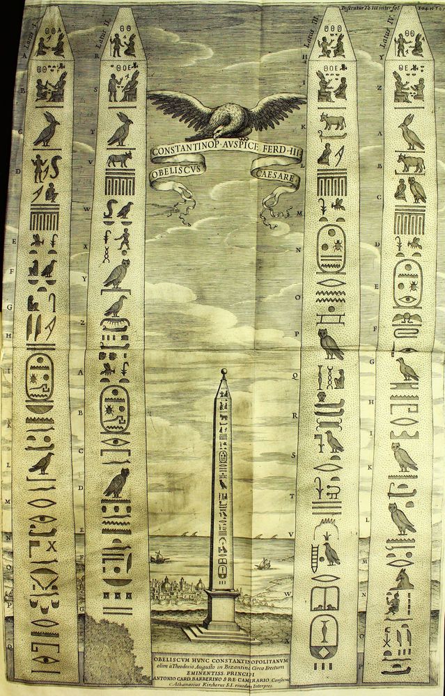 2. D’après De Backer, I, 422-433 et VII, 285-287 […] 10. Athanasii Kircheri e Soc. Jesu Œdipus Ægyptiacus […] C’est l’ouvrage le plus important du P. Kircher, et le plus recherché des curieux malgré le peu de solidité de son système. Il lui avait coûté vingt années de recherches, et de travaux. Kircher s’était persuadé que les prêtres d’Egypte avaient inventé les hiéroglyphes pour cacher au vulgaire leur doctrine secrète ; et il est parti de ce principe pour donner à des caractères de cette espèce une interprétation ingénieuse, mais arbitraire. Le savant Jean Wilkins n’a vu au contraire, dans les hiéroglyphes, que les essais grossiers qui ont dû nécessairement précéder l’invention des lettres de l’alphabet ; et ce sentiment paraît d’autant mieux fondé qu’on a trouvé chez les Mexicains de véritables peintures hiéroglyphiques, et que l’écriture égyptienne, comme celle des Chinois, n’est peut-être qu’un perfectionnement des anciens hiéroglyphes. Voyez l’essai sur les hiéroglyphes, par Warburton, et surtout le traité de Zoëga, De Origine et usu obeliscorum.