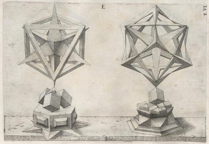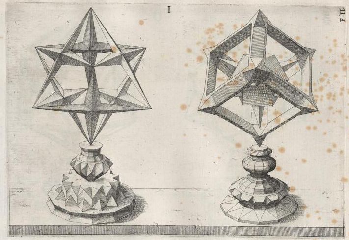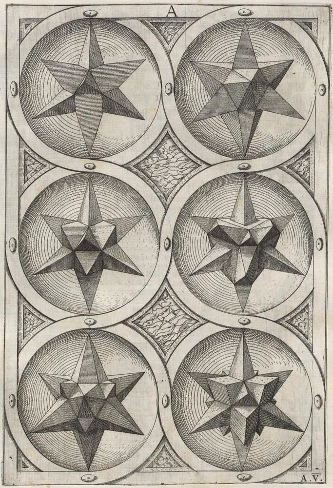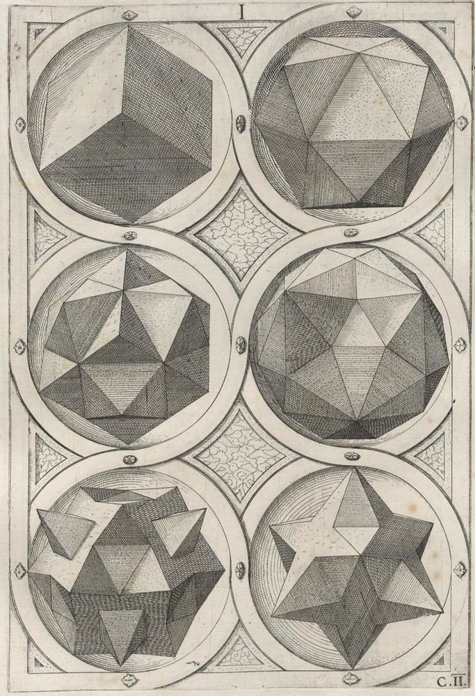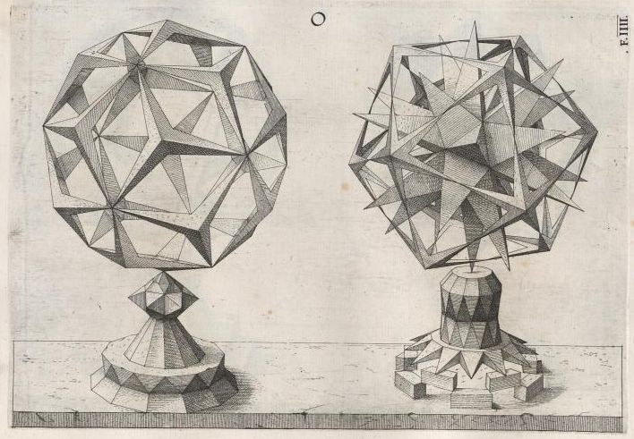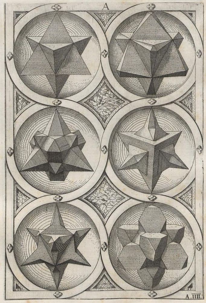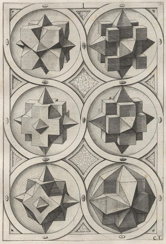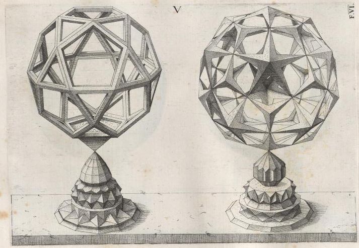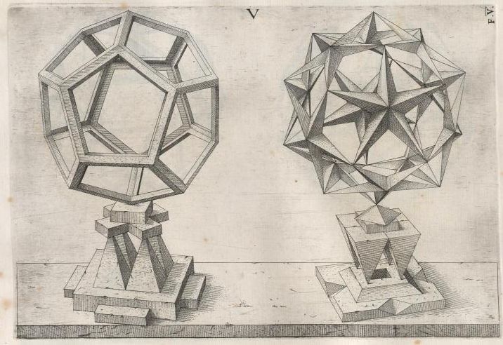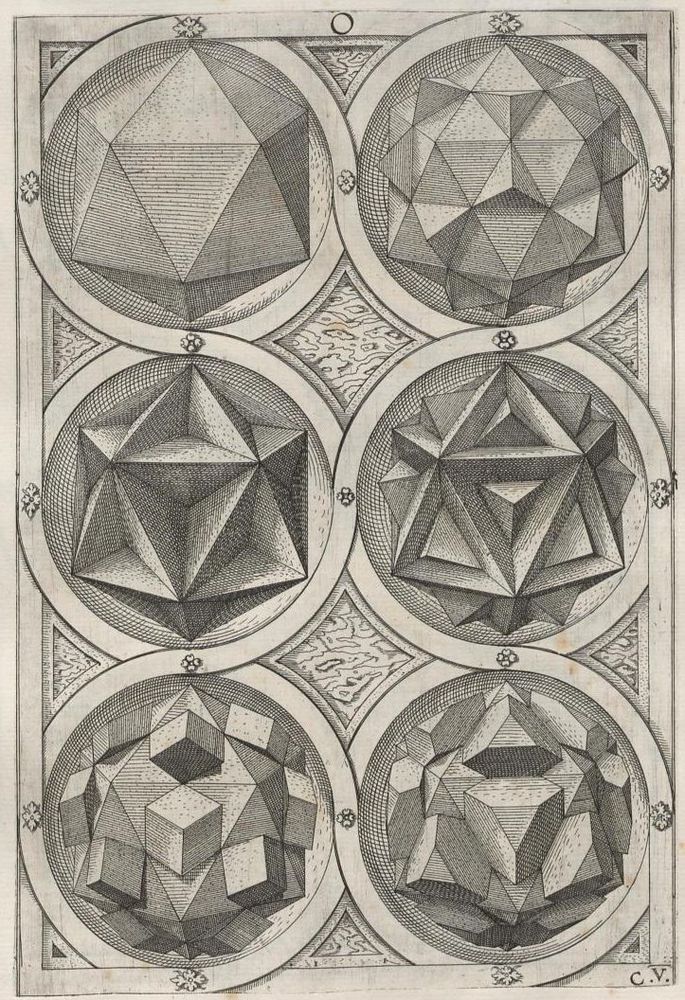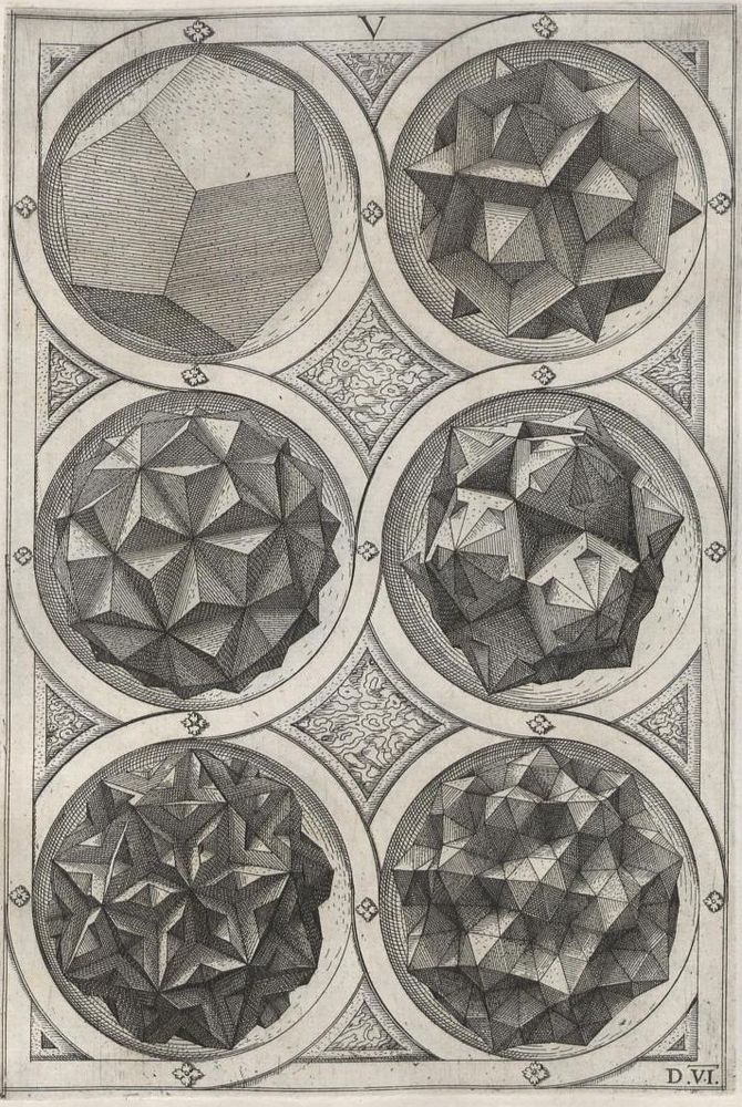 ► L’ouvrage est dédié à l’étude des solides exposés dans le Timée et les Éléments d’Euclide. L’auteur, orfèvre viennois, en tire 120 variations polyédrales, régulières, tronquées et étoilées ainsi que diverses projections géométriques. Dans la lignée d’un Dürer ou de De Vinci 👁, les considérations pythagoriciennes de cet ouvrage de perspective concernent aussi bien le domaine intellectuel qu’artistique.