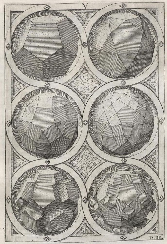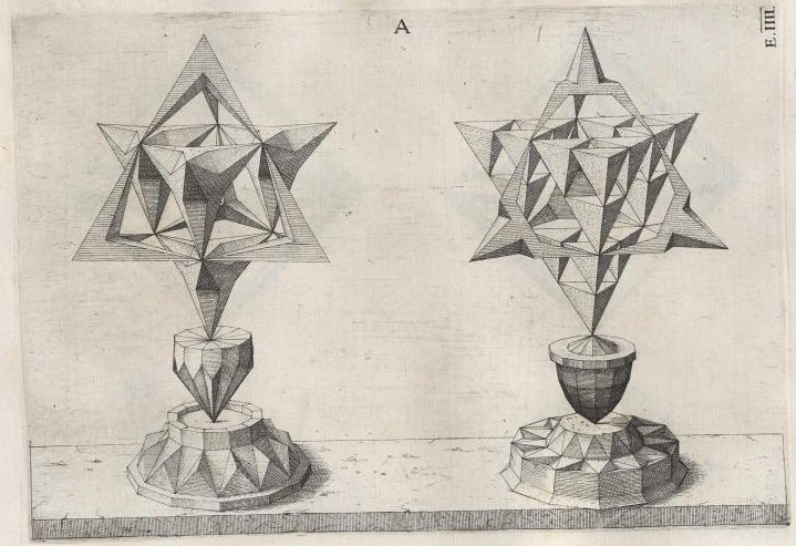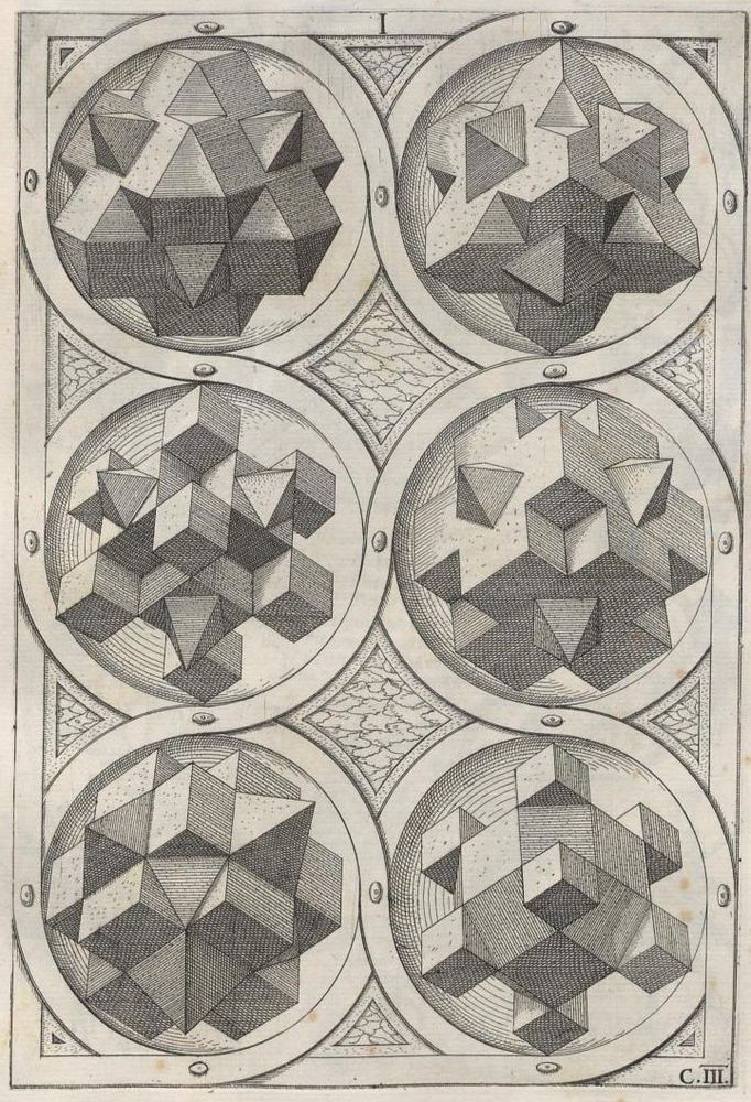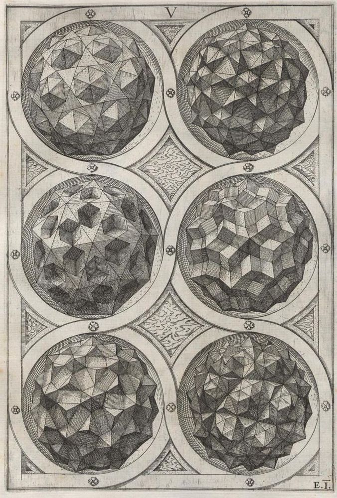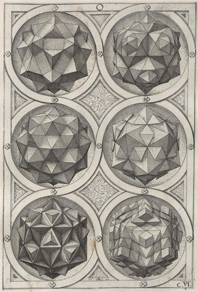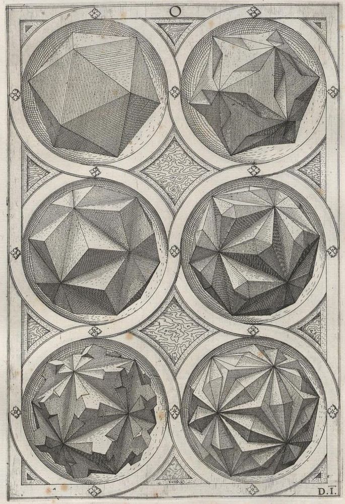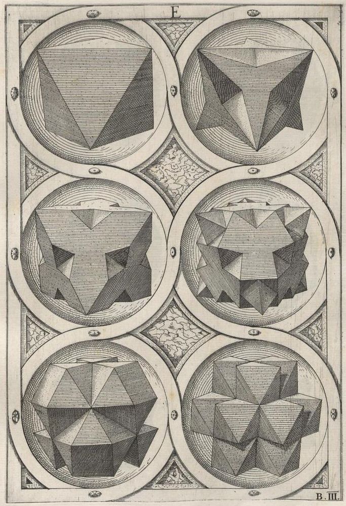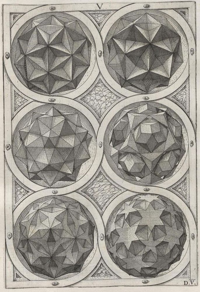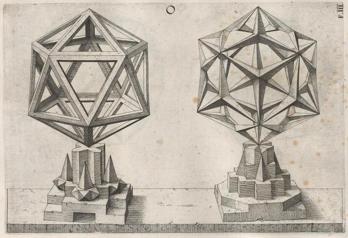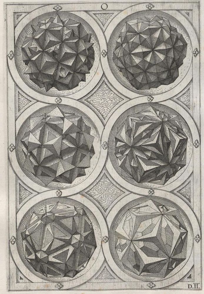 ► L’ouvrage est dédié à l’étude des solides exposés dans le Timée et les Éléments d’Euclide. L’auteur, orfèvre viennois, en tire 120 variations polyédrales, régulières, tronquées et étoilées ainsi que diverses projections géométriques. Dans la lignée d’un Dürer ou de De Vinci 👁, les considérations pythagoriciennes de cet ouvrage de perspective concernent aussi bien le domaine intellectuel qu’artistique.