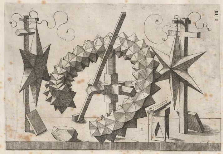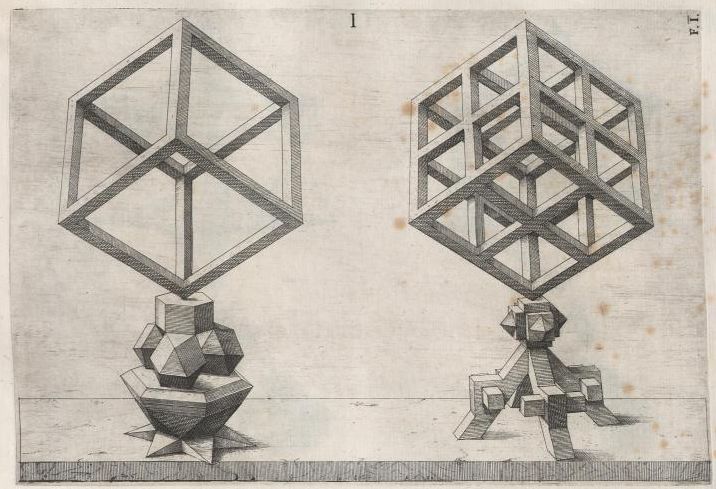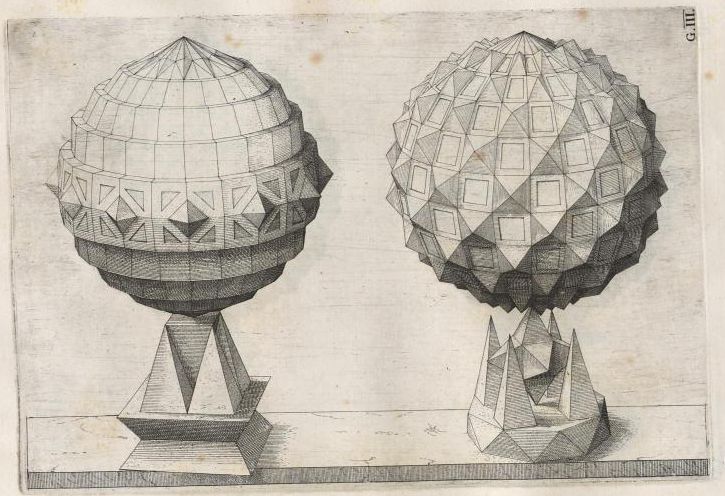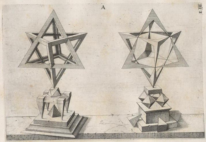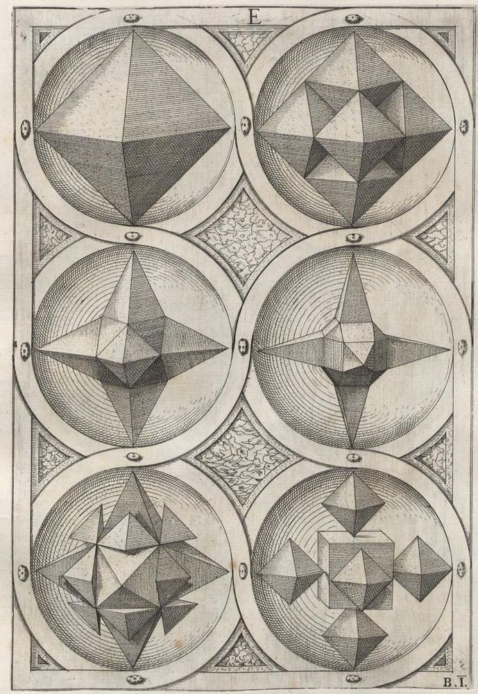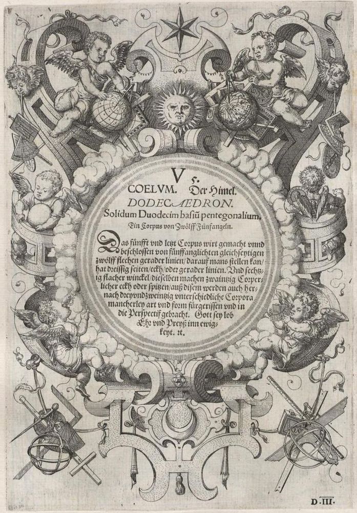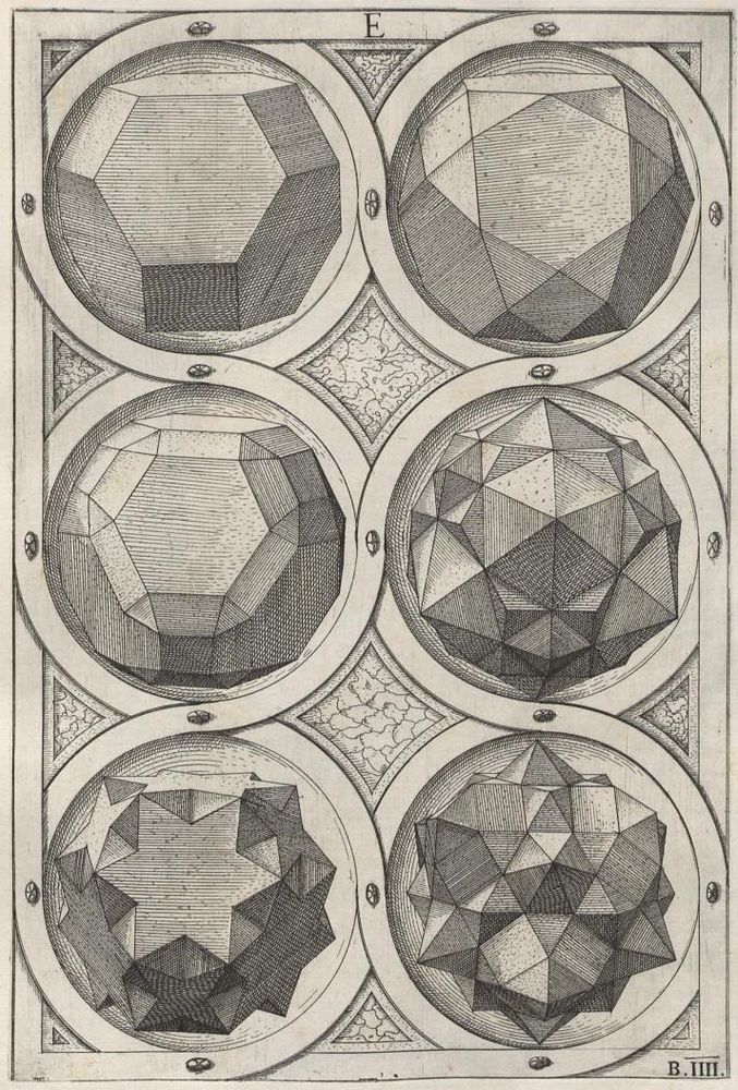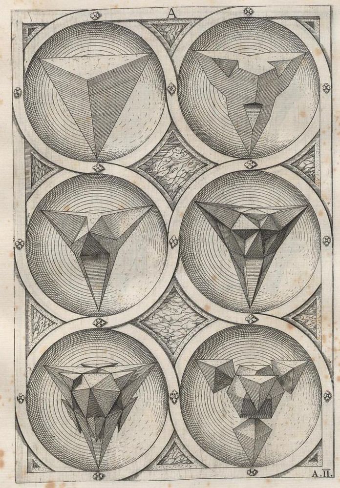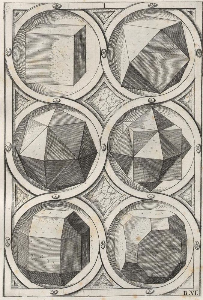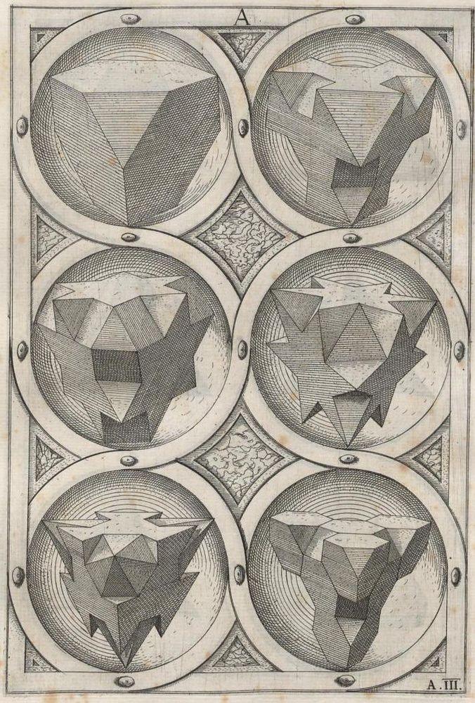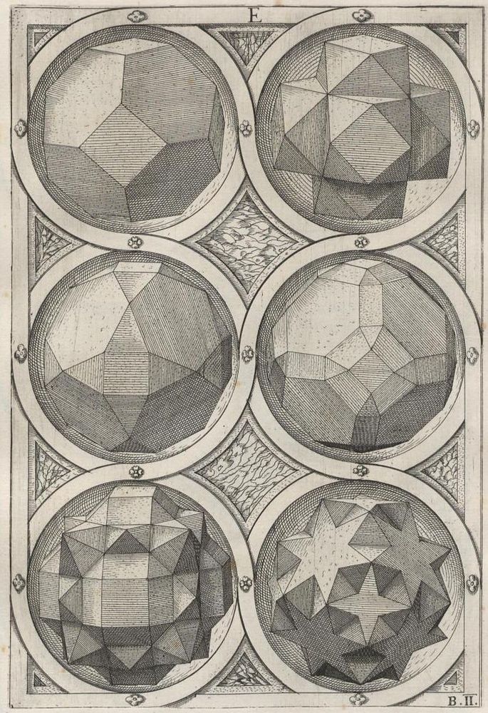 ► L’ouvrage est dédié à l’étude des solides exposés dans le Timée et les Éléments d’Euclide. L’auteur, orfèvre viennois, en tire 120 variations polyédrales, régulières, tronquées et étoilées ainsi que diverses projections géométriques. Dans la lignée d’un Dürer ou de De Vinci 👁, les considérations pythagoriciennes de cet ouvrage de perspective concernent aussi bien le domaine intellectuel qu’artistique.