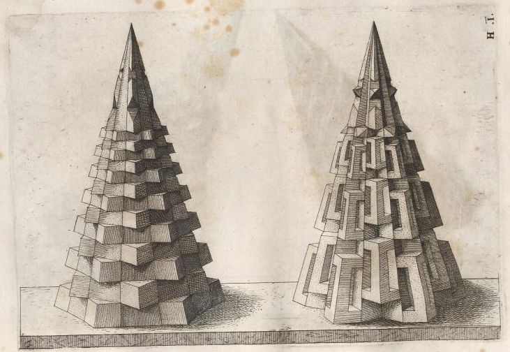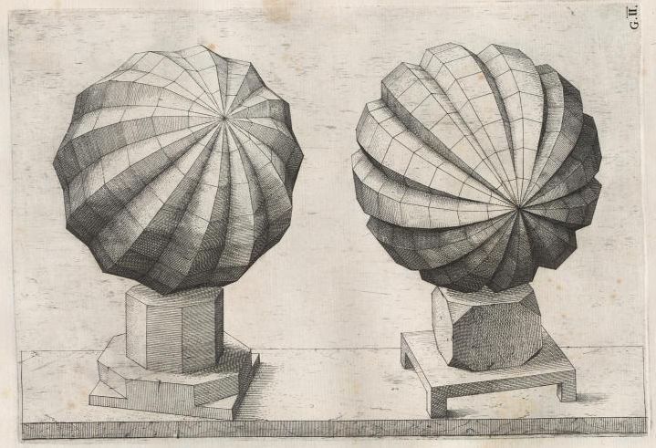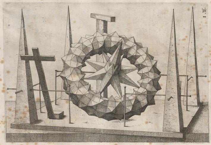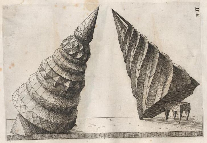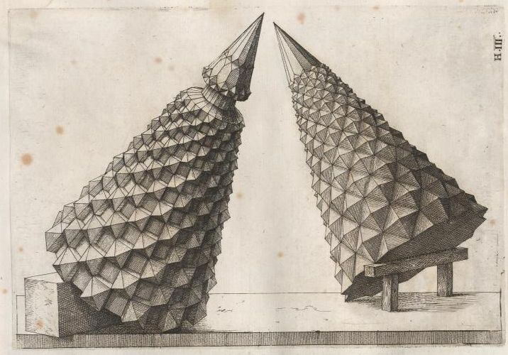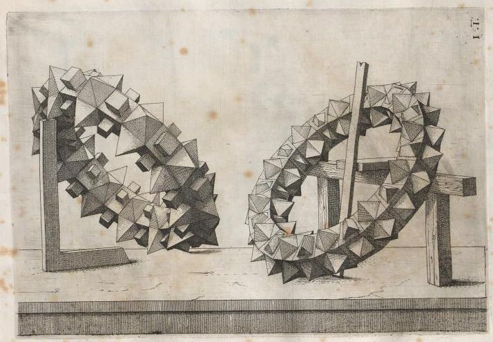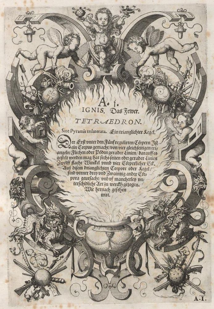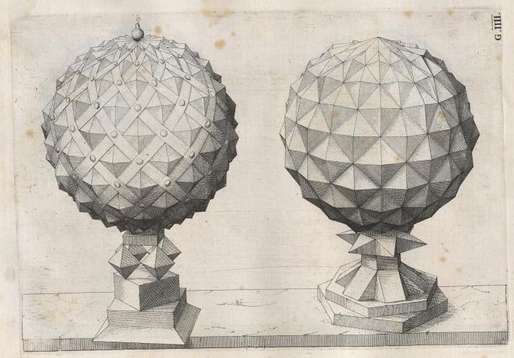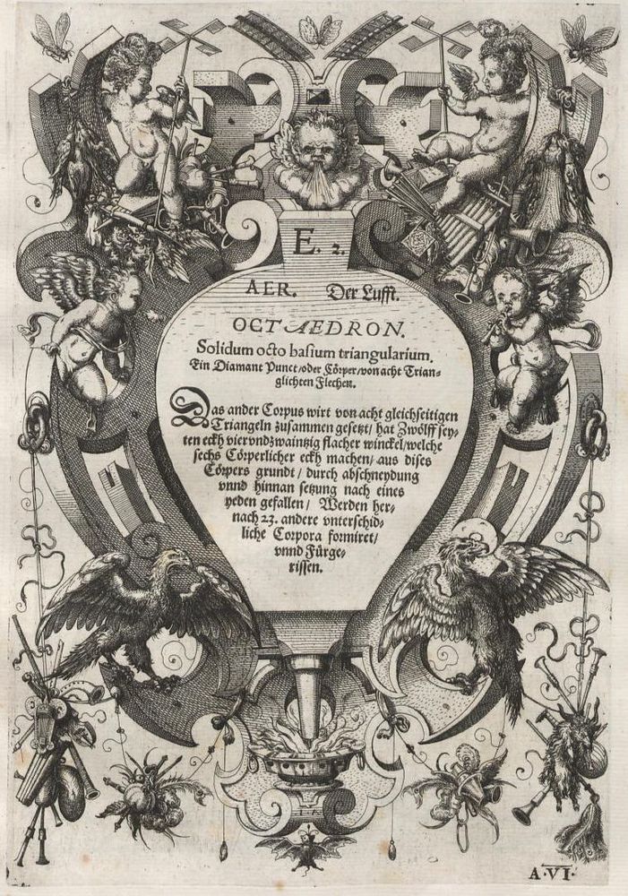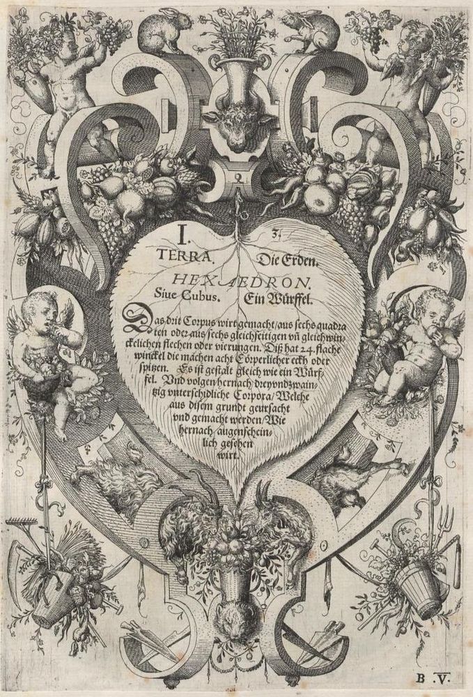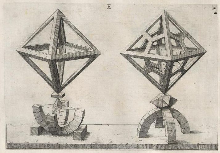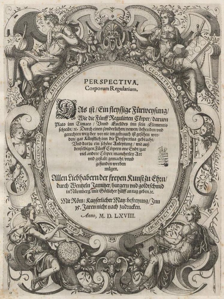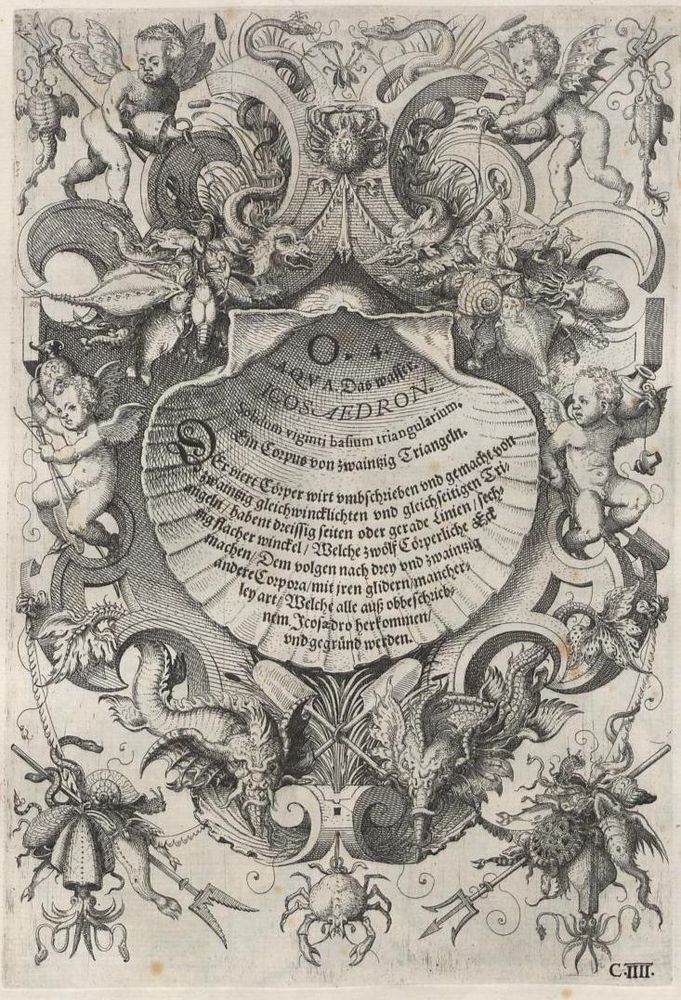 ► L’ouvrage est dédié à l’étude des solides exposés dans le Timée et les Éléments d’Euclide. L’auteur, orfèvre viennois, en tire 120 variations polyédrales, régulières, tronquées et étoilées ainsi que diverses projections géométriques. Dans la lignée d’un Dürer ou de De Vinci 👁, les considérations pythagoriciennes de cet ouvrage de perspective concernent aussi bien le domaine intellectuel qu’artistique.