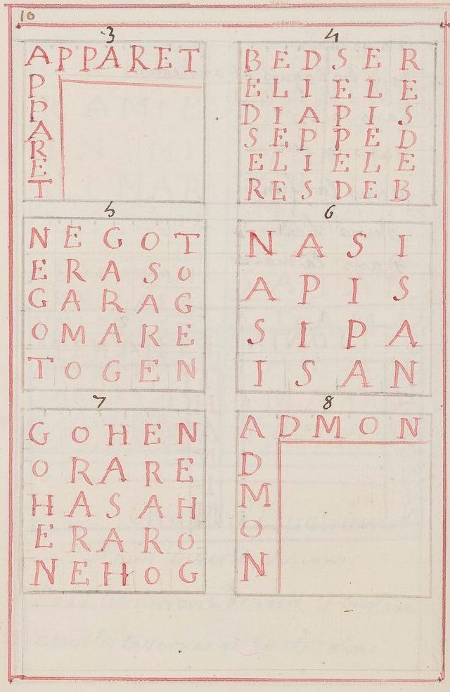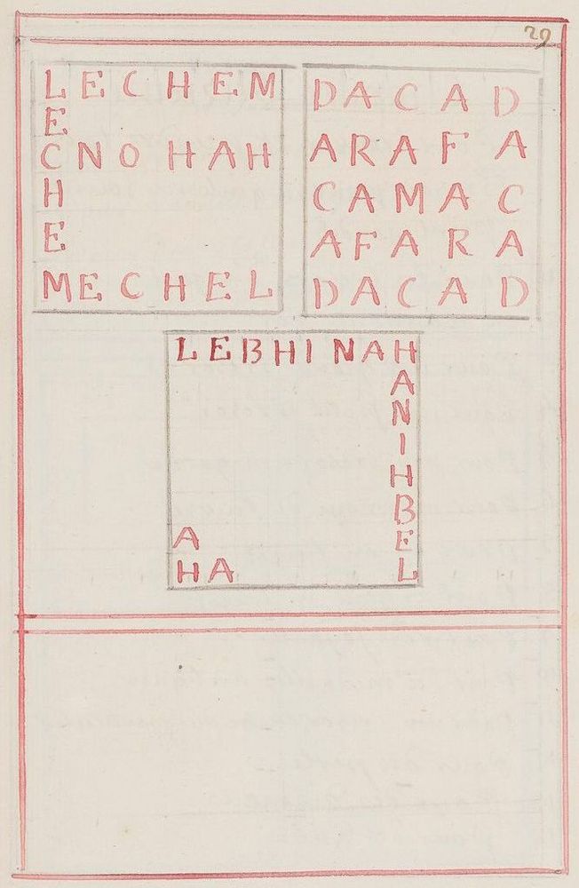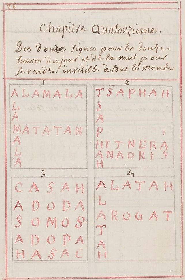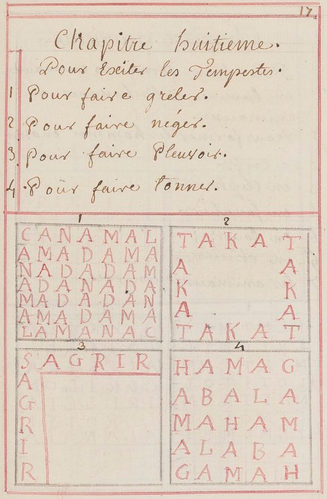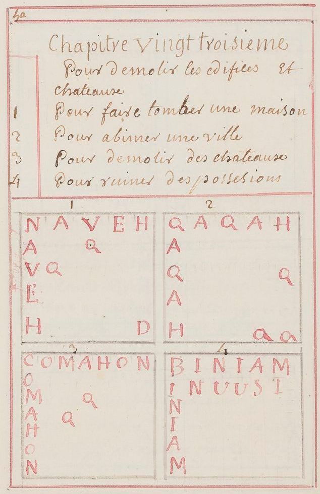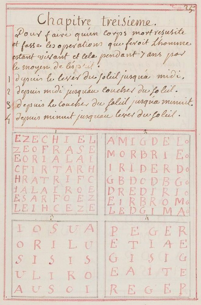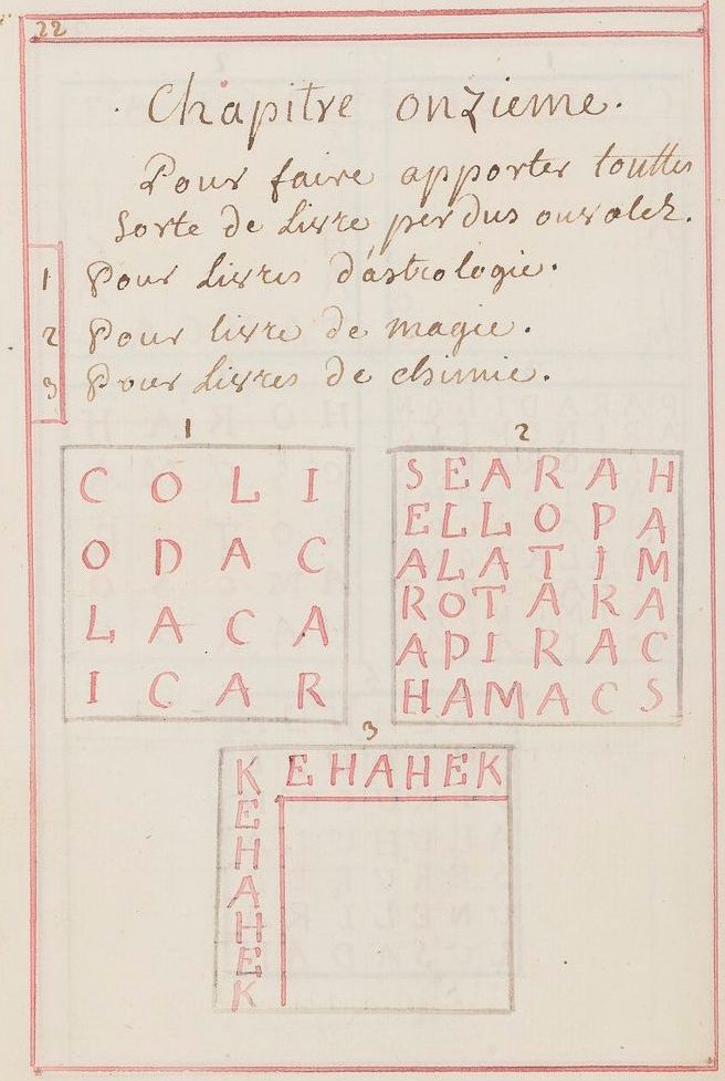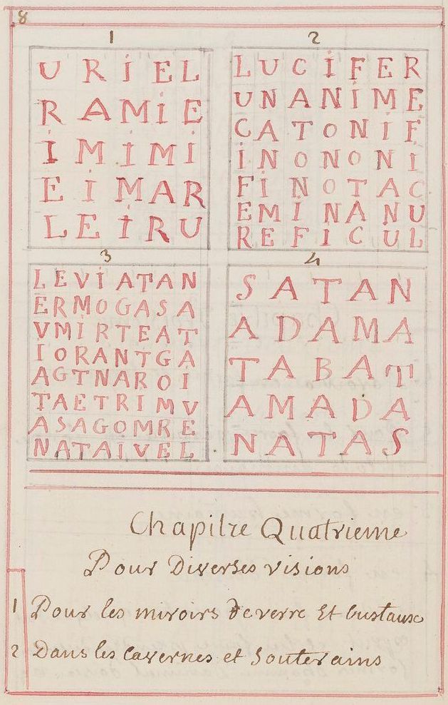 ► L’ouvrage se destine finalement à soumettre des démons. Il transmet ensuite nombre de carrés magiques palindromiques afin d’obtenir l’assistance des hiérarchies infernales ; ces carrés correspondant aux différentes choses que l’on peut demander aux esprits. Pour cette raison l’ouvrage a une réputation ambivalente : tantôt classé en théurgie, tantôt considéré comme un ouvrage crypto-goétique. L’auteur insiste auprès celui qui se destine à pratiquer le rituel : qu’il suive scrupuleusement ses instructions durant les six lunaisons que doit durer l’opération, notamment dans la relation qu’il établira avec les entités angéliques et démoniaques.