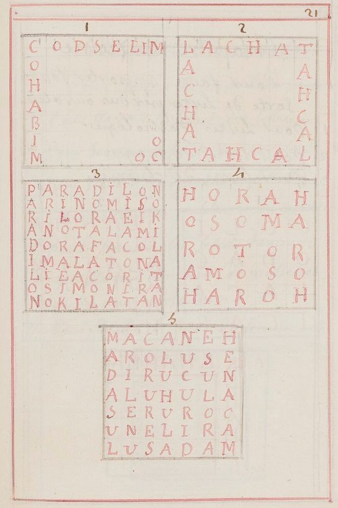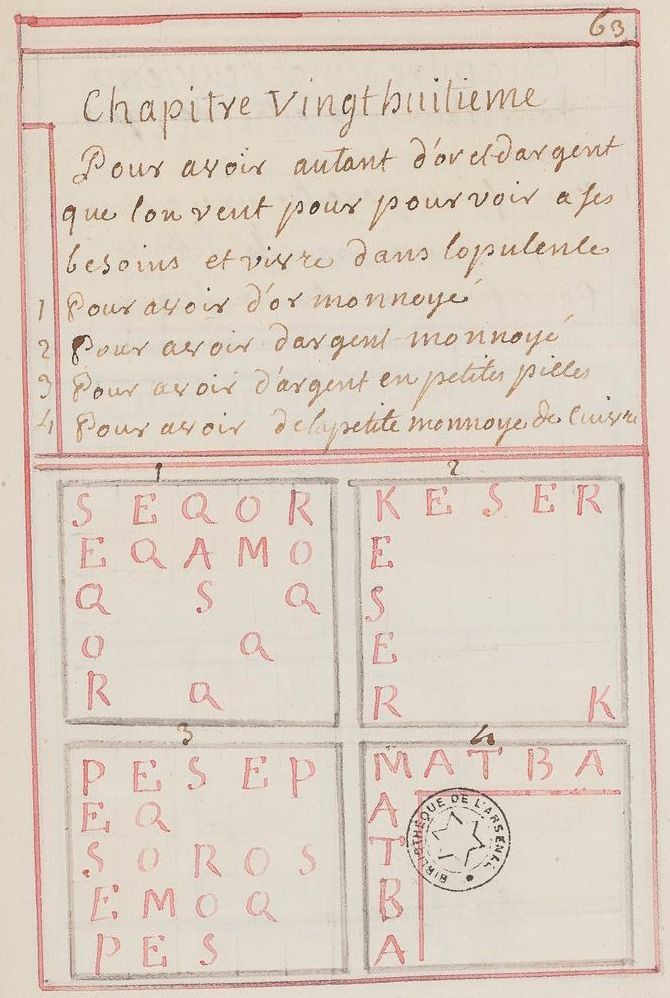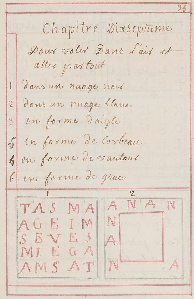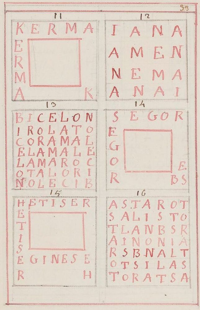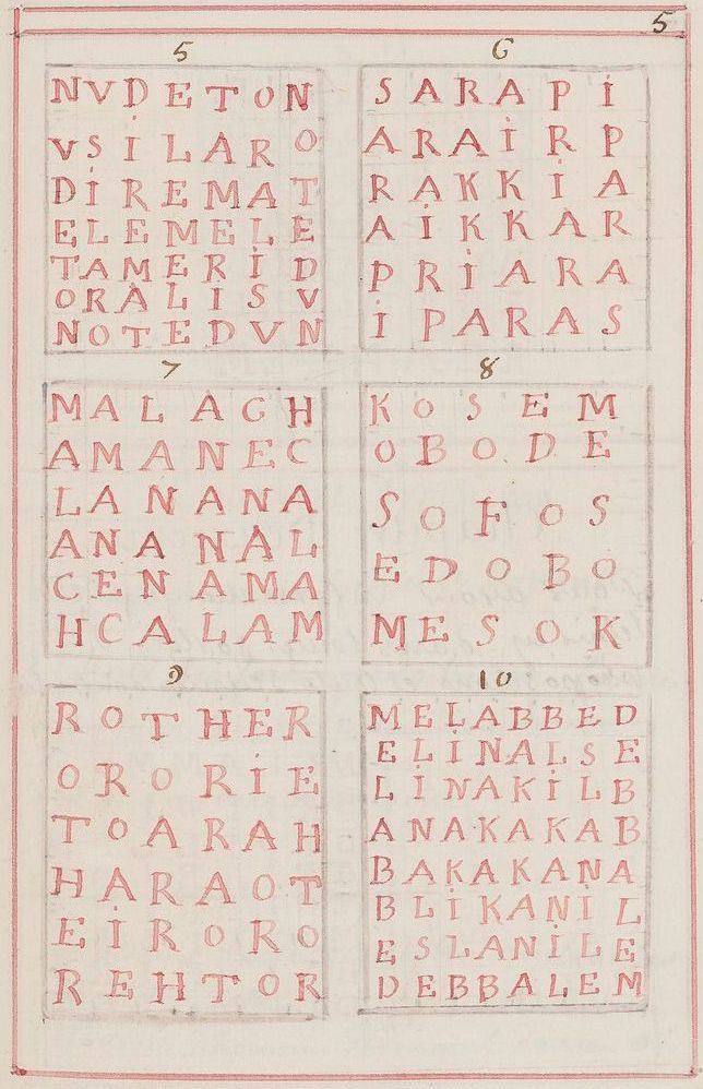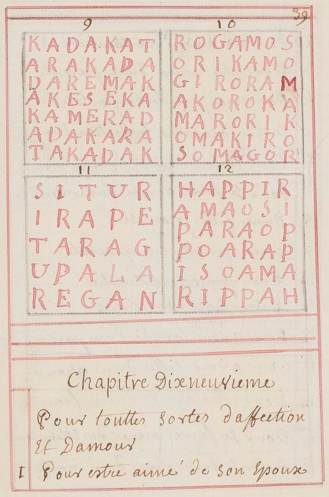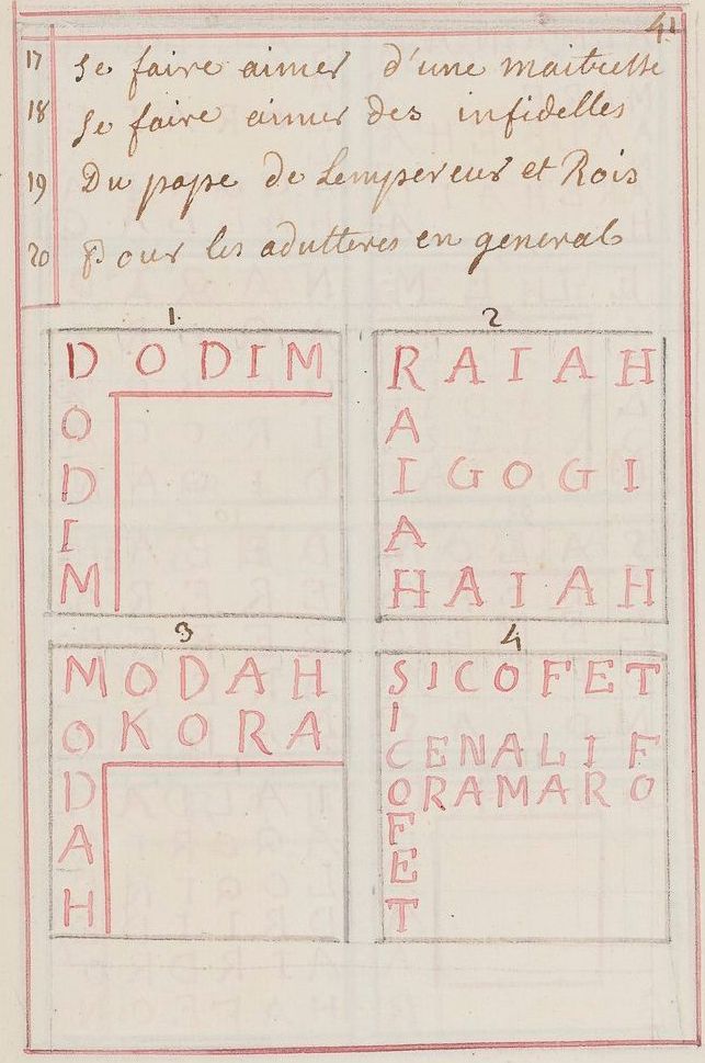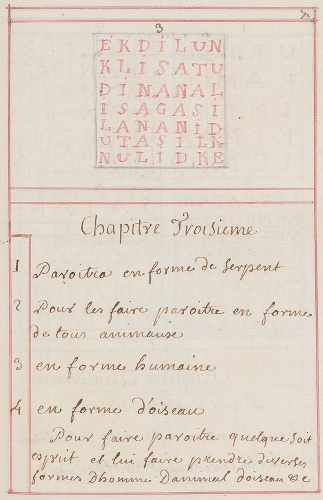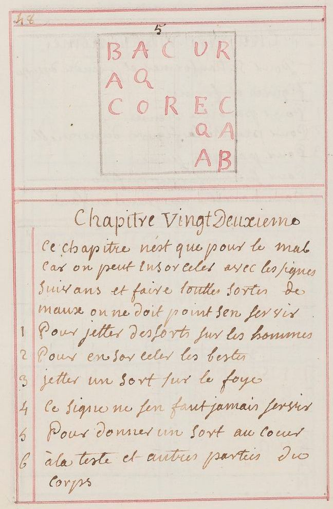 ► L’ouvrage se destine finalement à soumettre des démons. Il transmet ensuite nombre de carrés magiques palindromiques afin d’obtenir l’assistance des hiérarchies infernales ; ces carrés correspondant aux différentes choses que l’on peut demander aux esprits. Pour cette raison l’ouvrage a une réputation ambivalente : tantôt classé en théurgie, tantôt considéré comme un ouvrage crypto-goétique. L’auteur insiste auprès celui qui se destine à pratiquer le rituel : qu’il suive scrupuleusement ses instructions durant les six lunaisons que doit durer l’opération, notamment dans la relation qu’il établira avec les entités angéliques et démoniaques.