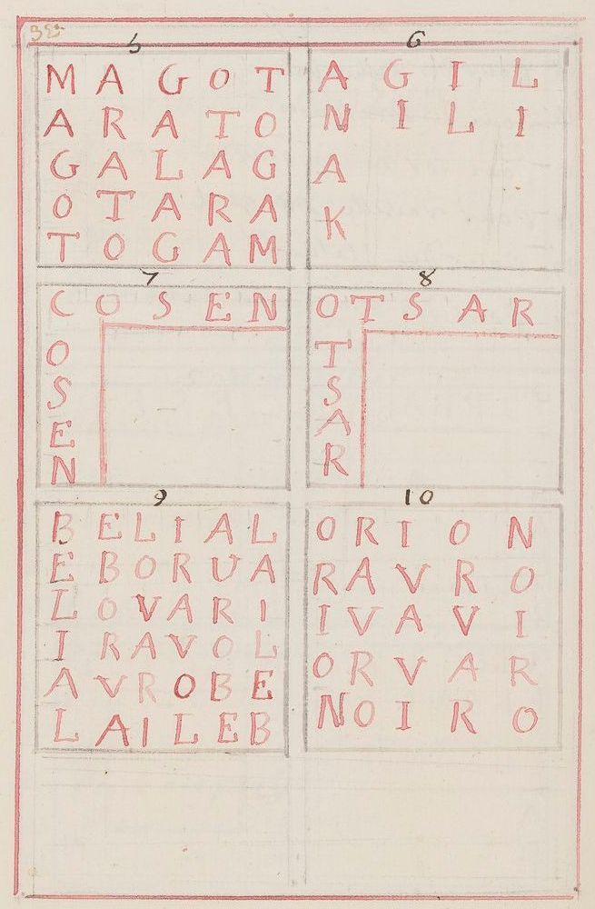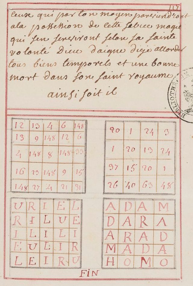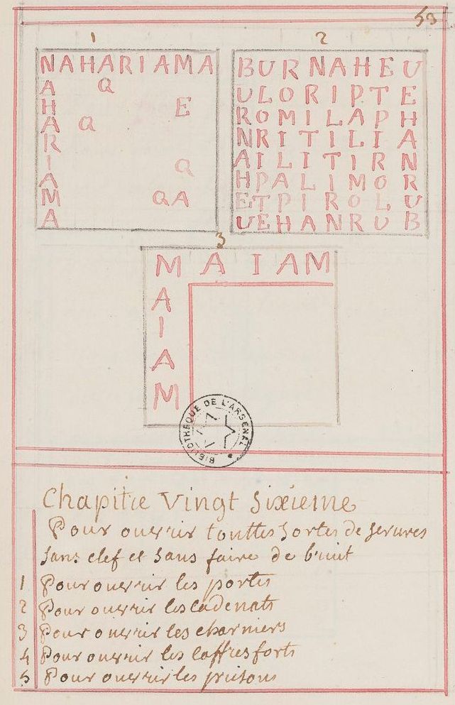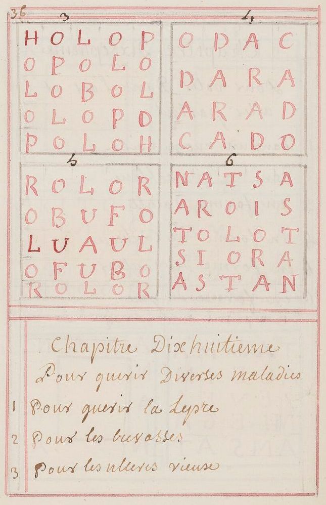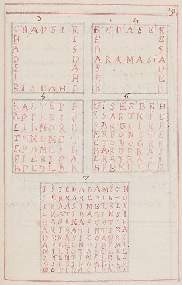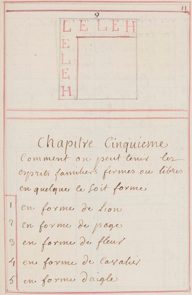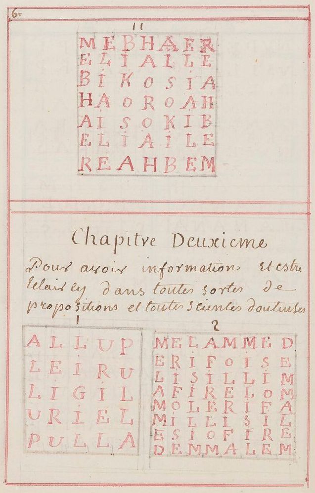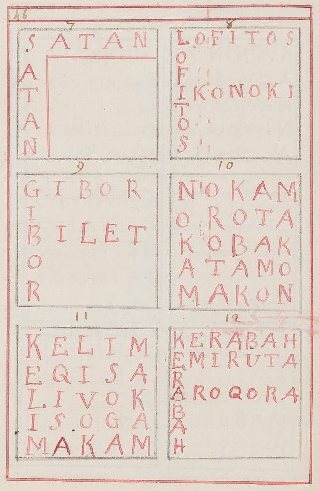 ► L’ouvrage se destine finalement à soumettre des démons. Il transmet ensuite nombre de carrés magiques palindromiques afin d’obtenir l’assistance des hiérarchies infernales ; ces carrés correspondant aux différentes choses que l’on peut demander aux esprits. Pour cette raison l’ouvrage a une réputation ambivalente : tantôt classé en théurgie, tantôt considéré comme un ouvrage crypto-goétique. L’auteur insiste auprès celui qui se destine à pratiquer le rituel : qu’il suive scrupuleusement ses instructions durant les six lunaisons que doit durer l’opération, notamment dans la relation qu’il établira avec les entités angéliques et démoniaques.