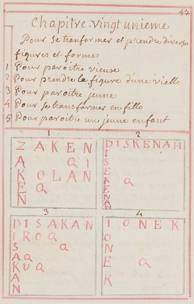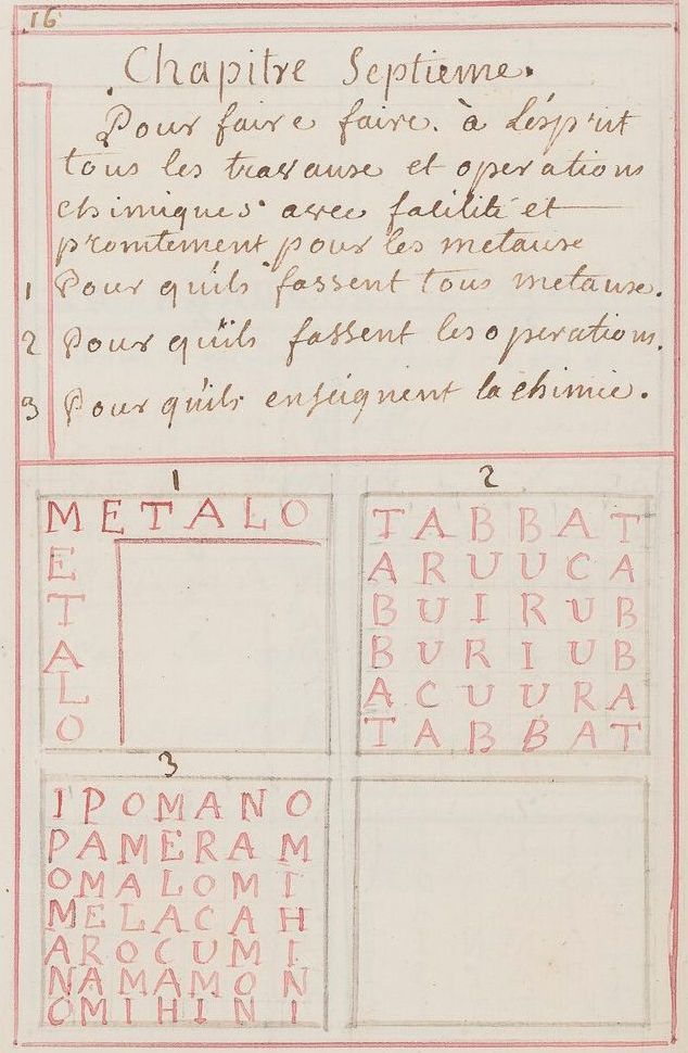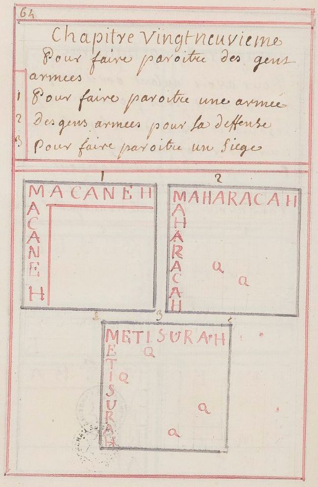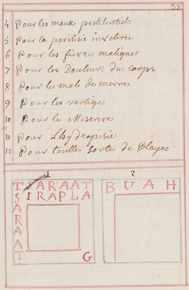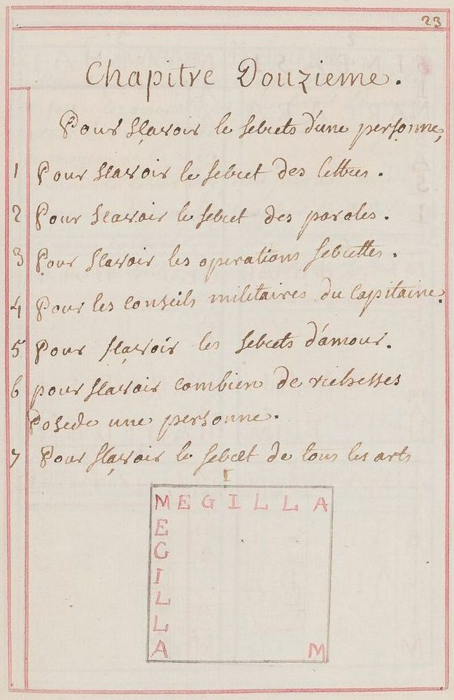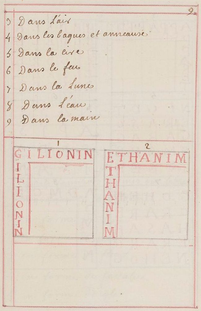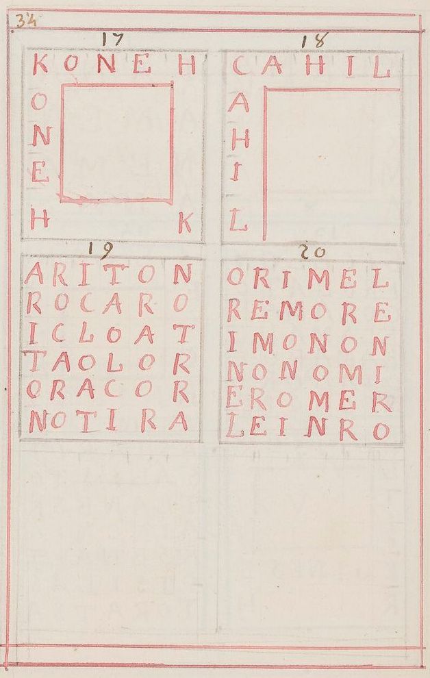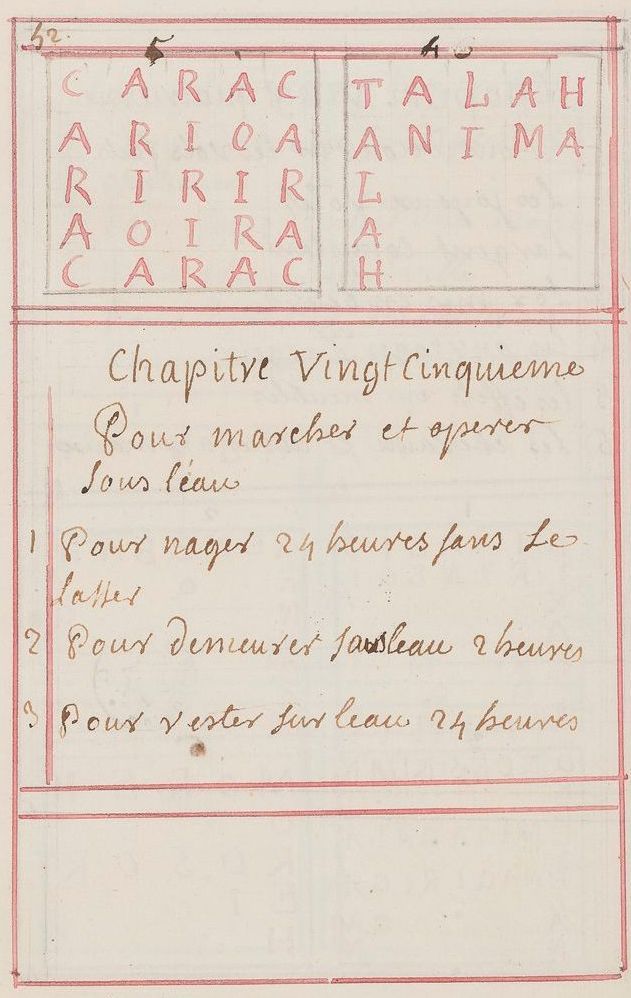 ► L’ouvrage se destine finalement à soumettre des démons. Il transmet ensuite nombre de carrés magiques palindromiques afin d’obtenir l’assistance des hiérarchies infernales ; ces carrés correspondant aux différentes choses que l’on peut demander aux esprits. Pour cette raison l’ouvrage a une réputation ambivalente : tantôt classé en théurgie, tantôt considéré comme un ouvrage crypto-goétique. L’auteur insiste auprès celui qui se destine à pratiquer le rituel : qu’il suive scrupuleusement ses instructions durant les six lunaisons que doit durer l’opération, notamment dans la relation qu’il établira avec les entités angéliques et démoniaques.