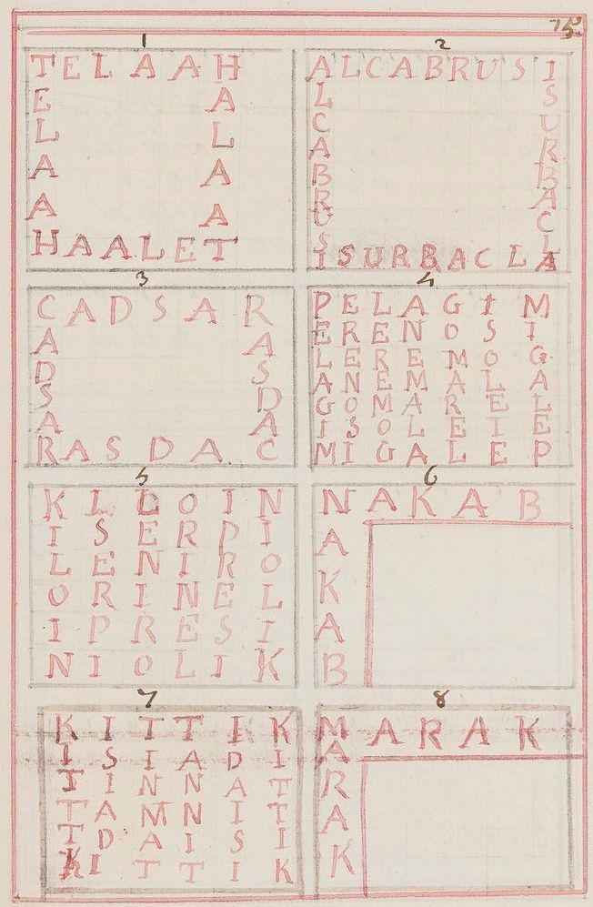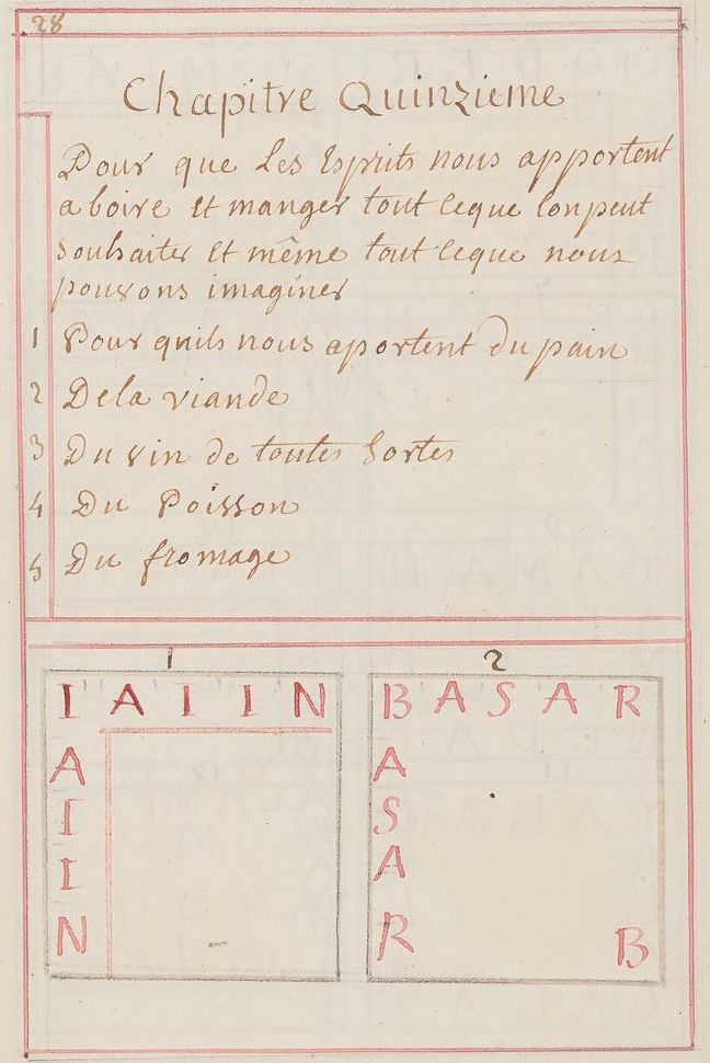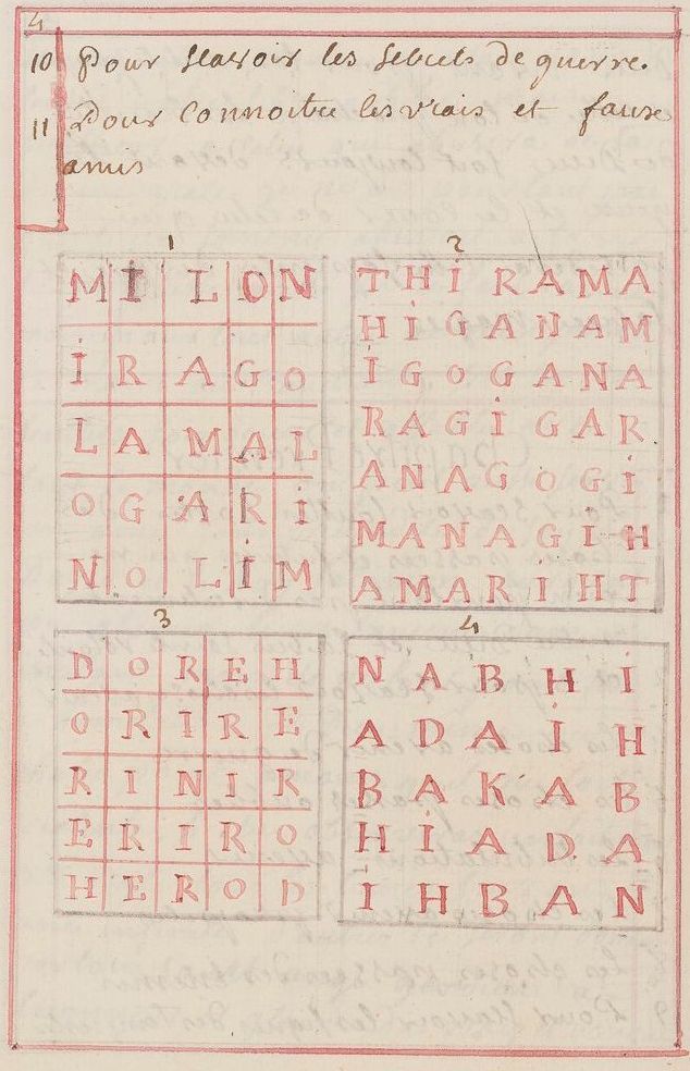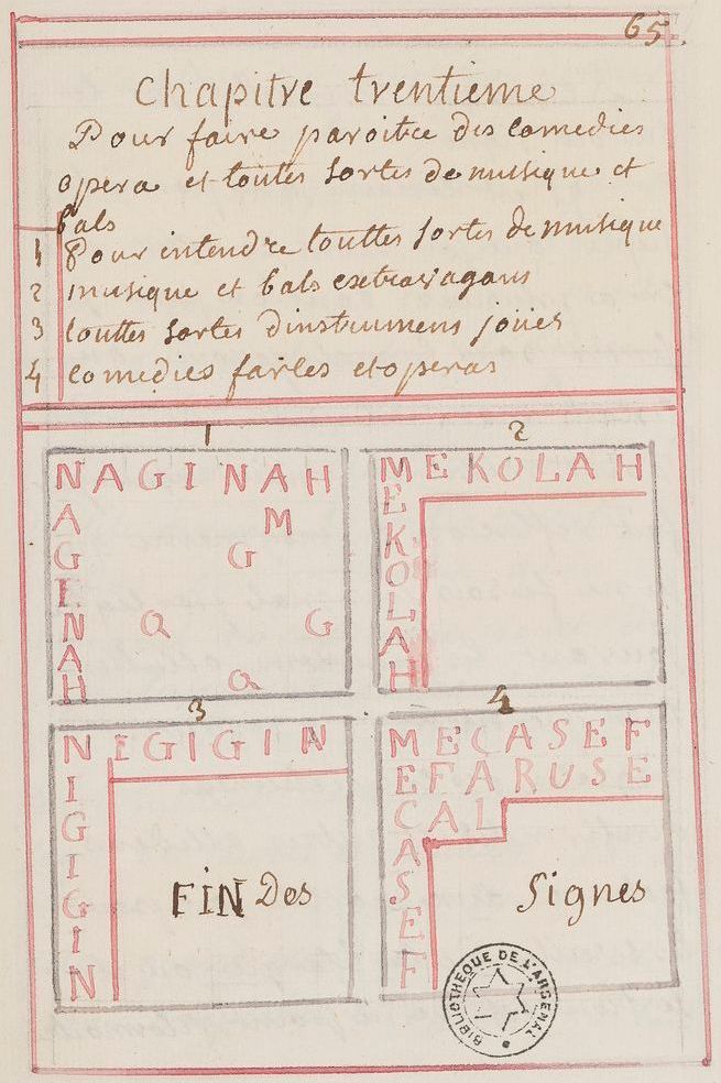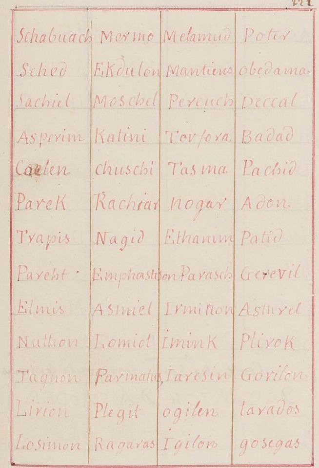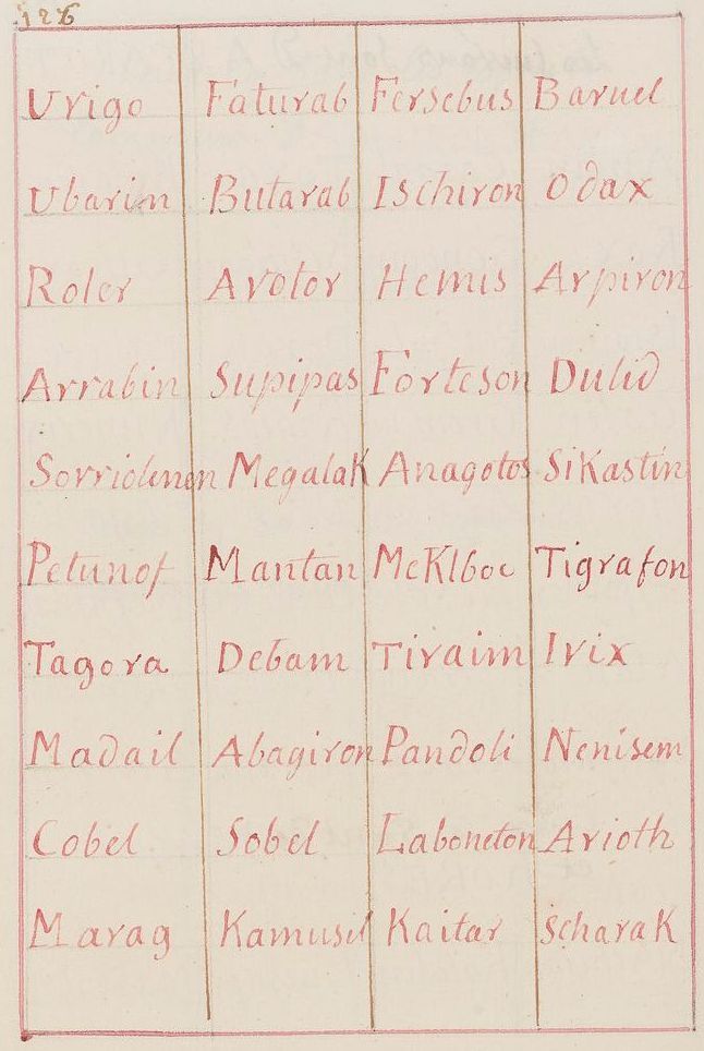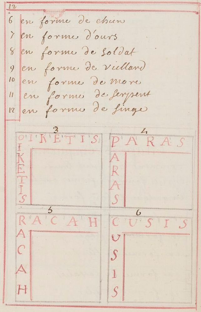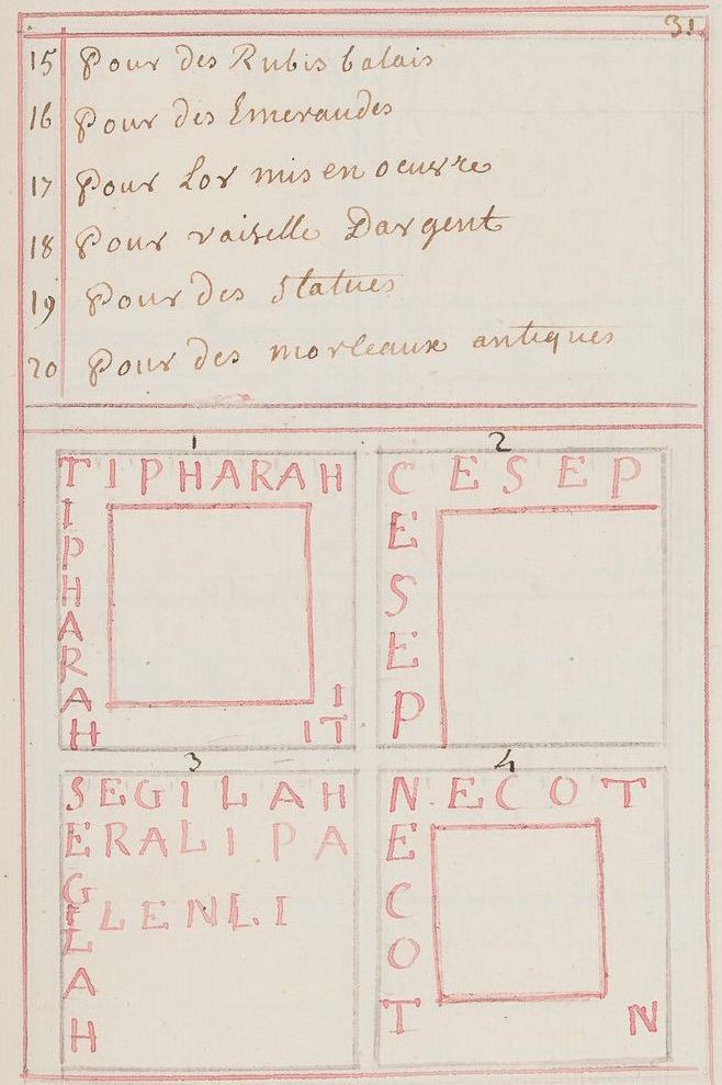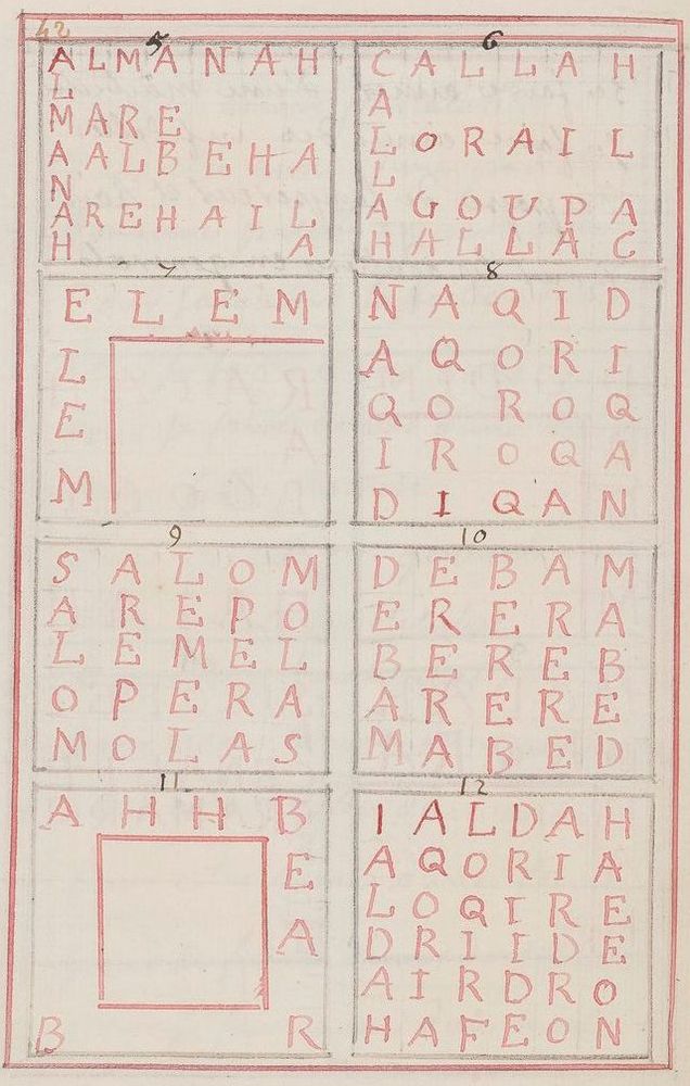 ► L’ouvrage se destine finalement à soumettre des démons. Il transmet ensuite nombre de carrés magiques palindromiques afin d’obtenir l’assistance des hiérarchies infernales ; ces carrés correspondant aux différentes choses que l’on peut demander aux esprits. Pour cette raison l’ouvrage a une réputation ambivalente : tantôt classé en théurgie, tantôt considéré comme un ouvrage crypto-goétique. L’auteur insiste auprès celui qui se destine à pratiquer le rituel : qu’il suive scrupuleusement ses instructions durant les six lunaisons que doit durer l’opération, notamment dans la relation qu’il établira avec les entités angéliques et démoniaques.