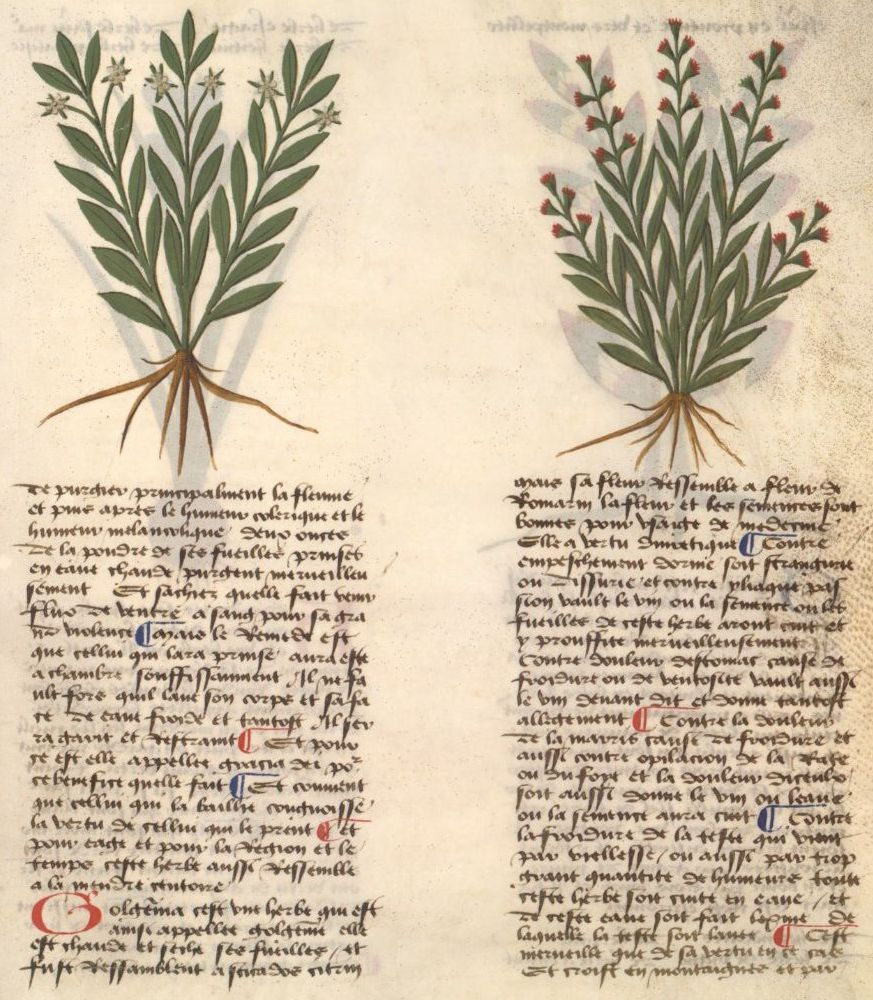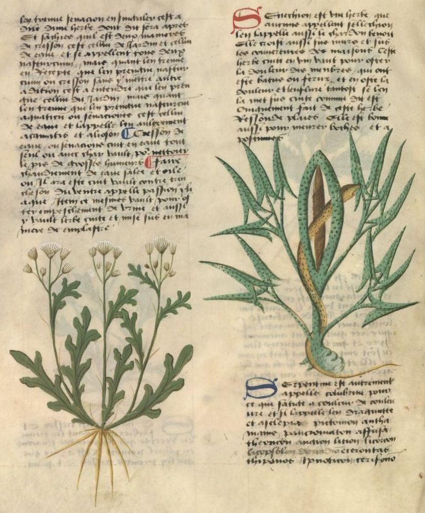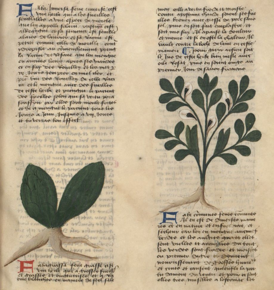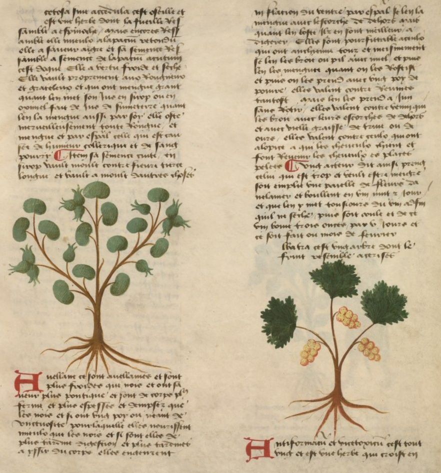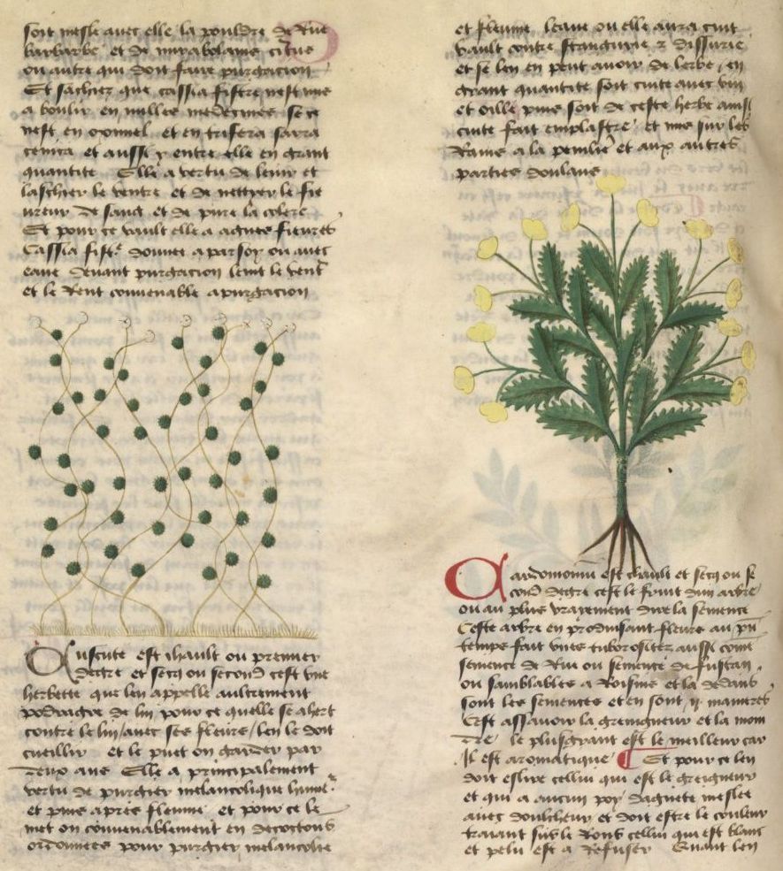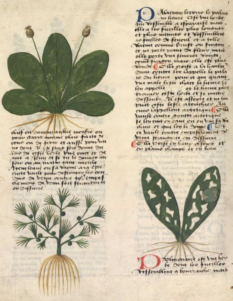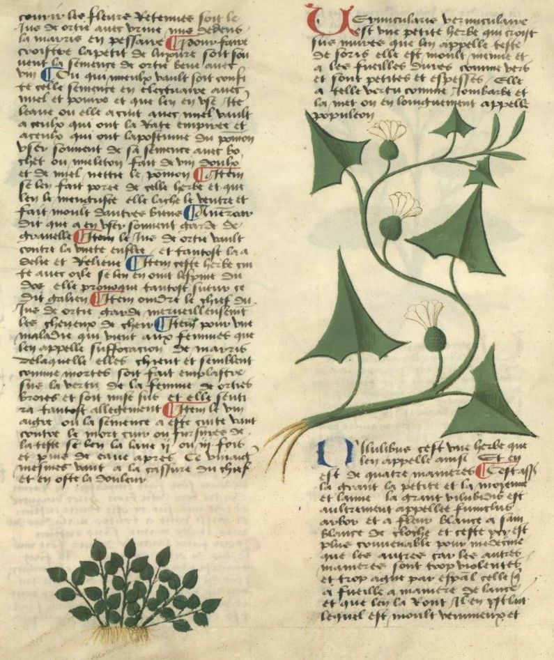 ► Écrit originellement au XII par un médecin italien et essentiellement basé sur le classique précédent, De la Matière médicale, cet herbier est un traité de pharmacopée recensant les plantes médicinales du moyen-âge.