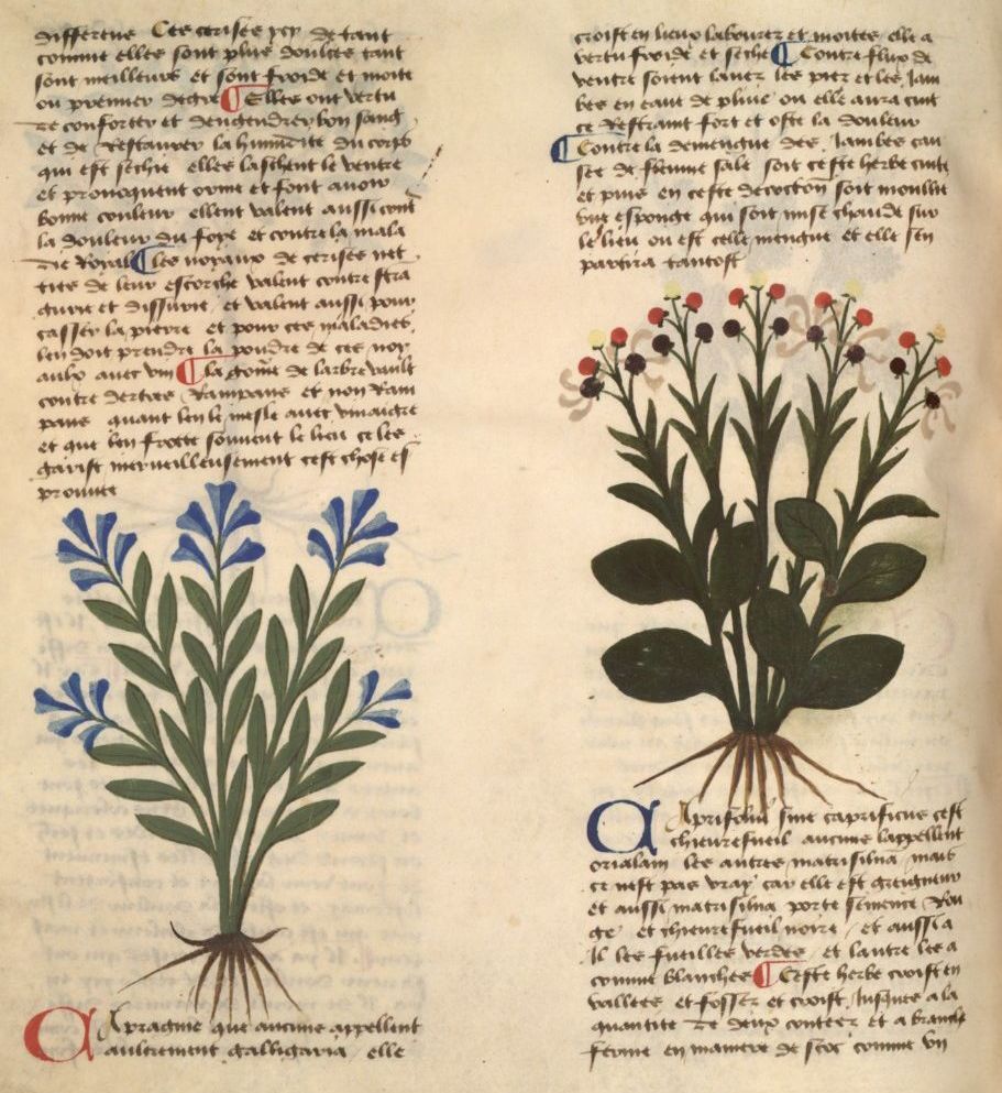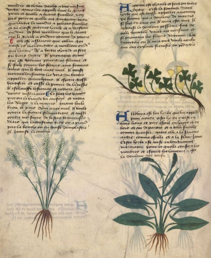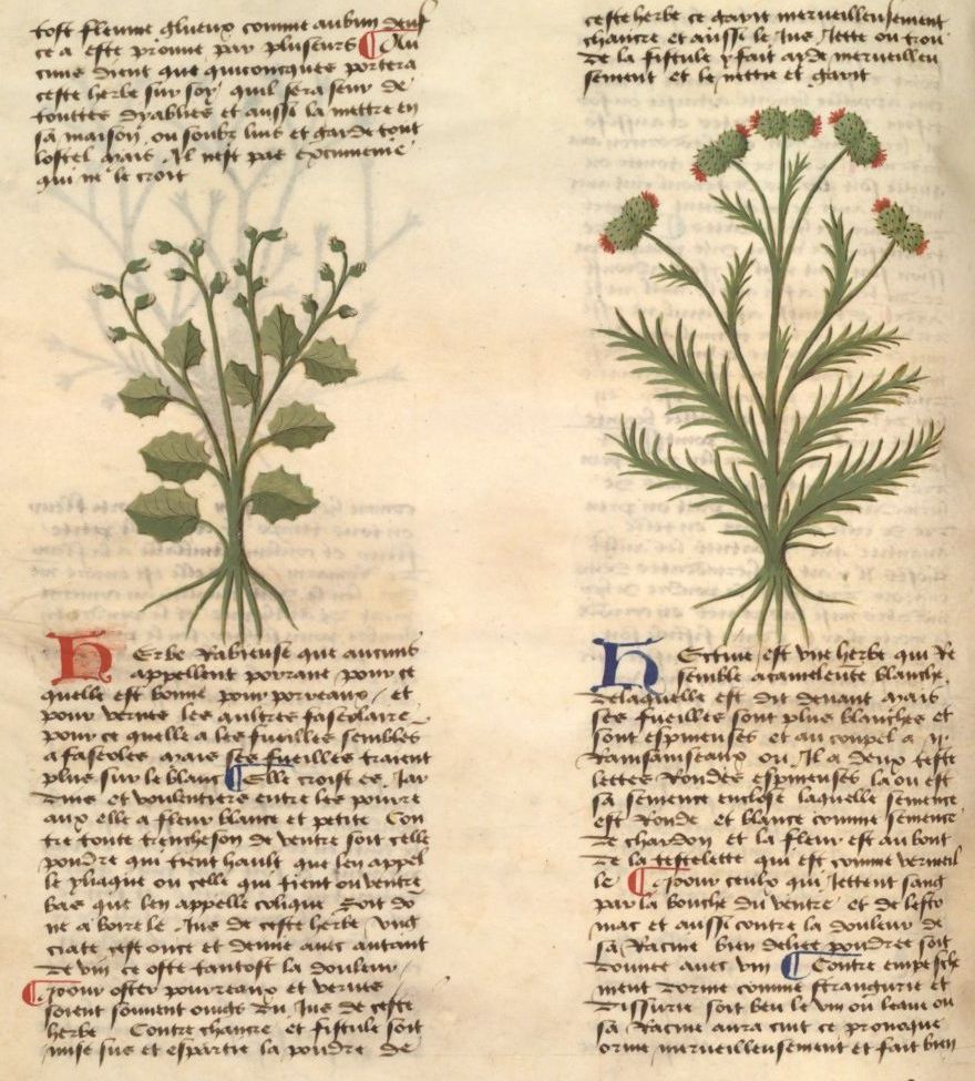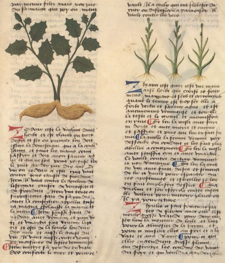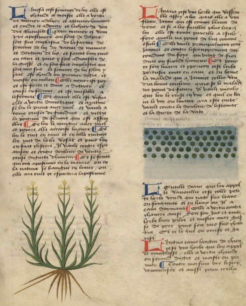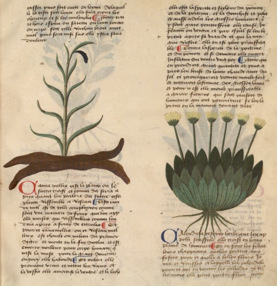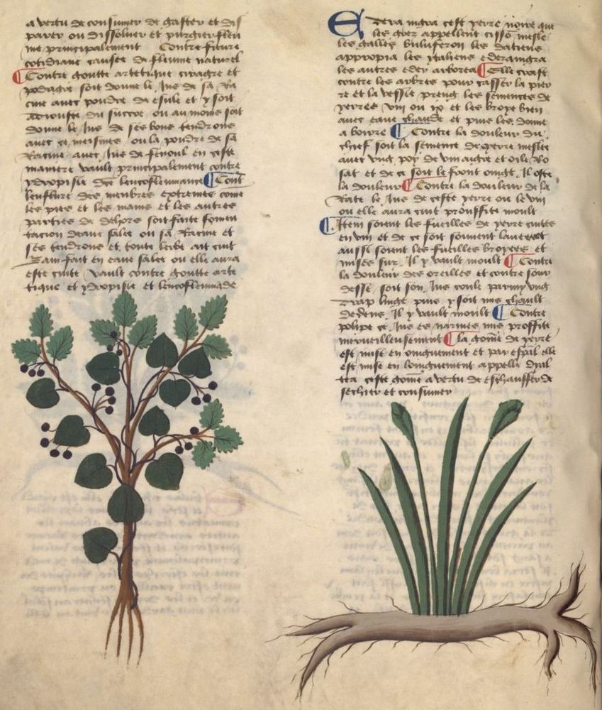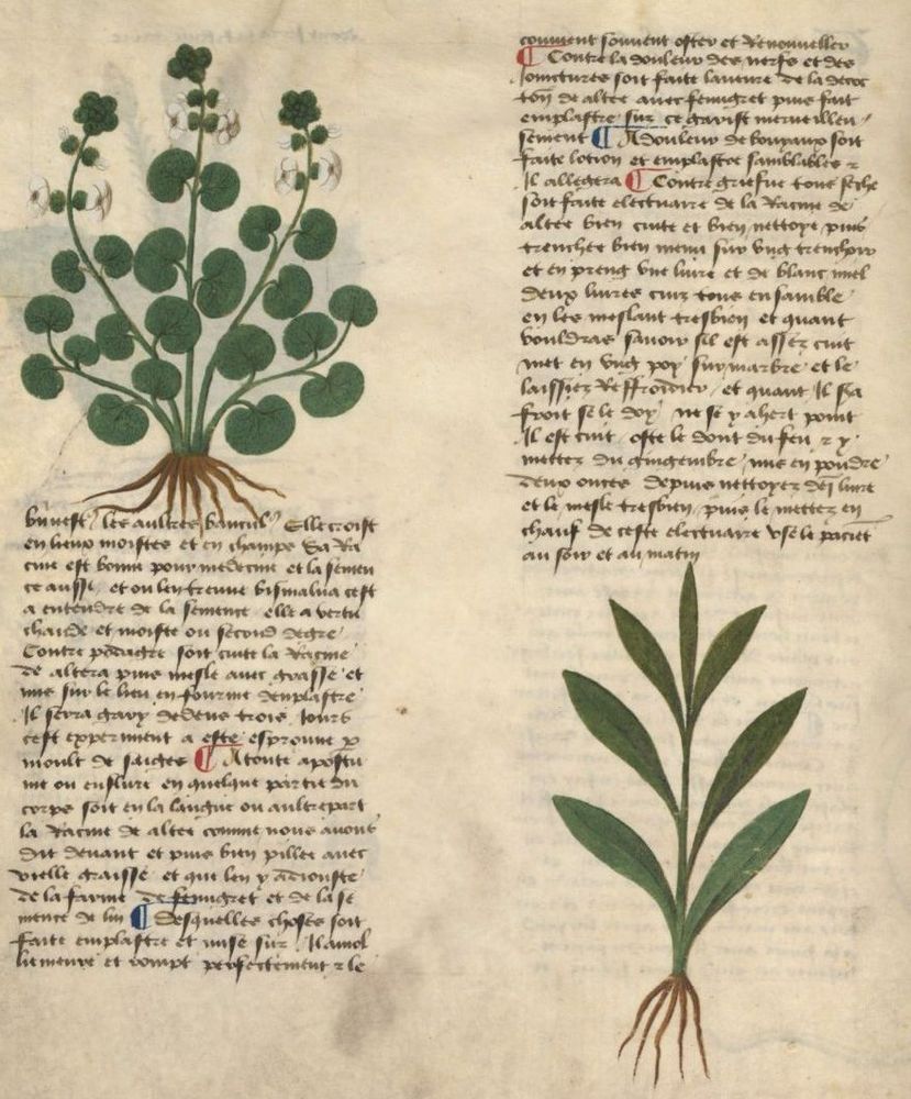► Écrit originellement au XII par un médecin italien et essentiellement basé sur le classique précédent, De la Matière médicale, cet herbier est un traité de pharmacopée recensant les plantes médicinales du moyen-âge.