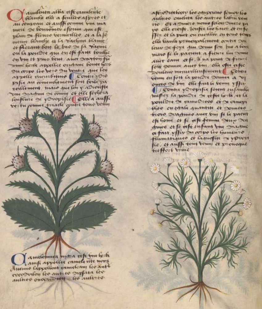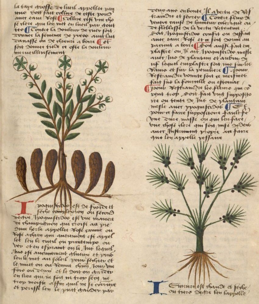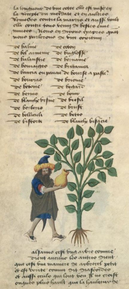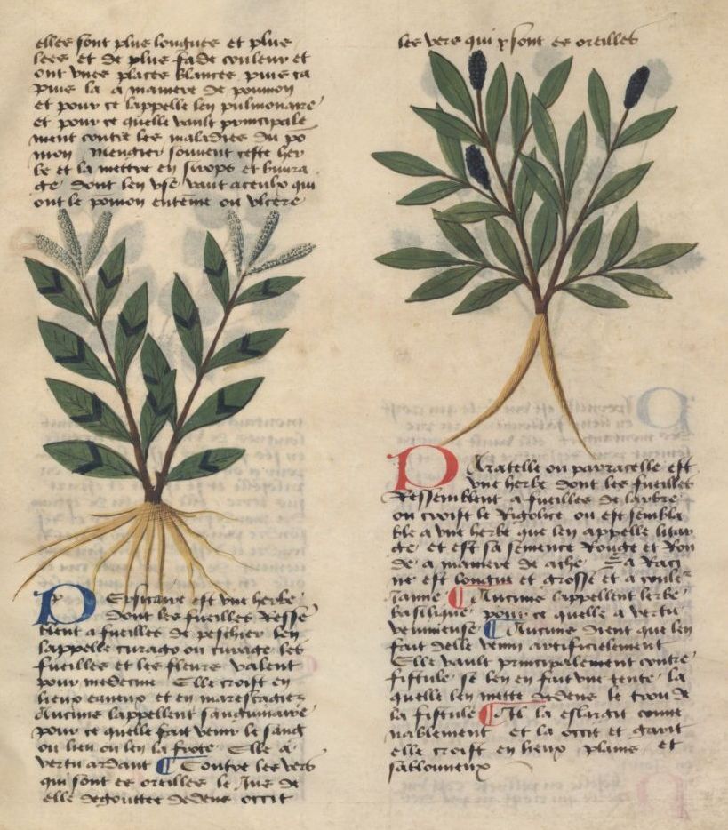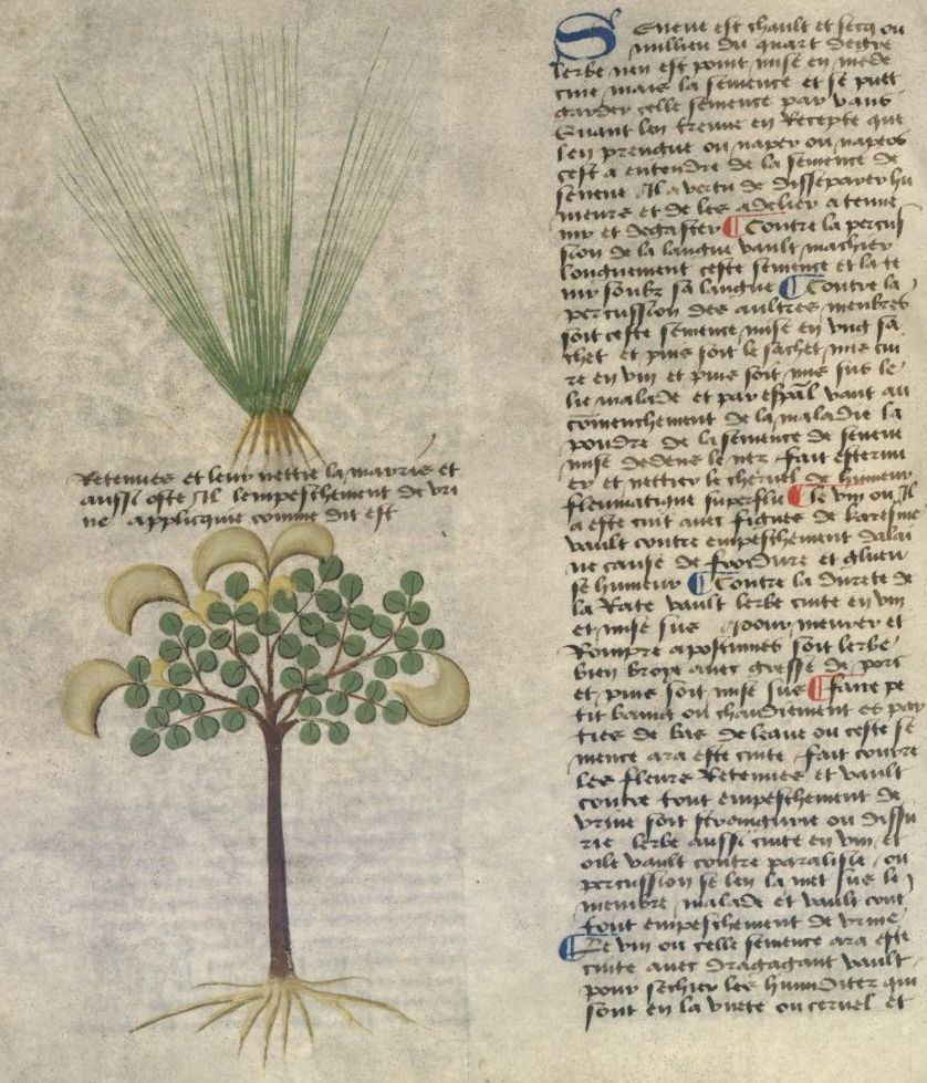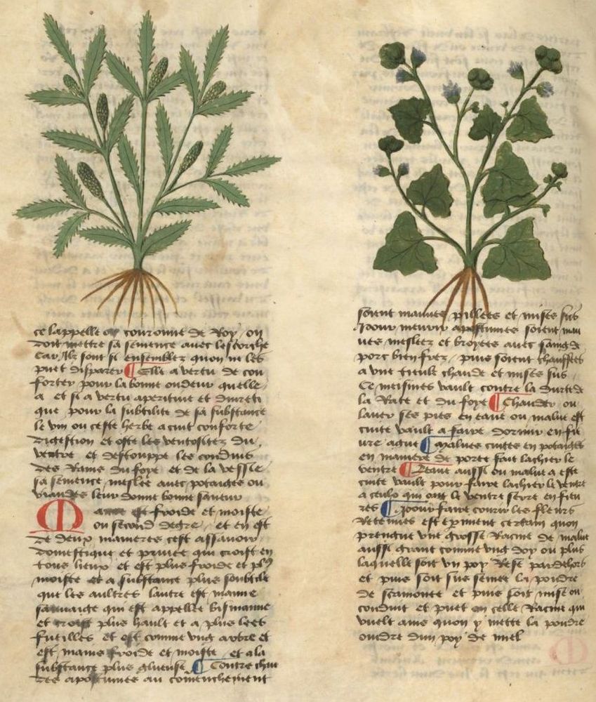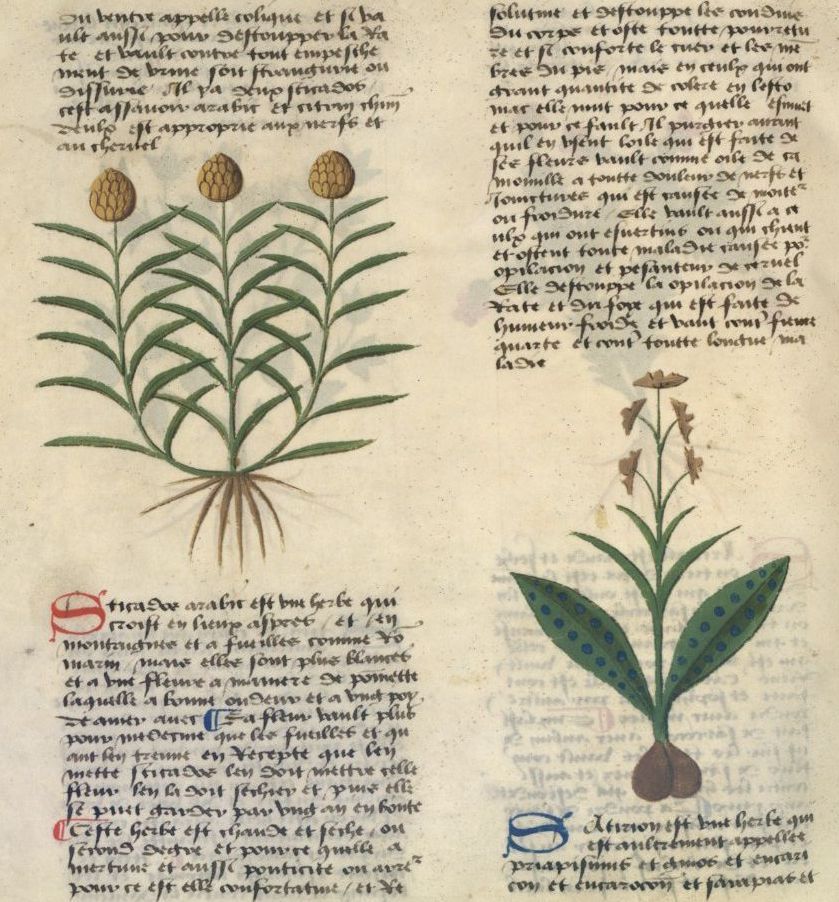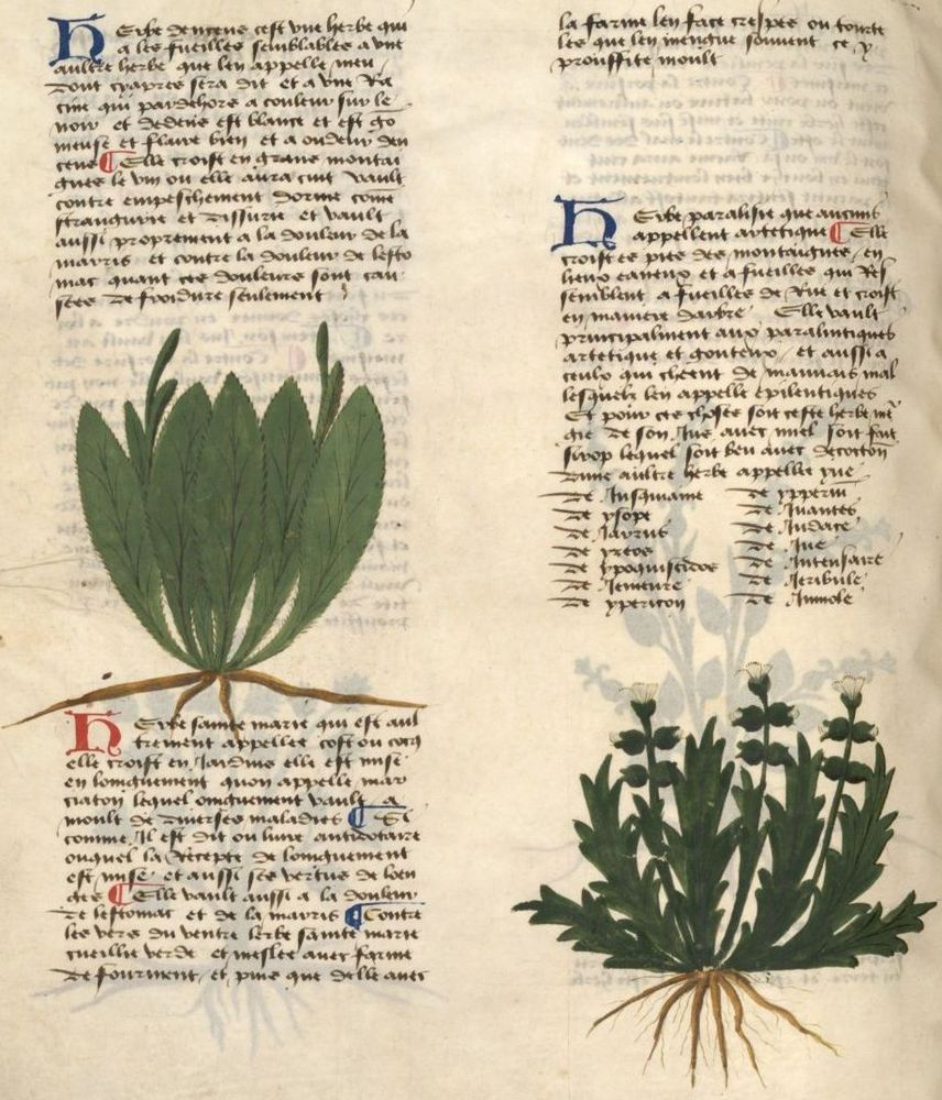 ► Écrit originellement au XII par un médecin italien et essentiellement basé sur le classique précédent, De la Matière médicale, cet herbier est un traité de pharmacopée recensant les plantes médicinales du moyen-âge.