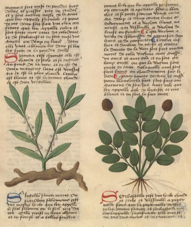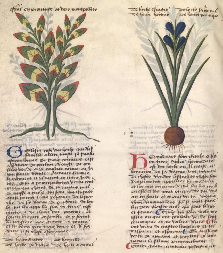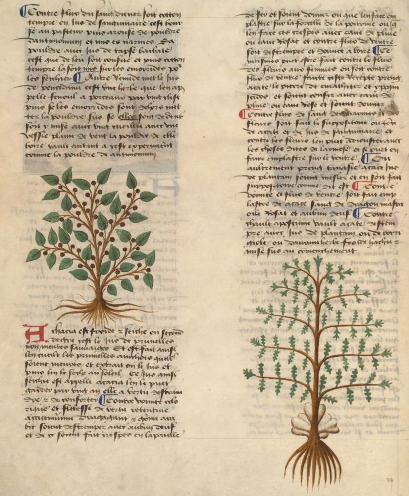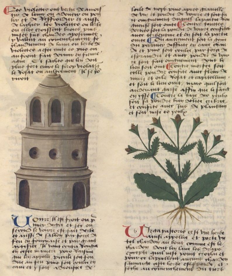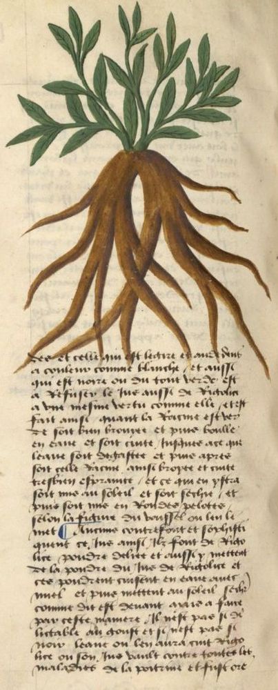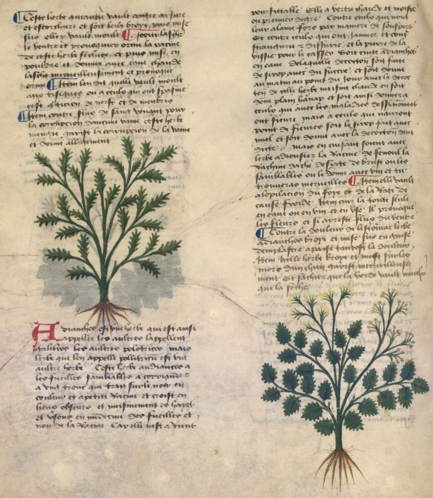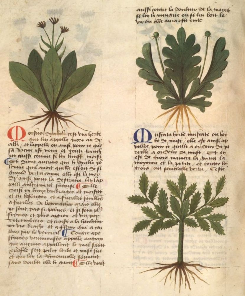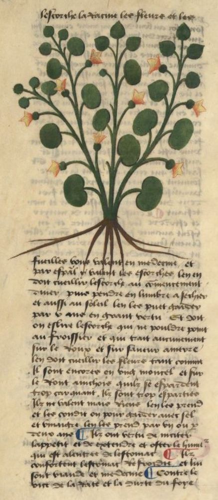 ► Écrit originellement au XII par un médecin italien et essentiellement basé sur le classique précédent, De la Matière médicale, cet herbier est un traité de pharmacopée recensant les plantes médicinales du moyen-âge.