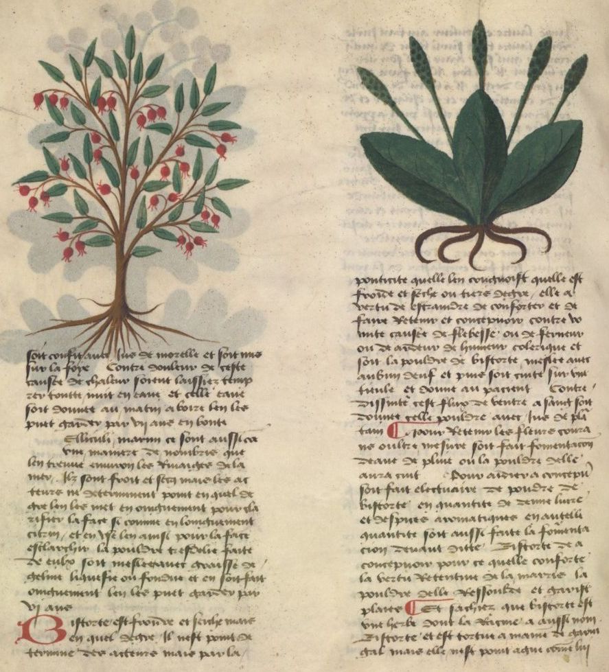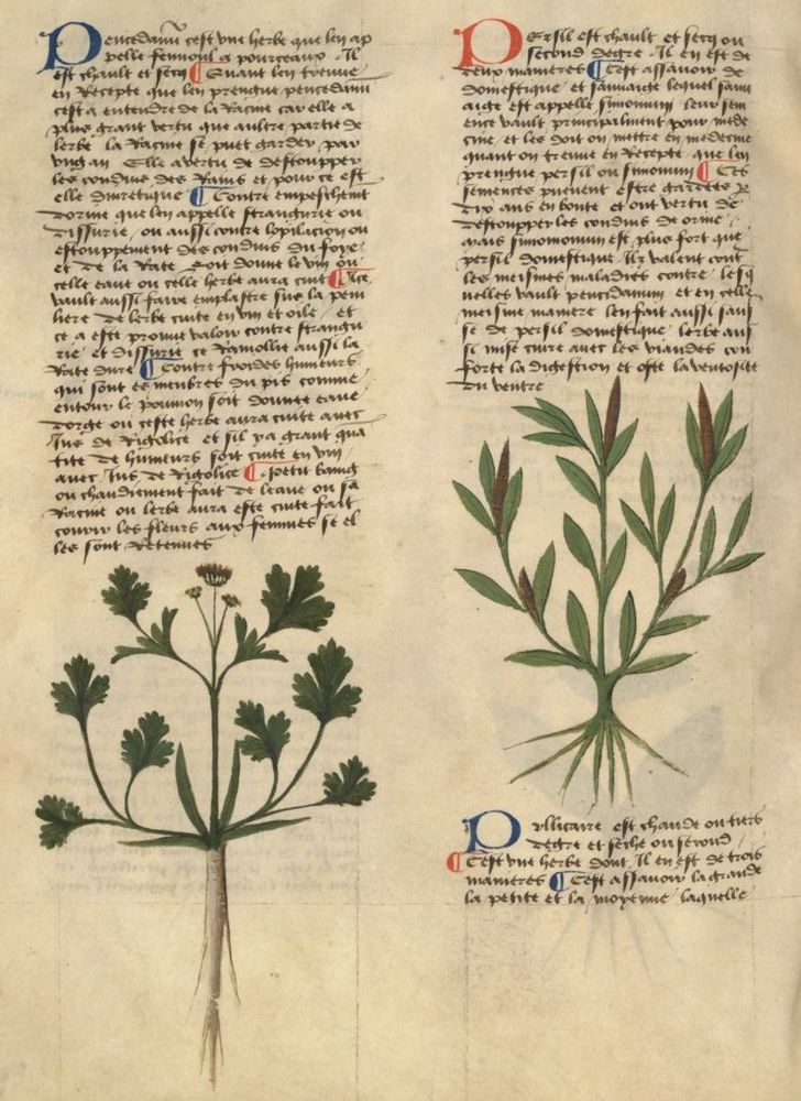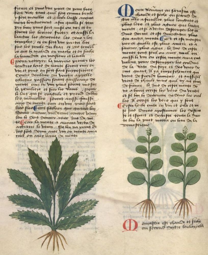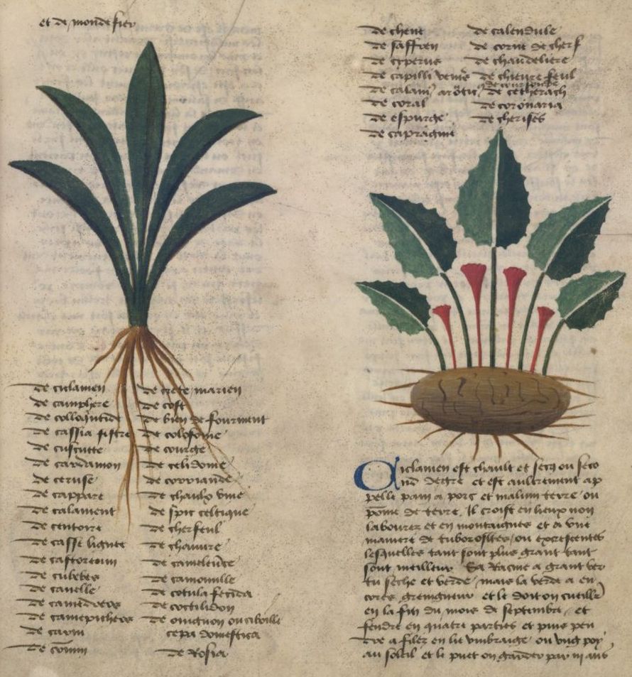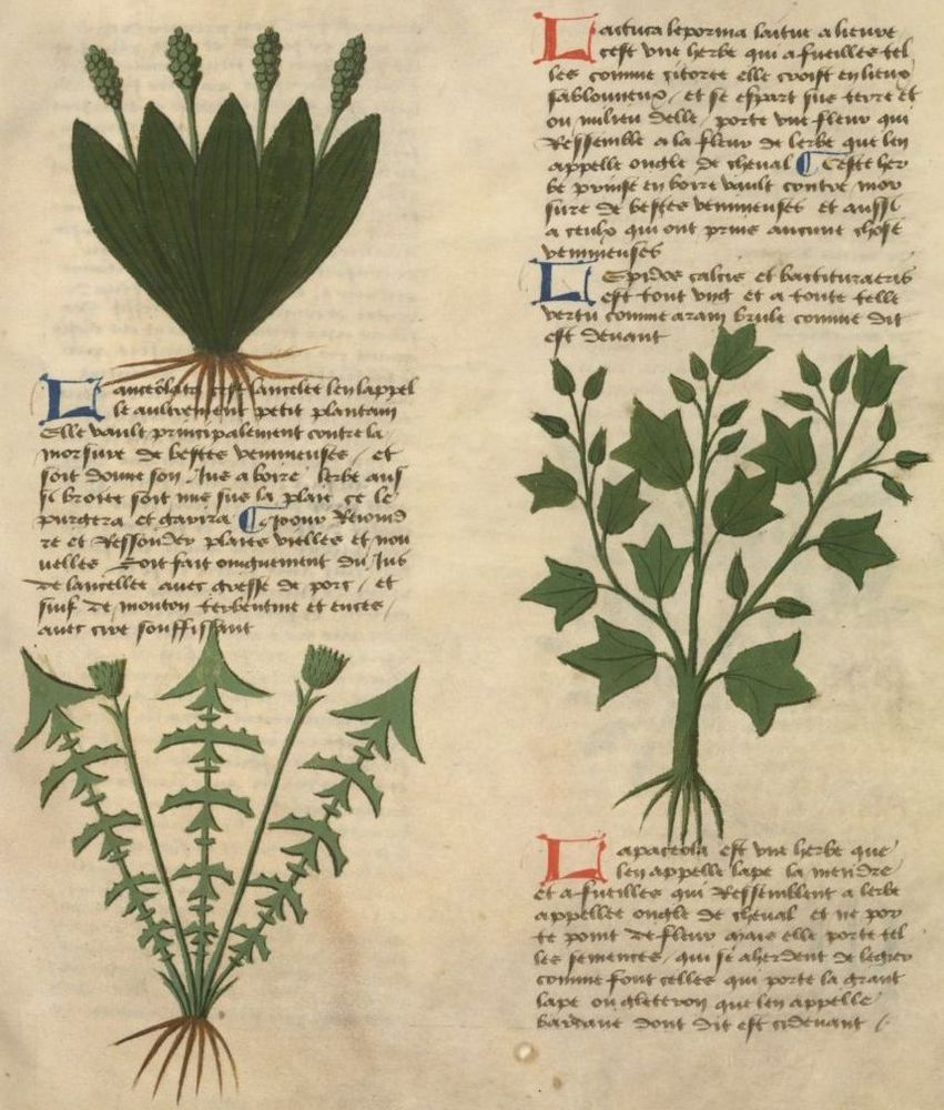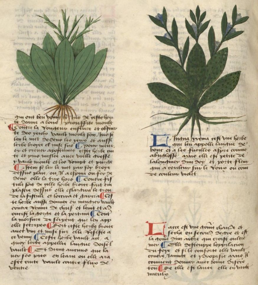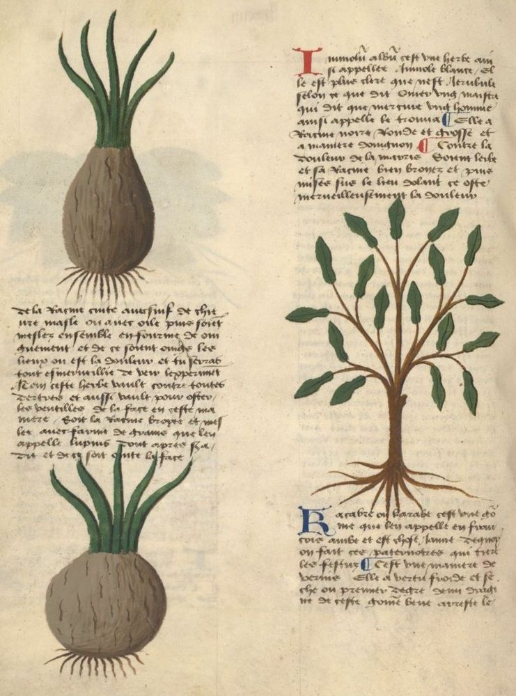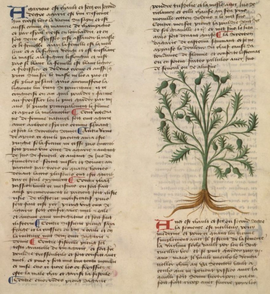 ► Écrit originellement au XII par un médecin italien et essentiellement basé sur le classique précédent, De la Matière médicale, cet herbier est un traité de pharmacopée recensant les plantes médicinales du moyen-âge.