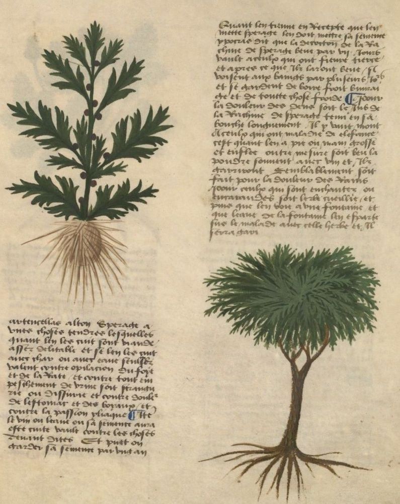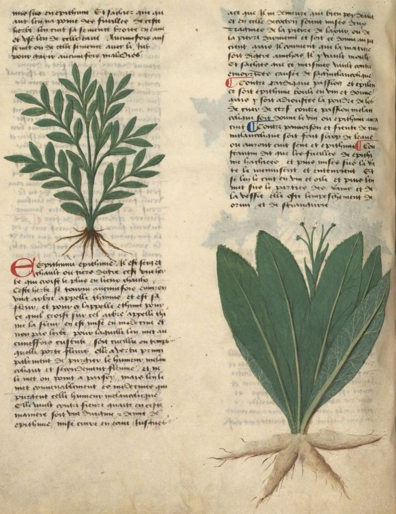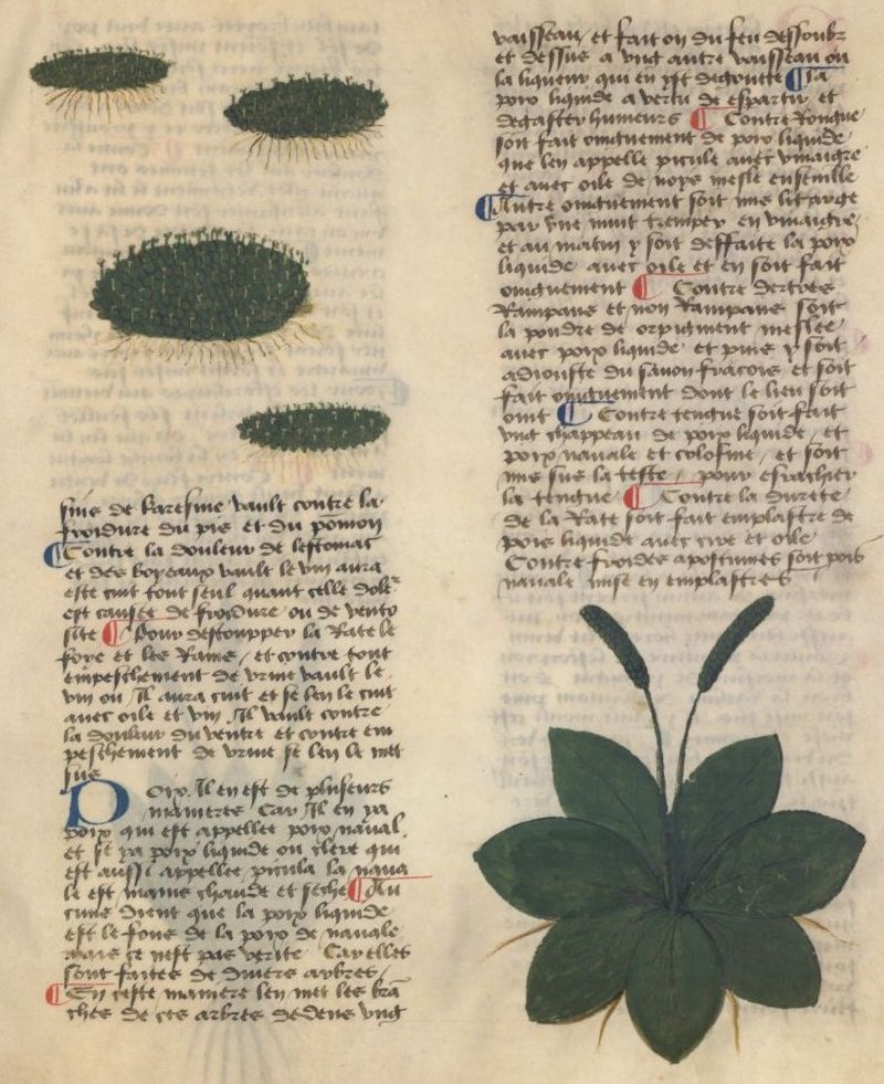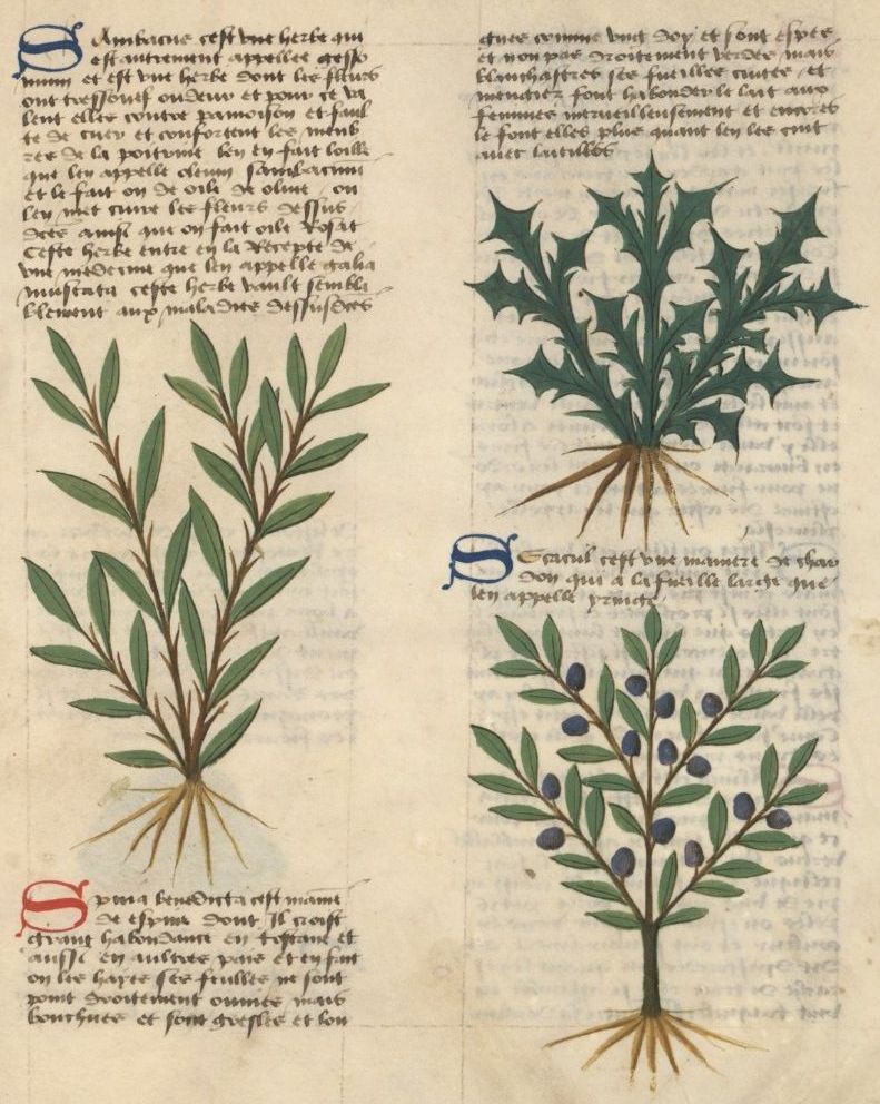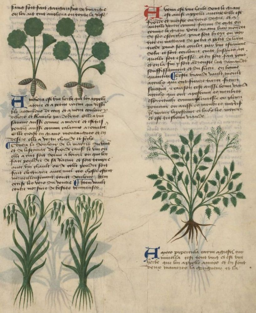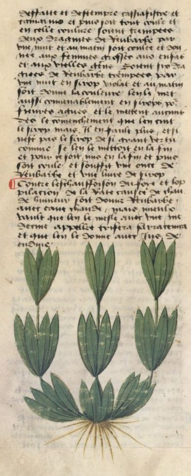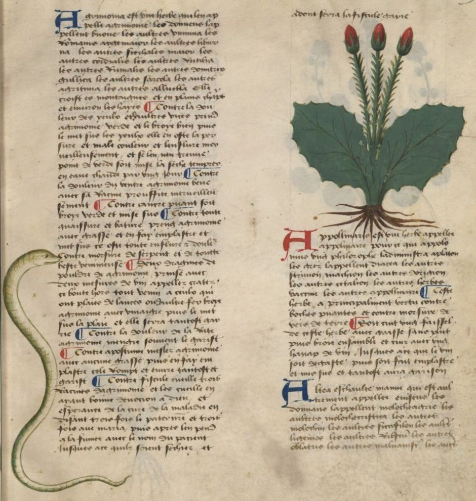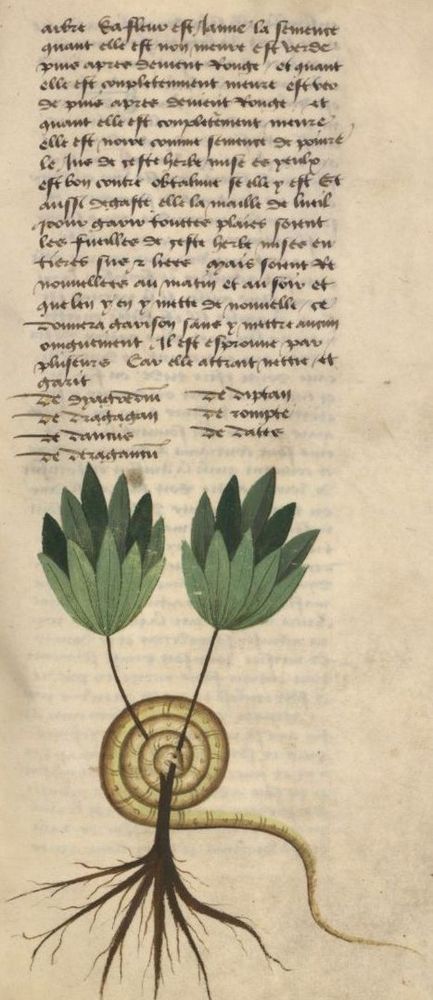 ► Écrit originellement au XII par un médecin italien et essentiellement basé sur le classique précédent, De la Matière médicale, cet herbier est un traité de pharmacopée recensant les plantes médicinales du moyen-âge.
