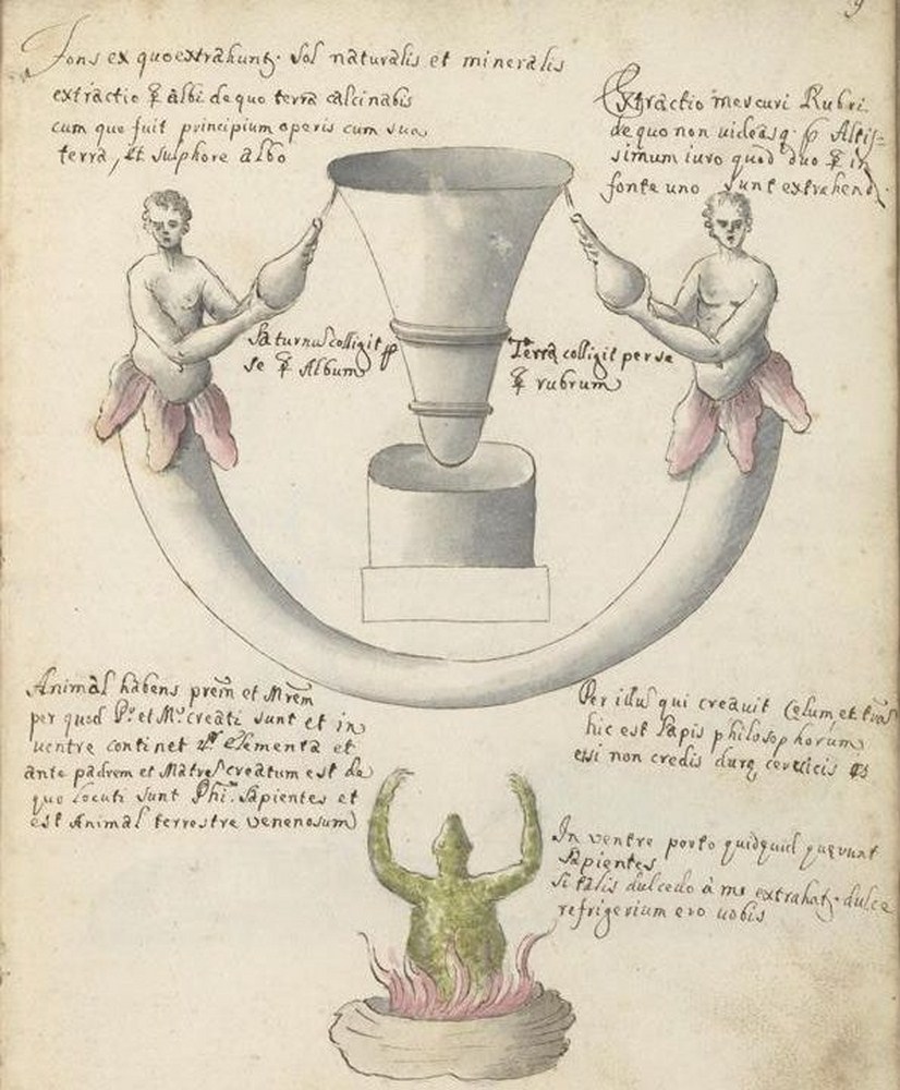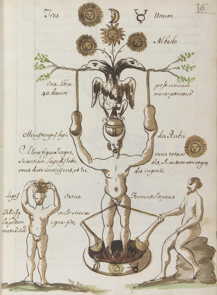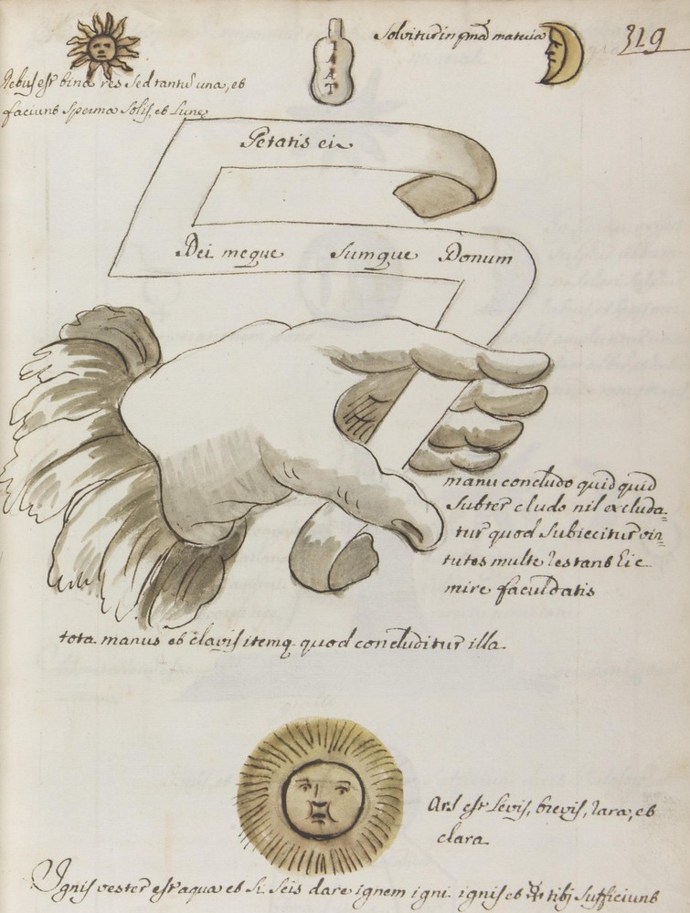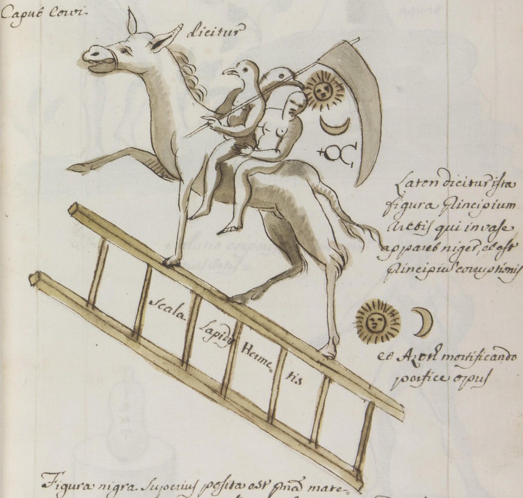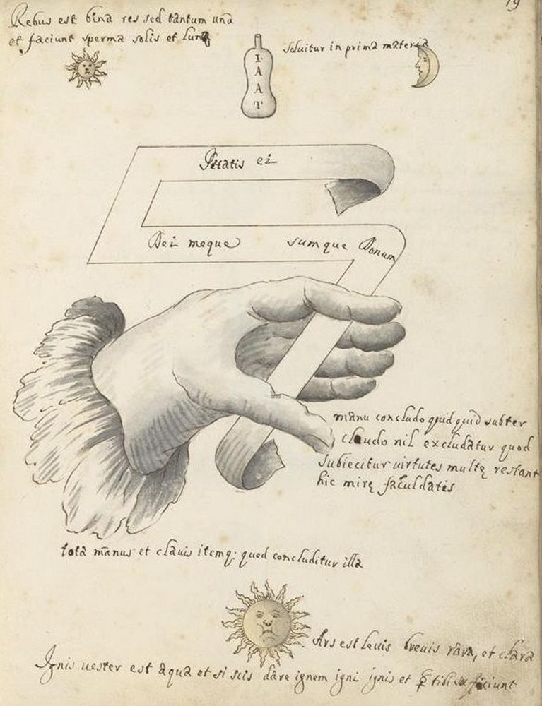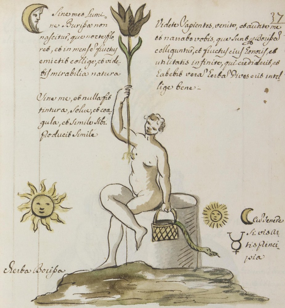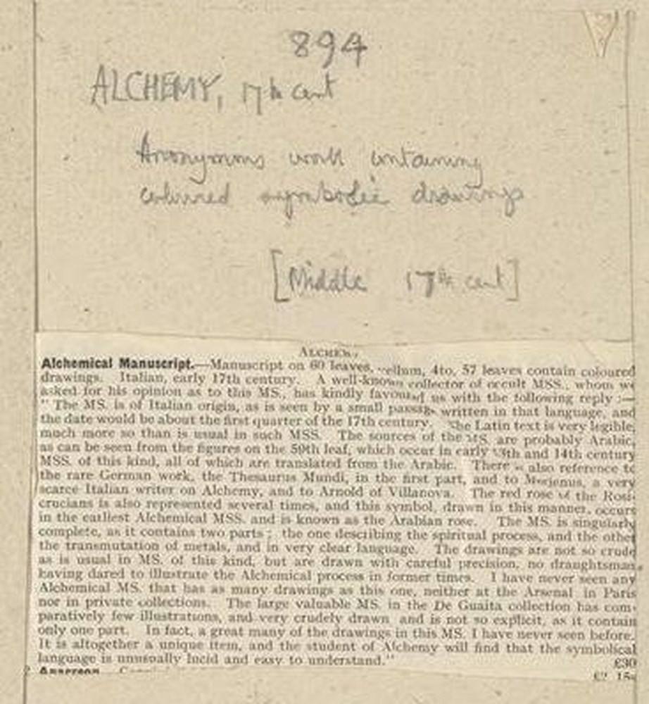 ► Cet ouvrage dont l’iconographie est unique recèle une note dactylographiée d’un "Collectionneur de manuscrits occultes bien connu" dans l’exemplaire Wellcome. La note permet de tirer les informations suivantes : il provient (au moins en partie) probablement d’un manuscrit arabe du XIV. En deux partie, il décrit le processus spirituel puis le processus physique. Le collectionneur - peut-être de nationalité française - avoue n’avoir jamais vu d’illustrations semblables et en si grand nombre même à l’Arsenal ou dans la collection de Stanislas de Guaita.