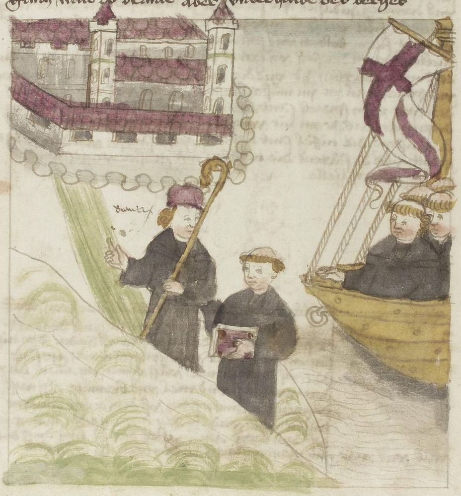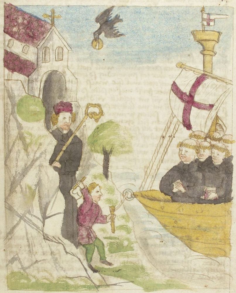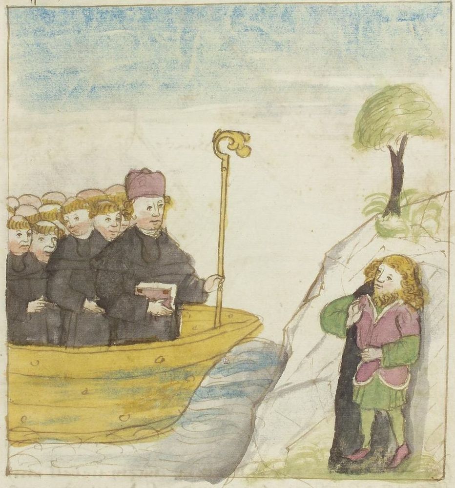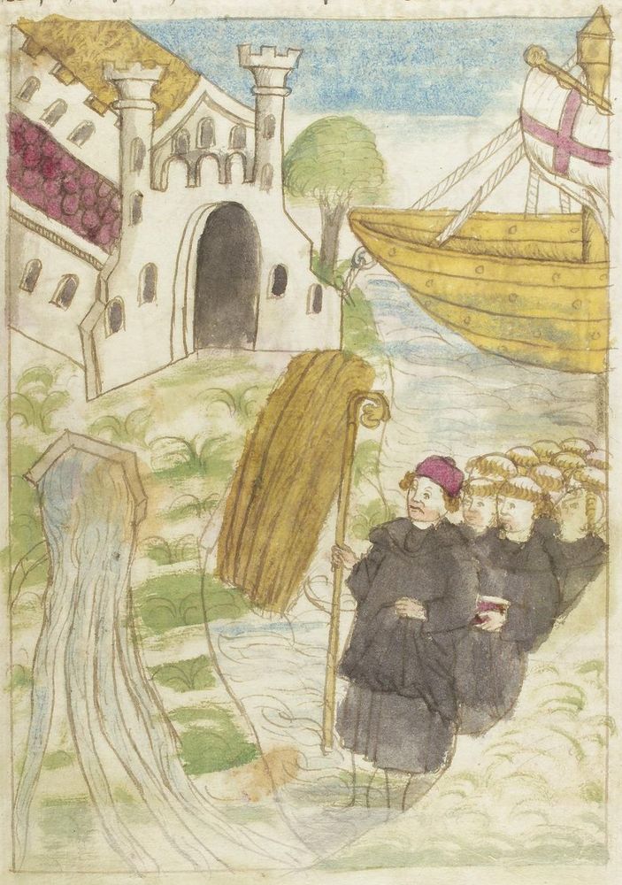 Tous entrèrent. Il restait seul sur le rivage, bénissant la montagne, le port et la nef, quand trois moines de son abbaye apparurent, qui descendirent hâtivement vers lui et tombèrent à ses pieds, disant : « Beau père, par la charité du Christ, permets-nous d’aller avec toi où tu veux aller ; ou si c’est non, nous nous laisserons mourir de faim dans ce lieu-ci. »