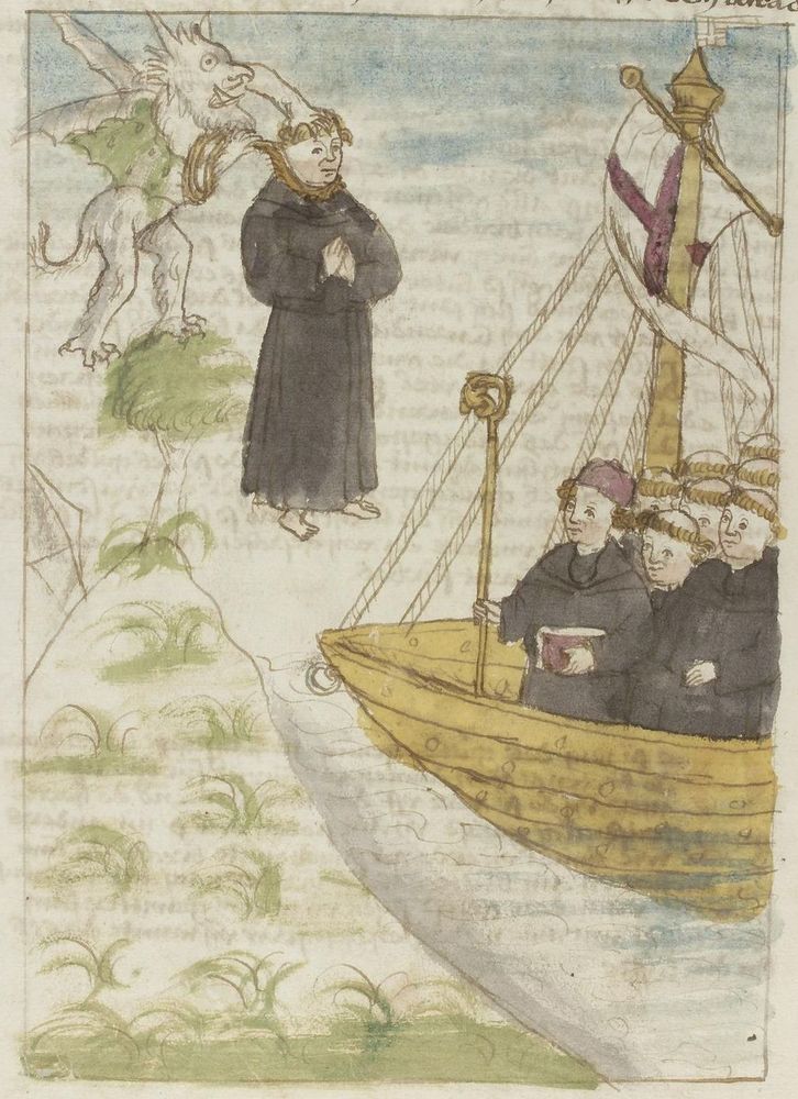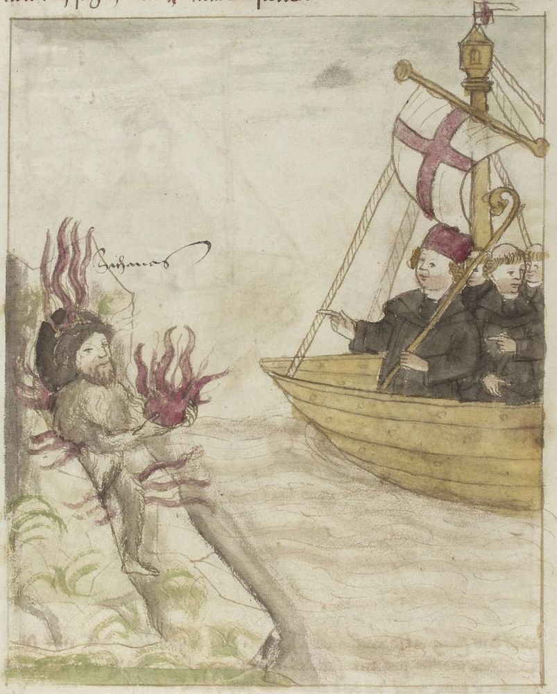 Quand ils furent près d’elle, un des frères sauta hors de nef. C’était un des deux qui restaient sur les trois qui avaient suivi saint Brendan malgré lui. Et il nageait vers cette terre, en se lamentant : « Hélas, beaux frères, voici que je suis arraché du milieu de vous. Je ne puis me défendre d’aller vers les démons qui m’attendent là-haut. »