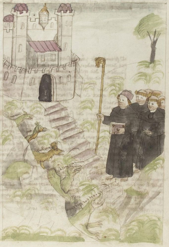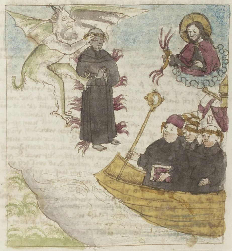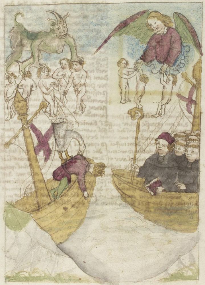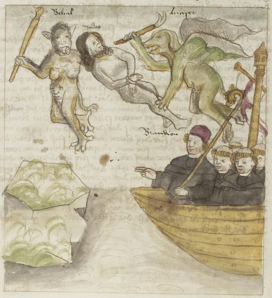 Quand le soir assombrit la mer, voici qu’une multitude de démons arrive, menant un bruit effroyable. Et cette multitude est si grande qu’elle couvre la surface de l’abîme. Tous ont des dents pointues qui leur sortent de la bouche, des yeux étincelants comme des éclairs, des jambes et des bras secs comme du bois brûlé, des ailes noires armées de dards. L’un d’eux dit à saint Brendan : « Éloigne-toi un peu, homme de Dieu, parce que nous ne pouvons pas approcher, si tu ne t’éloignes. Et nous n’oserions pas nous présenter devant notre prince si nous ne lui ramenions pas celui-ci, qui lui est plus cher que tous les autres damnés. Rends-nous cette proie, elle est nôtre. »