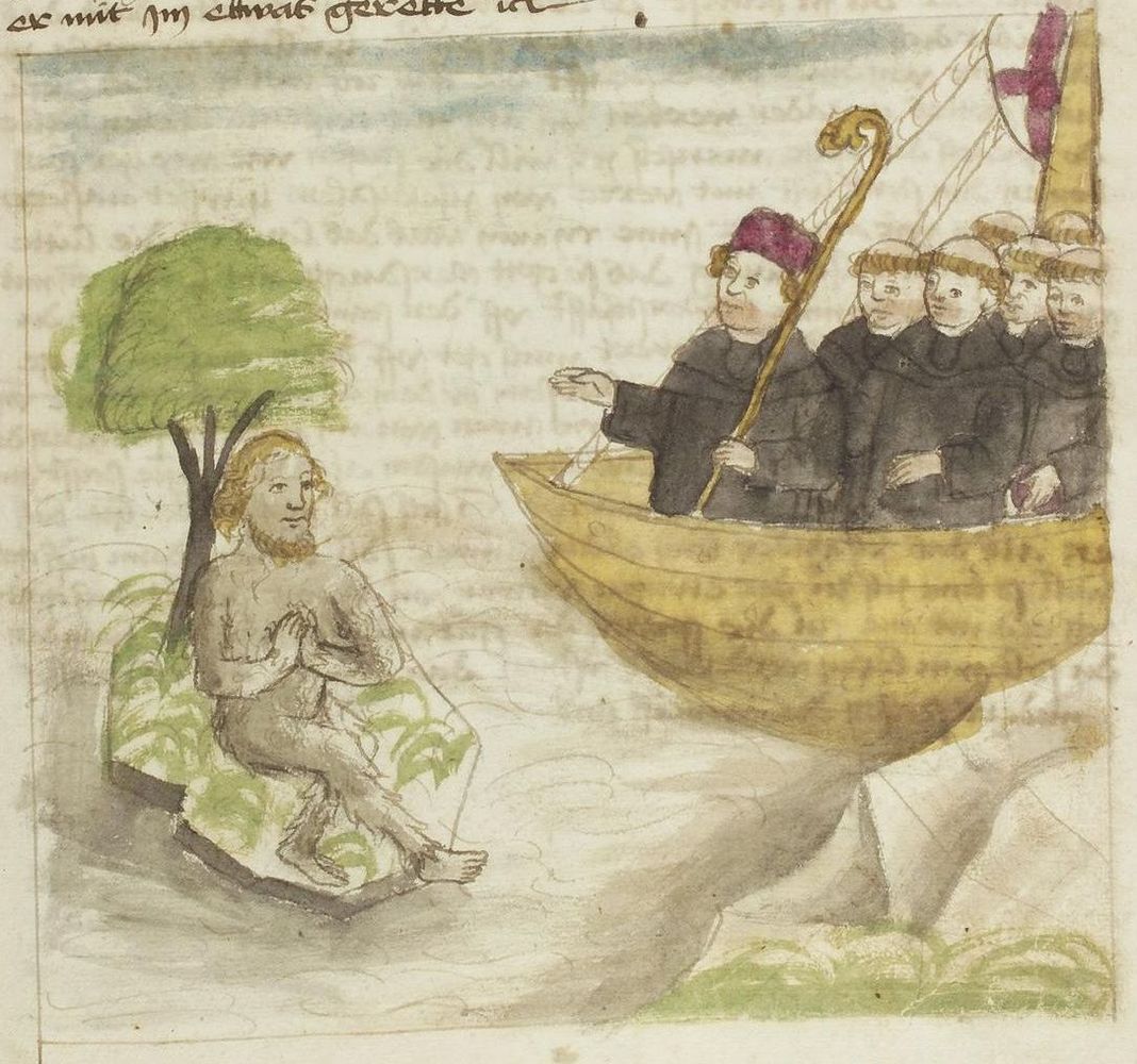 Quand saint Brendan vit cela, il poussa soupir sur soupir et se courrouça contre lui-même, disant : « Malheur à moi, pécheur, qui ai choisi de porter l’habit du cénobite et de vivre au milieu des hommes ! Voici un pieux anachorète qui vit nu comme un ange, seul dans sa cellule, assurément plus près de Dieu que moi ! »