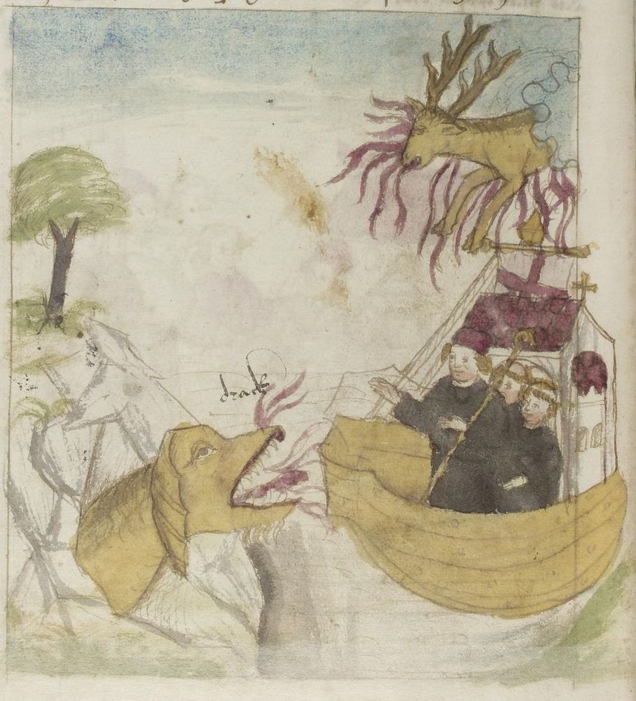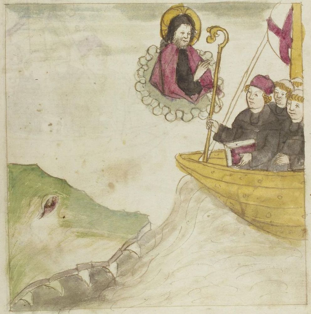 Quand il eut fini cette oraison, voilà qu’un serpent énorme surgit de la mer tout contre la nef, et se dirigea droit à la rencontre de l’autre en jetant du feu hors de sa gueule. Et tous deux, dressant leurs têtes jusqu’aux nues, s’attaquèrent avec rage. Des flammes jaillissaient de leurs narines, ils s’enroulaient l’un à l’autre, ils se déchiraient à pleines dents. Le sang et le feu volaient autour d’eux. La mer était en grand tumulte, les vagues devenaient rouges. Et le vénérable vieillard disait à ses compagnons : « Voyez, mes fils, ce grand miracle de notre Sauveur. Voyez l’obéissance de cette créature aux ordres de son Créateur : comme elle est venue, comme elle combat, comme elle mord cruellement l’autre. Attendez sans crainte la fin de la bataille. Elle sera pour la plus grande gloire de Dieu. »