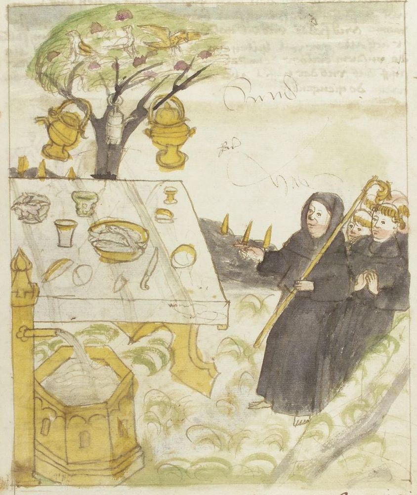 « Alors, les frères répondirent : “Sire, nous pensions bien que vous aviez été dans le Paradis de Dieu. Car souvent déjà notre abbé s’en est allé, nous ne savions où, et toujours il rapportait ce même parfum dans les plis de ses vêtements, si fort et si suave que nos narines le sentaient pendant quarante jours.”