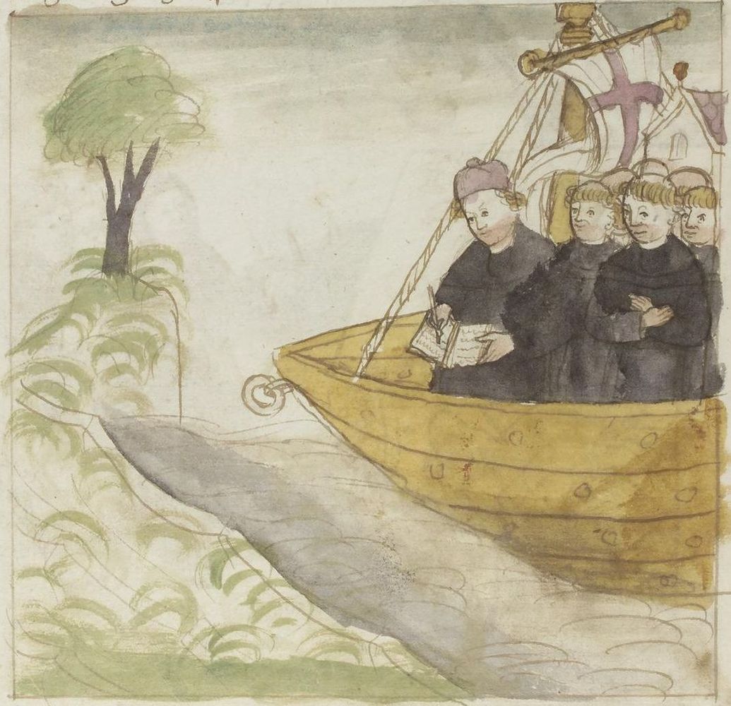 Ils restèrent tout le jour à regarder l’église merveilleuse, sans pouvoir en rassasier leurs yeux. Puis, à la vesprée, un bon vent commença à venter derrière eux, qui les en éloigna. Ils étaient emportés sans avoir besoin de ramer, abandonnant à Dieu la voile et le gouvernail. Pendant un mois ils voguèrent ainsi droit vers le Septentrion.