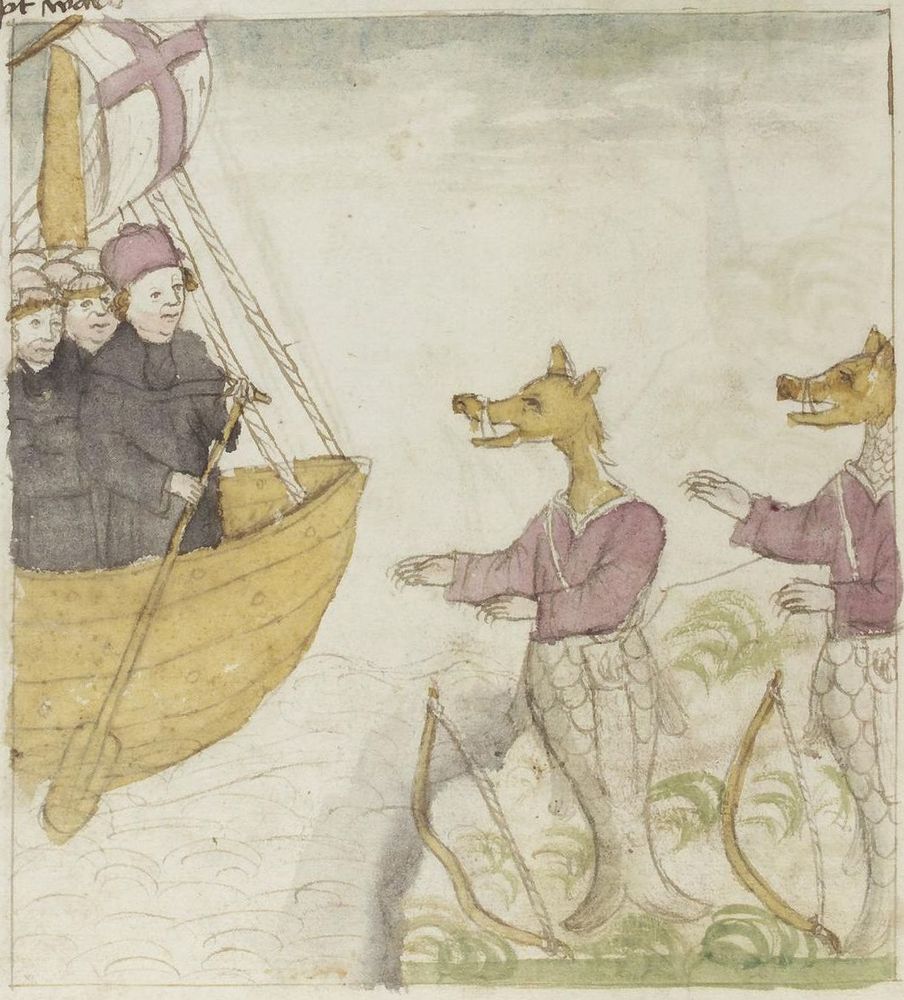 Au bout de huit semaines, le vent cessa de soulever les vagues, la mer devint comme coagulée, un vaste silence s’établit, qui semblait éternel. Et l’eau pullulait de bêtes hideuses qui montaient des profondeurs à l’approche de la nef, se heurtaient à ses flancs de cuir, chargeaient les rames et montaient dessus pour mieux voir les frères. Ils priaient Dieu en pleurant pour qu’il leur vînt en aide ; car leur force s’épuisait sans que la nef avançât sur ces flots horribles. À la fin, ils ne ramaient plus, ils demeuraient en oraison.