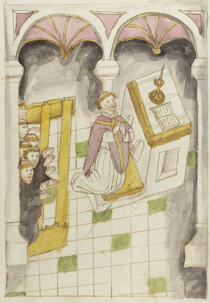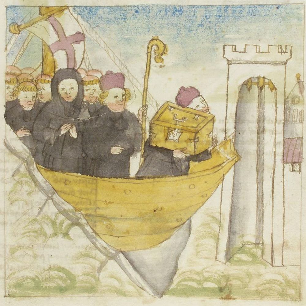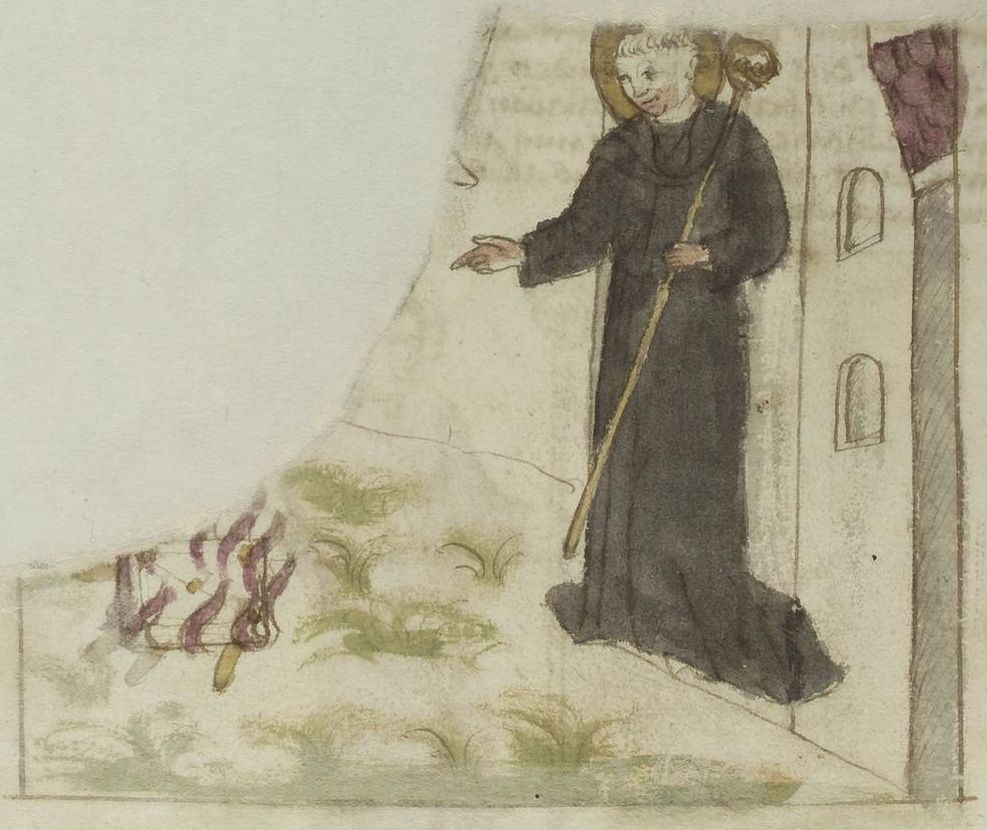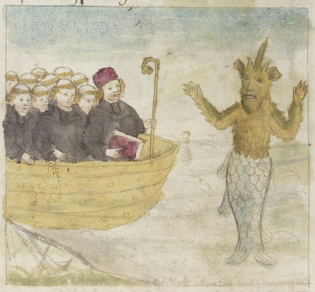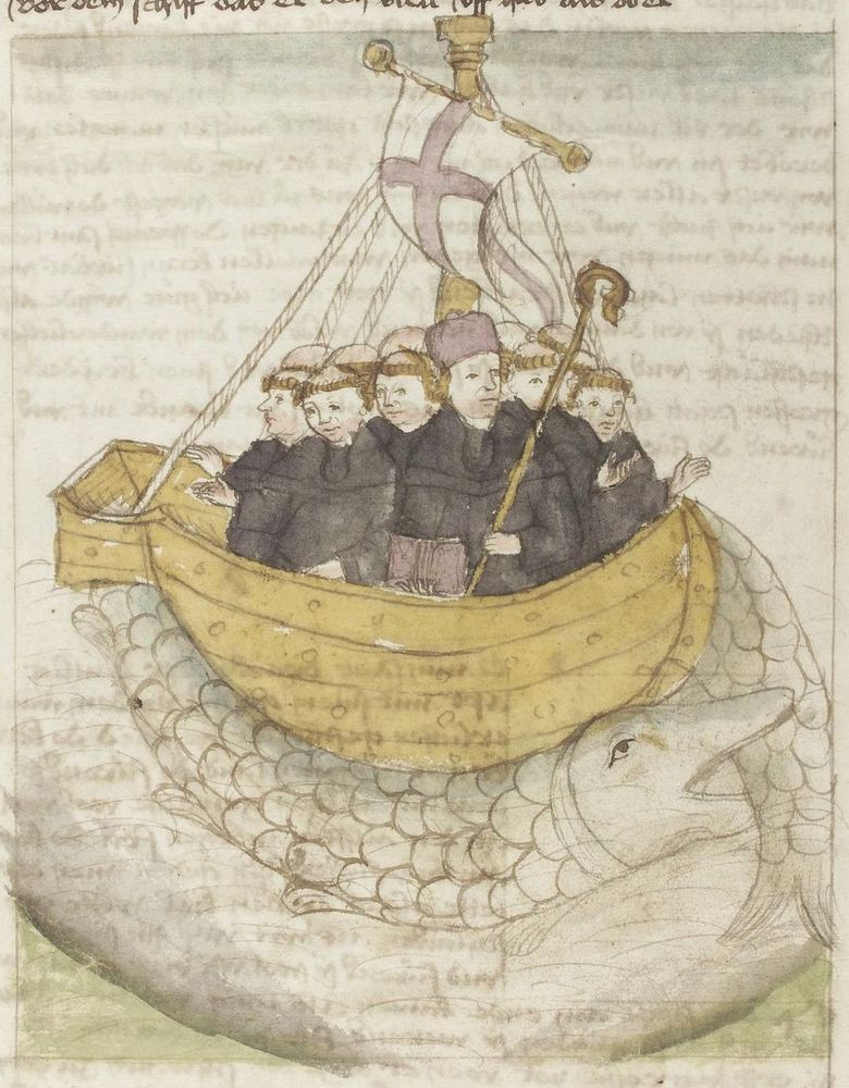 Or le vénérable homme de Dieu ne daignait rien voir. Debout au pied du mât, il célébrait la fête de saint Pierre l’Apôtre. Et comme il chantait l’office très haut, à voix très claire, les frères lui dirent : « Beau cher père, chante plus bas, ou tu vas nous faire mourir. II y a sous nous des poissons grands et cruels. Jamais nous n’avons vu bêtes aussi monstrueuses. Si le son de ta voix les irrite, ils nous attaqueront. »