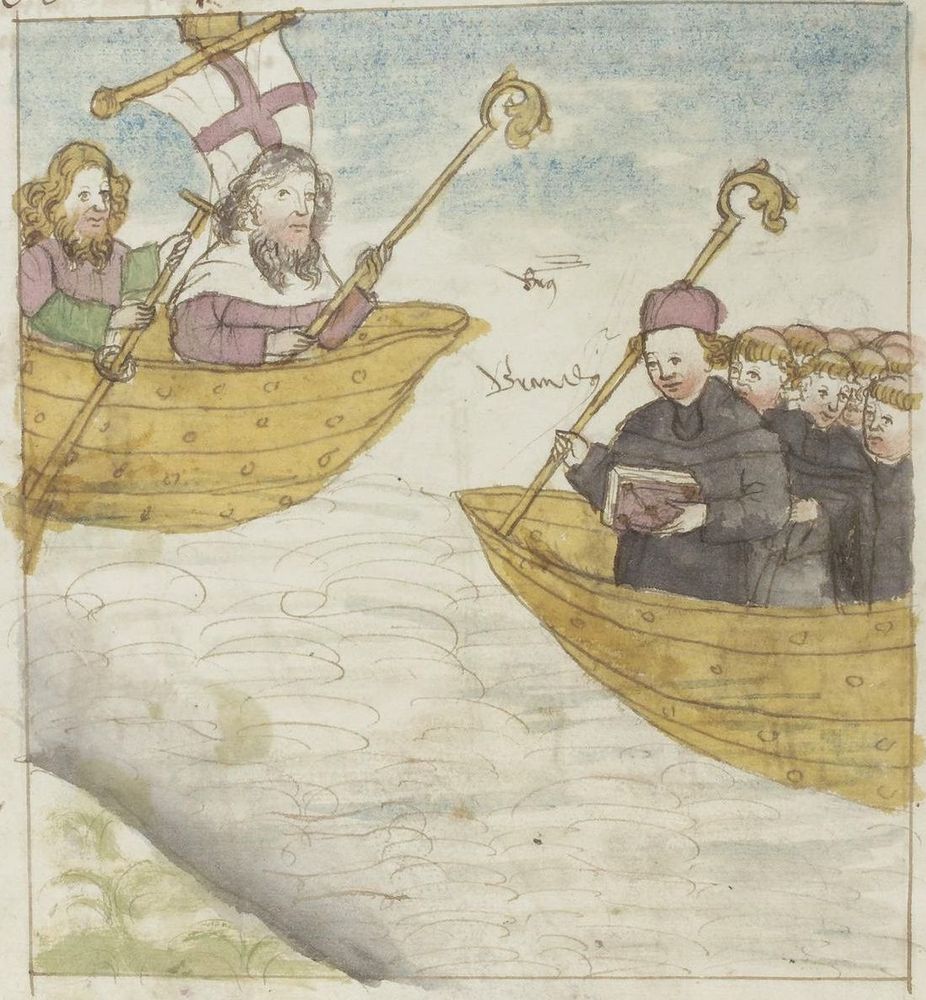 Saint Brendan et ses frères demeurèrent là jusqu’à l’octave de la Pentecôte. Et comme ils préparaient leur nef, l’ange qui les avait jadis visités apparut soudainement devant eux. Il leur dit : « Désormais, je serai votre guide. Car sans moi, vous ne pourriez trouver la Terre de Promission des Saints. »