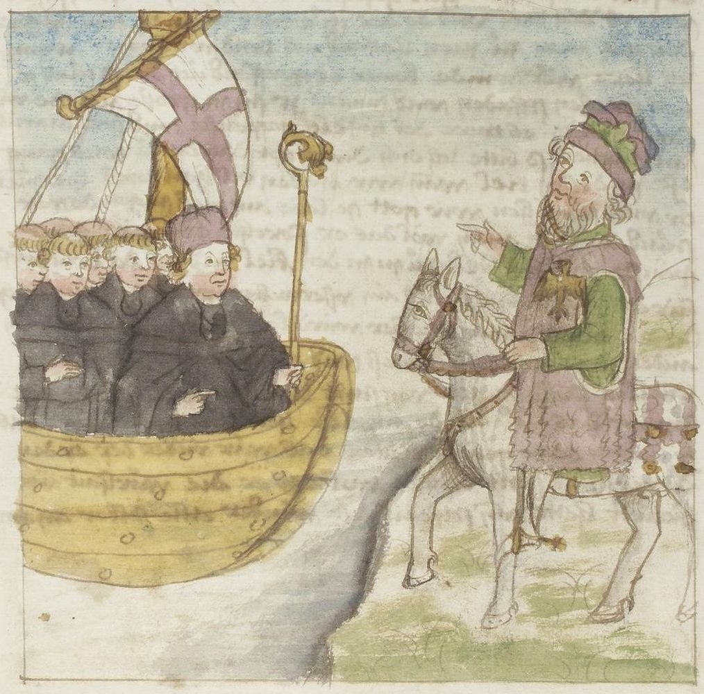 Entendant ces bruits, le saint père se plaça sur la proue, ouvrit les bras en croix du côté de la terre, et pria : « Sire Jésus-Christ, permets que nous nous éloignions sans dommage de cette île funeste. »