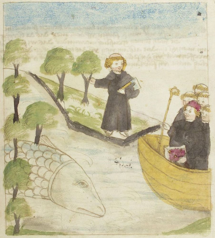 Quand elles eurent entendu la voix de l’homme de Dieu, elles s’élevèrent du fond et se mirent à nager autour de la nef. Bientôt il y en eut tant que l’eau disparut et que la nef s’arrêta, pressée de toutes parts entre les poissons innombrables. Alors, ceux-ci se rangèrent en bel ordre : chacun appuya sa tête sur le dos de celui qui était devant lui et la tint un peu hors de l’eau ; et les plus petits étaient devant, les plus gros derrière, en sorte que tous voyaient distinctement l’homme de Dieu.
