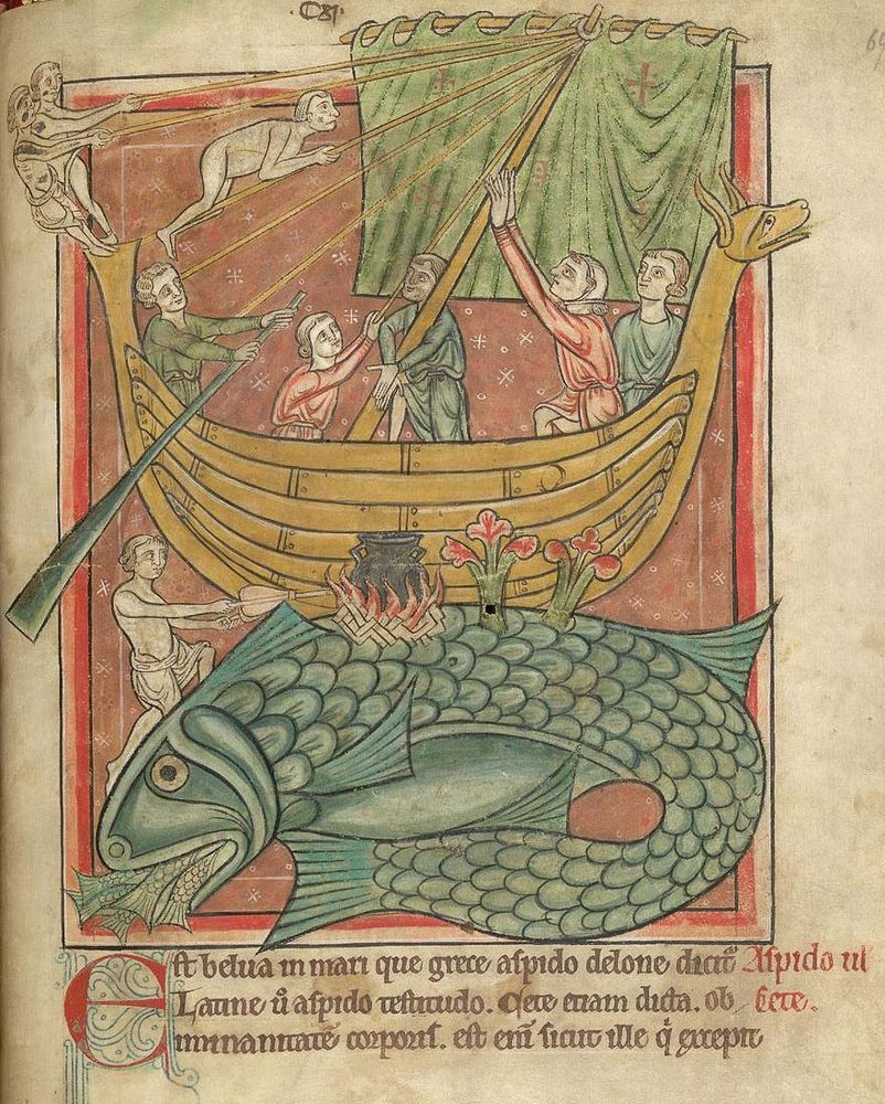 Commentaire : L’apsidochélon est une créature présente dans les bestiaires depuis le Physiologus, il est utilisée dans le Voyage de saint Brendan aux passages de la pâque sur Jasconius.
