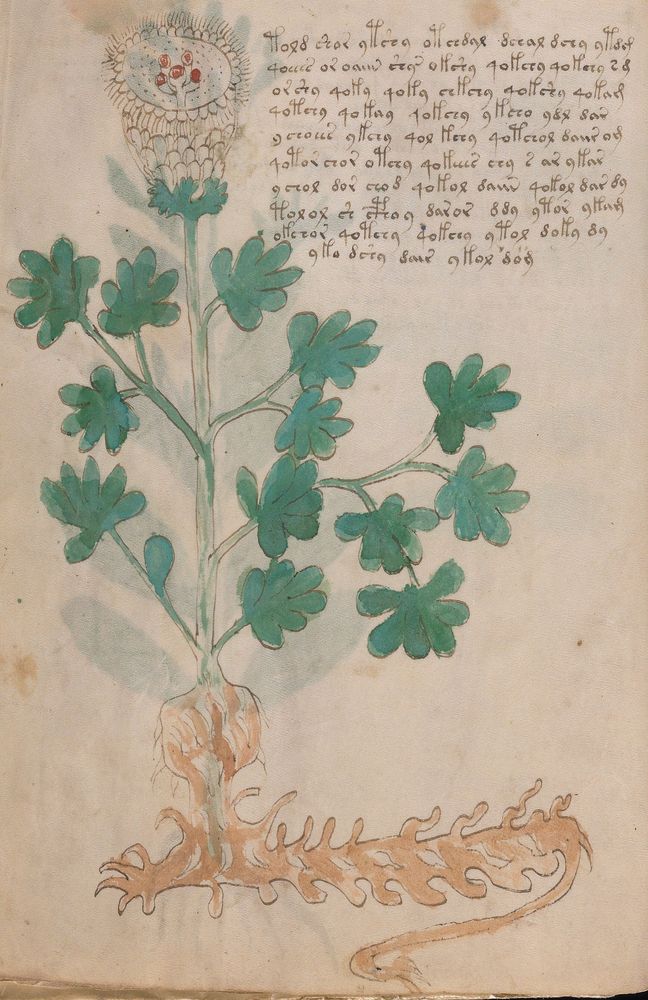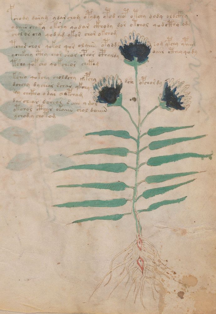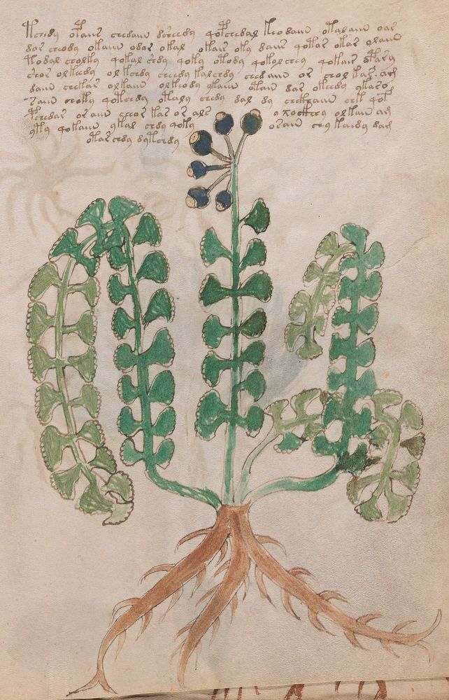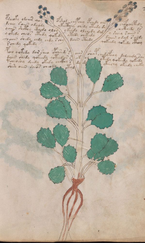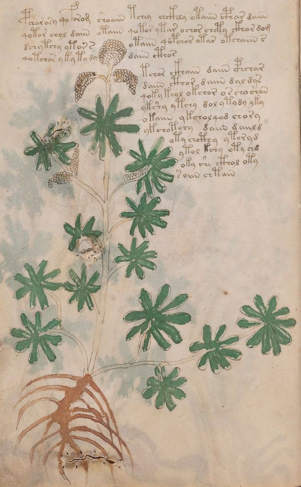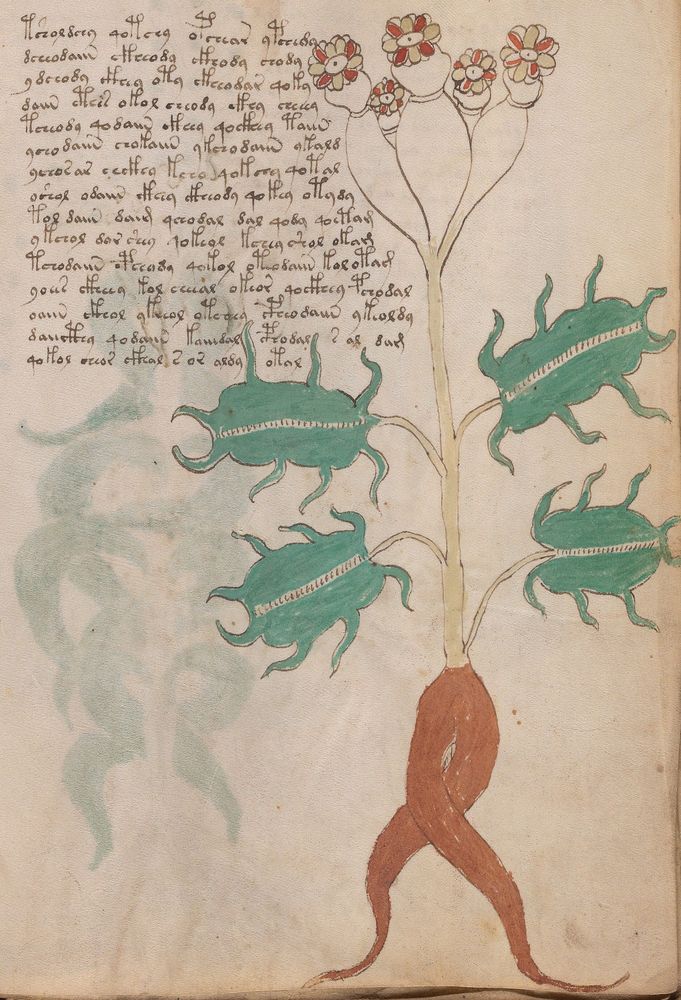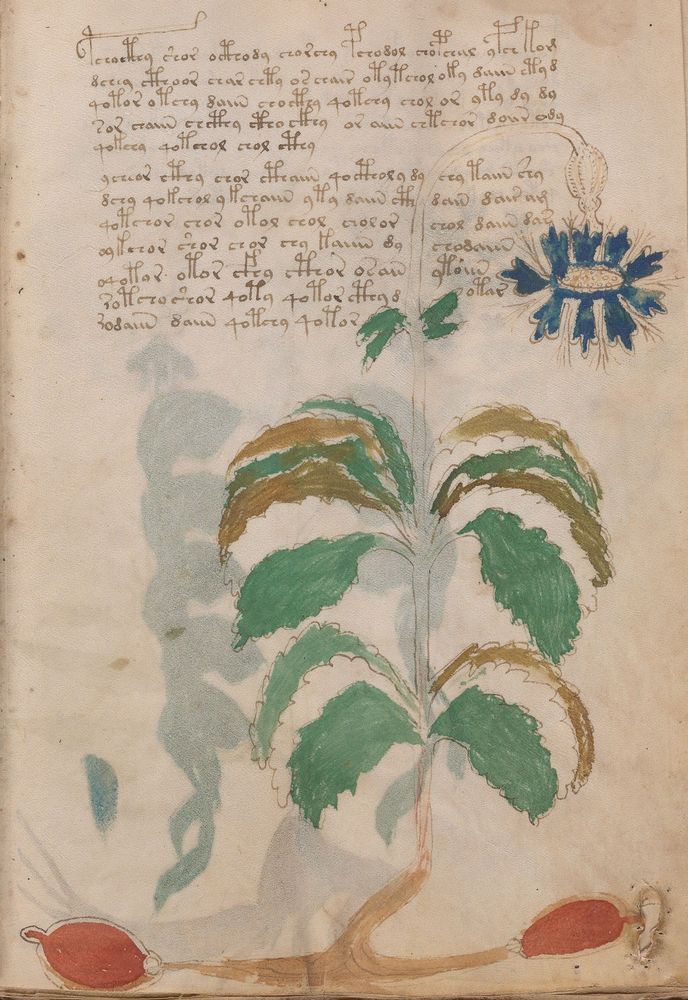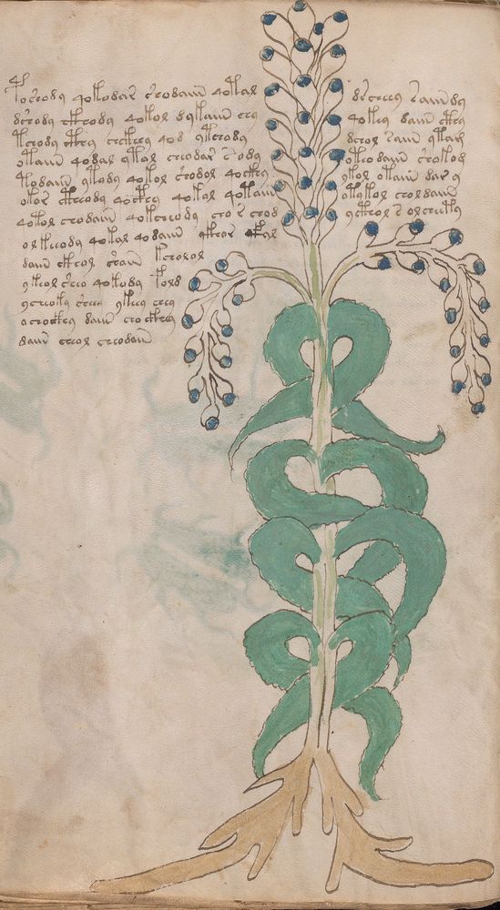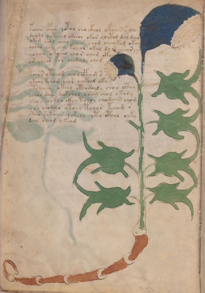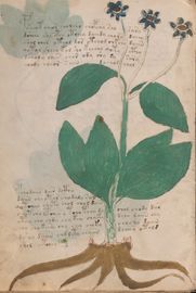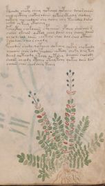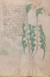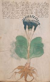 ► Le ms., qui est passé entre les mains de Dee, Rodolph II et Kircher, présente des illustrations de plantes, dont une bonne part son inconnues ainsi que des figurations astrologiques, cosmologiques et vraisemblablement alchimiques voir magiques. Certains chercheurs ont proposé que les deux derniers chapitres pourraient se référer à de la biologie ou de la balnéothérapie ainsi qu’a des recettes phytothérapiques sinon de cuisine…